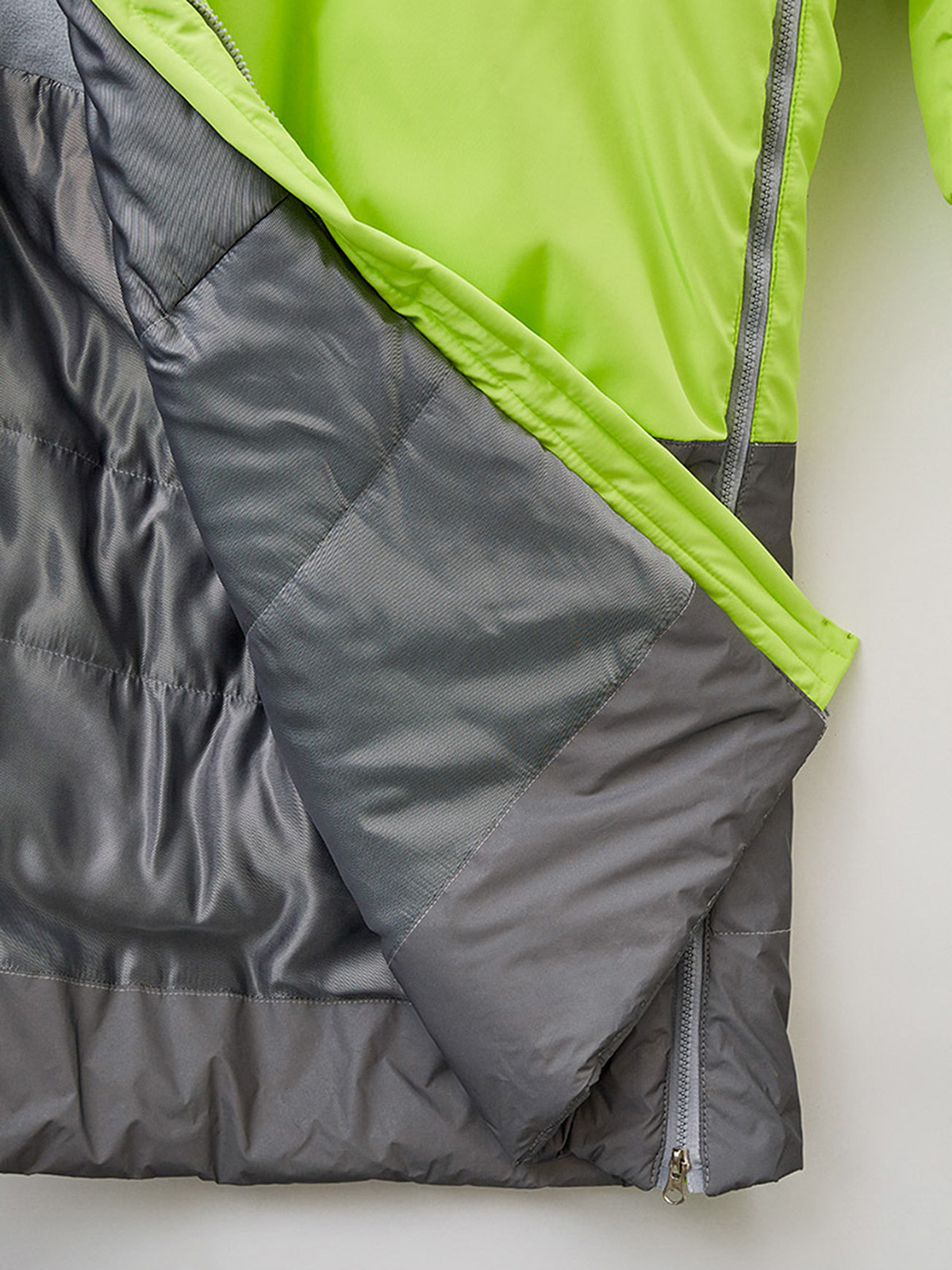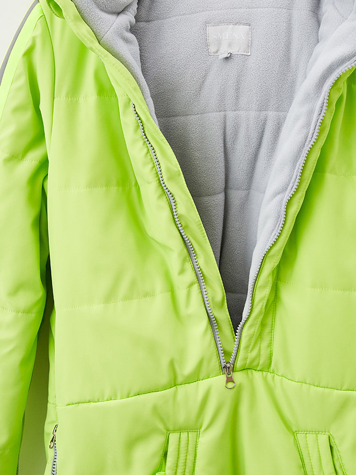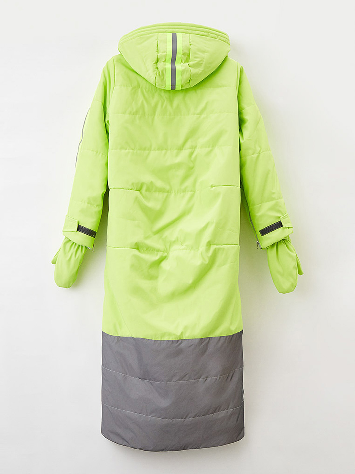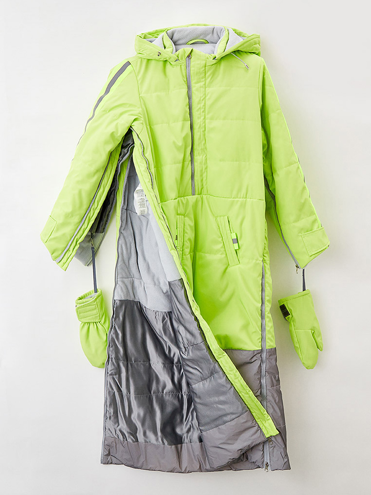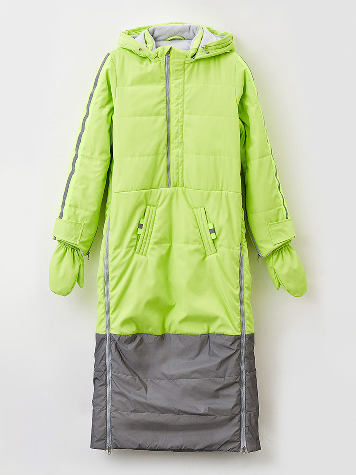 Зимнее пальто свободного силуэта из мембранной ткани на утеплителе и комбинированной подкладке. Модель имеет смещённую застёжку на молнию с планкой через воротник- стойку для удобства одевания через голову. Рукава пальто дополнены утягивающими патами на застёжках «липучки». Пальто дополнено боковыми застёжками на разъёмные молнии от низа изделия до низа рукавов, для удобства при одевании. По отлёту капюшона вставка с утяжкой на шляпную резинку с фиксаторами. Верхняя часть подкладки пальто из флиса, рукава и нижняя часть подкладки - из смесовой вискозной подкладочной ткани. Пальто дополнено теплыми рукавицами, которые пристёгиваются к внутренней части рукавов с помощью карабинов, такая комбинация не даст вам замерзнуть при любой погоде. Низ пальто выполнен из ткани со световозвращающим эффектом, что обеспечивает дополнительную безопасность и стильный вид.
