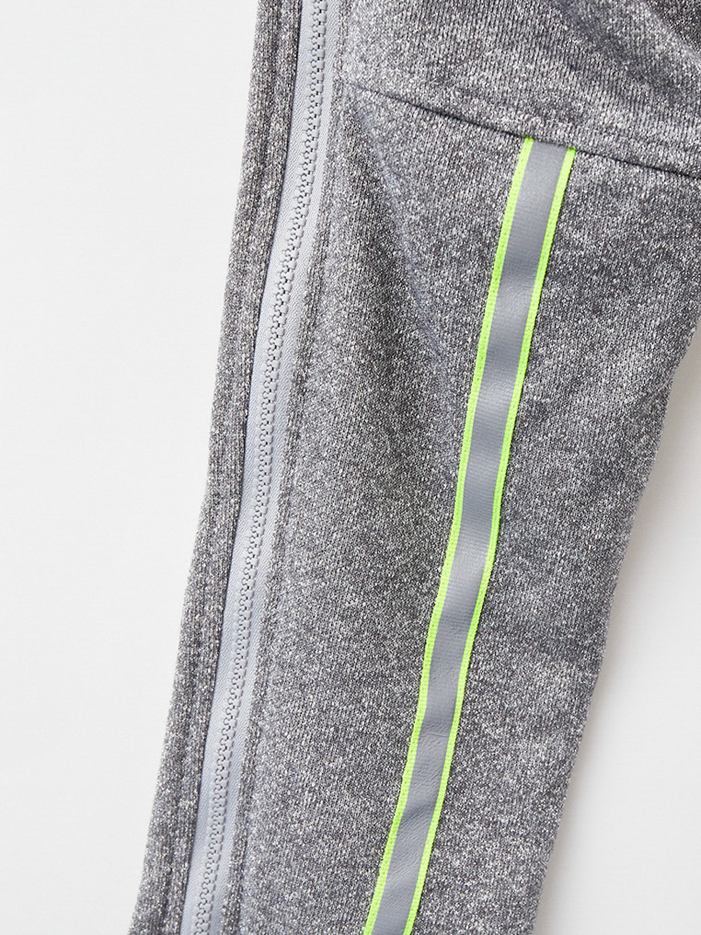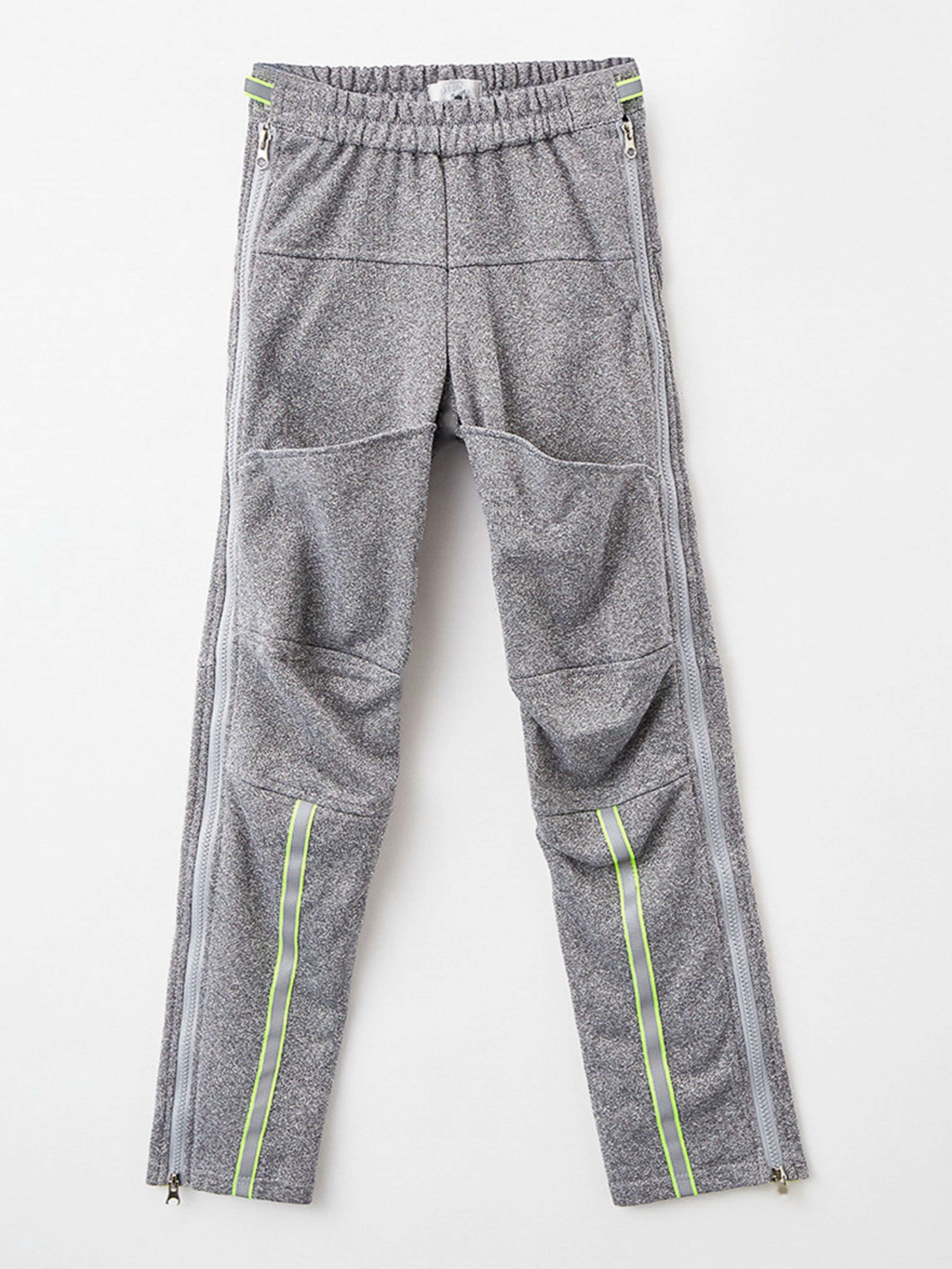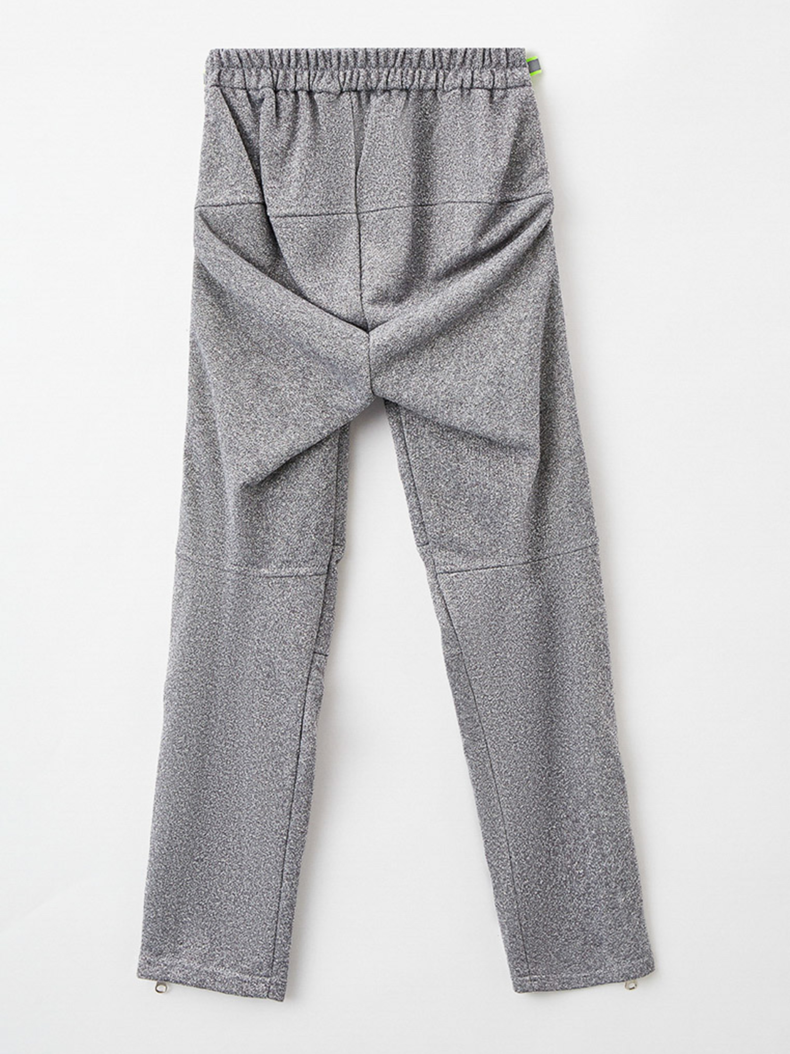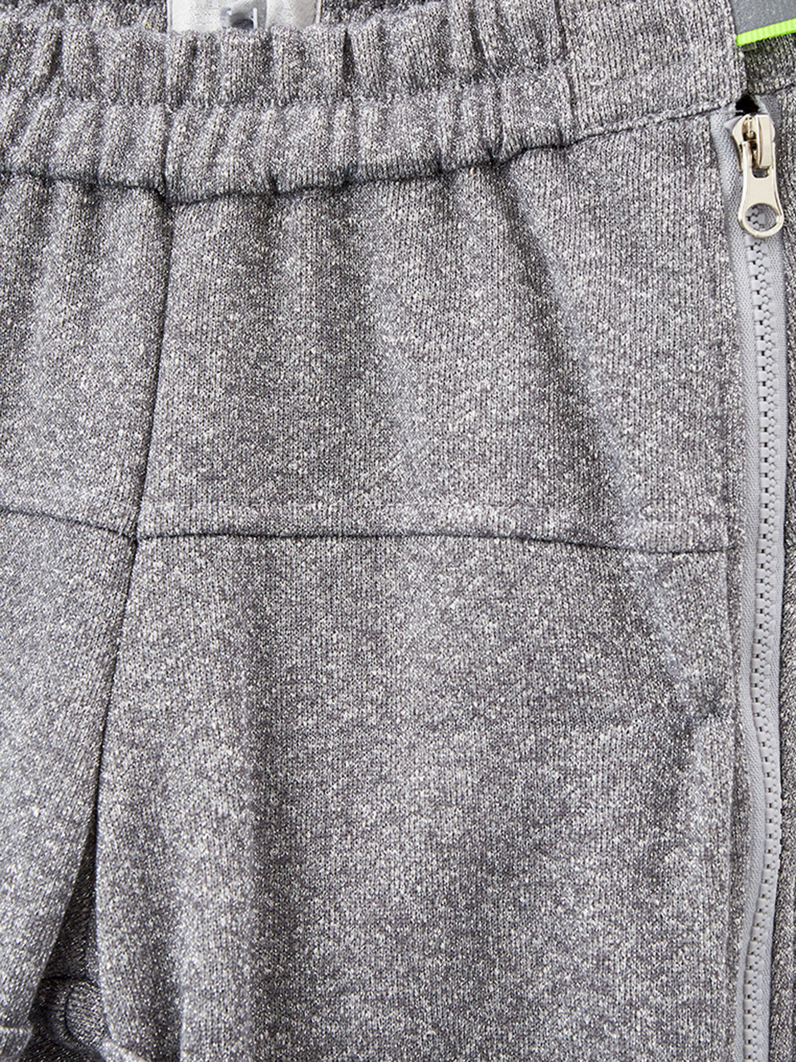 Комфортные брюки из футера, зауженные к низу. На передних половинках брюк застёжки на разъёмные молнии, смещённые в сторону боковых швов, для удобства одевания ребенка. Линия кокетки и линии имитации наколенников расположены с учетом анатомии сидящего человека. Передние половинки брюк также дополнены накладными фигурными карманами в верхнем шве от наколенников. Пояс брюк на резинке с застёжками на «липучки». Модель декорирована рефлективной тесьмой, которая послужит хорошим элементом безопасности для ребёнка.