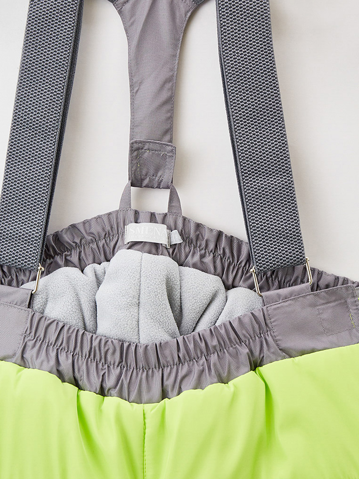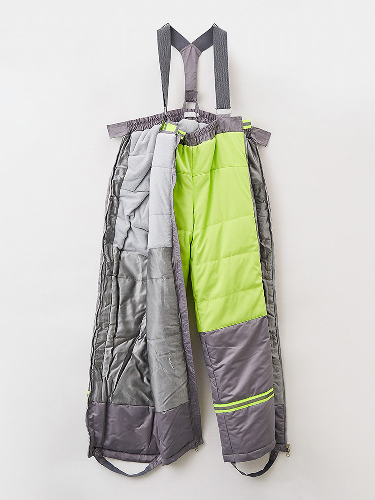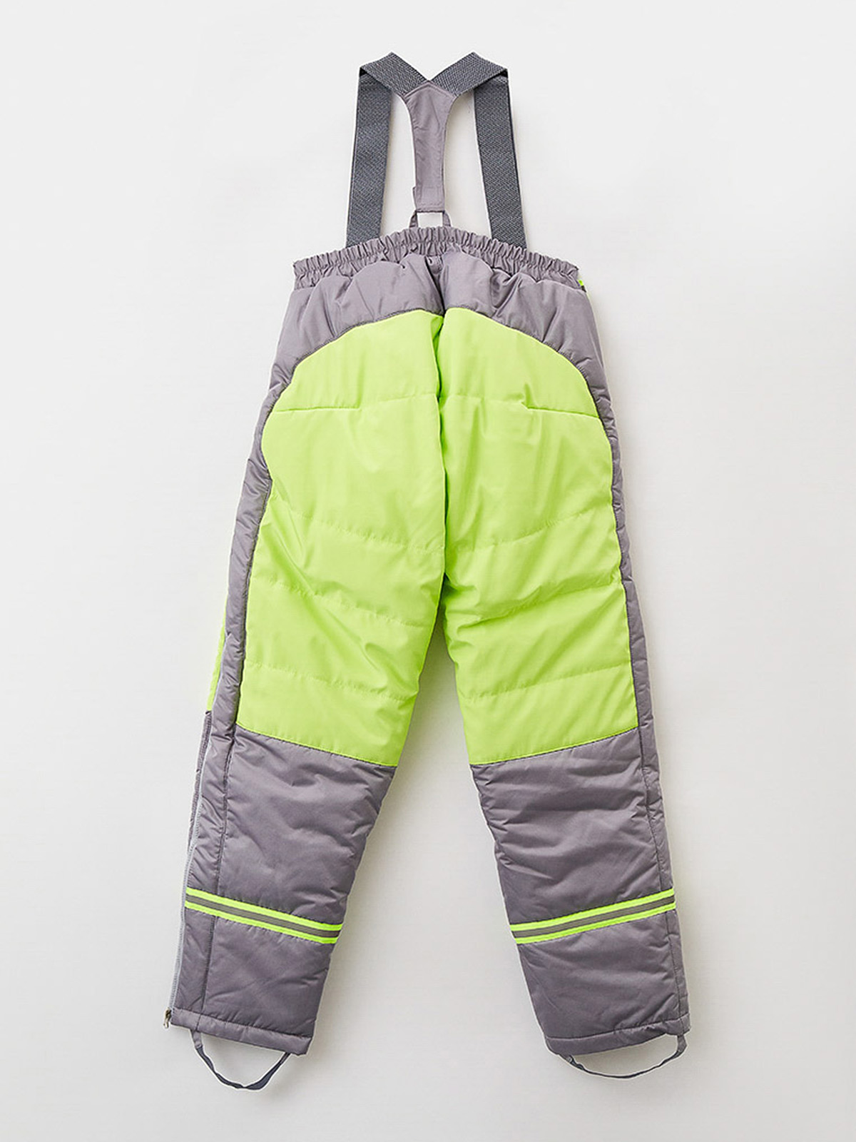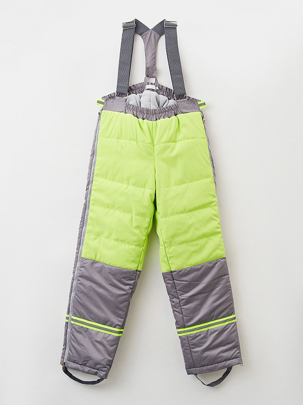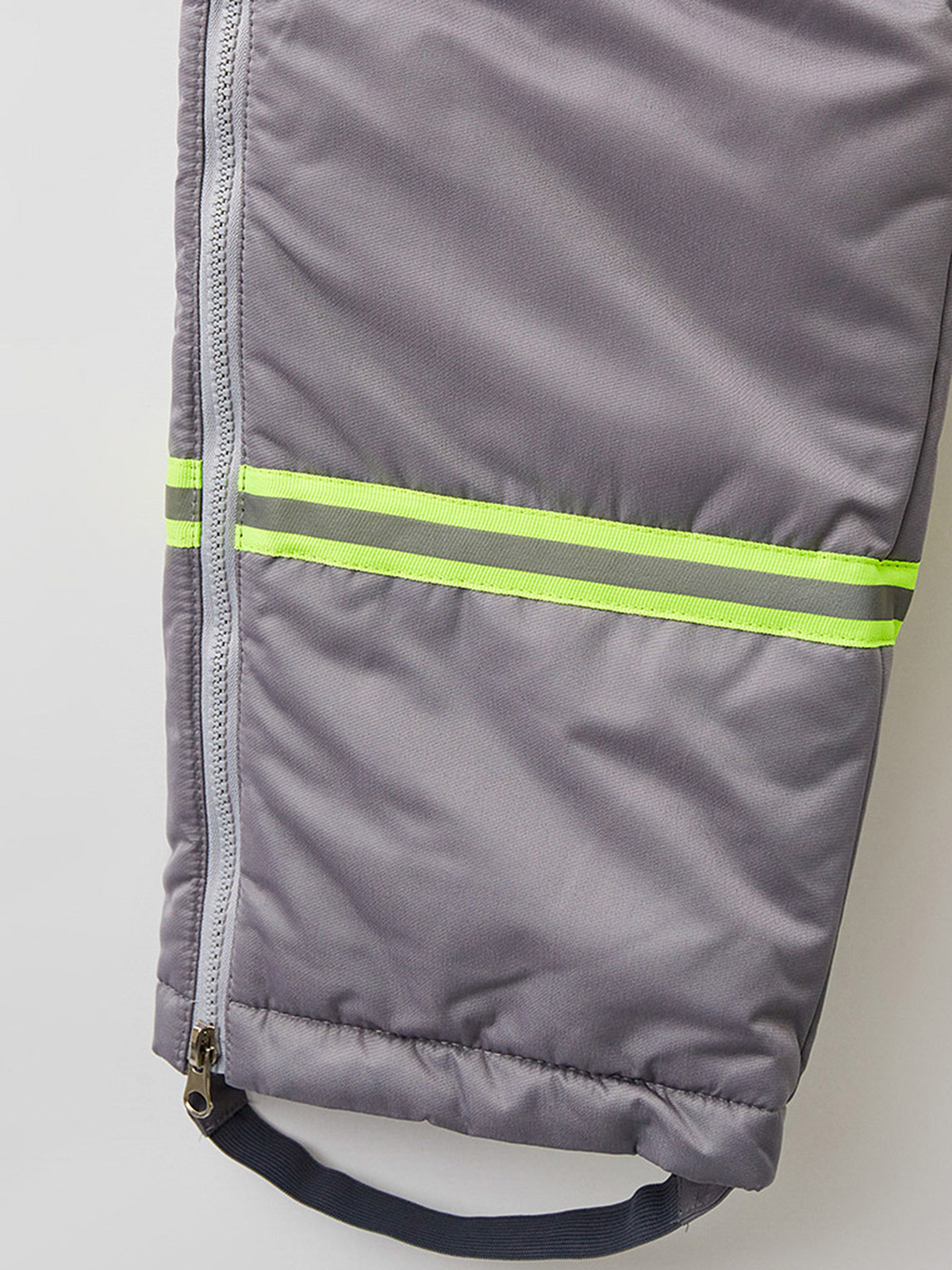 Брюки демисезонные из мембранной ткани с стёжкой и отделкой из рефлективной ткани. Верхняя часть подкладки брюк из флиса, нижняя часть из смесовой вискозной подкладочной ткани. На передних половинках брюк застёжки на разъёмные молнии, смещённые в сторону боковых швов, для удобства одевания ребенка. Пояс на резинке с застёжками на «липучки». Брюки дополнены пристёгивающимися подтяжками из декоративных резинок с регулировкой по росту, а также пристёгивающимися штрипками по низу из резинок для фиксации брюк на обуви. Брюки декорированы модной в этом сезоне отделкой из рефлективной ткани – такое решение выглядит стильно, а также послужит хорошим элементом безопасности для ребёнка.