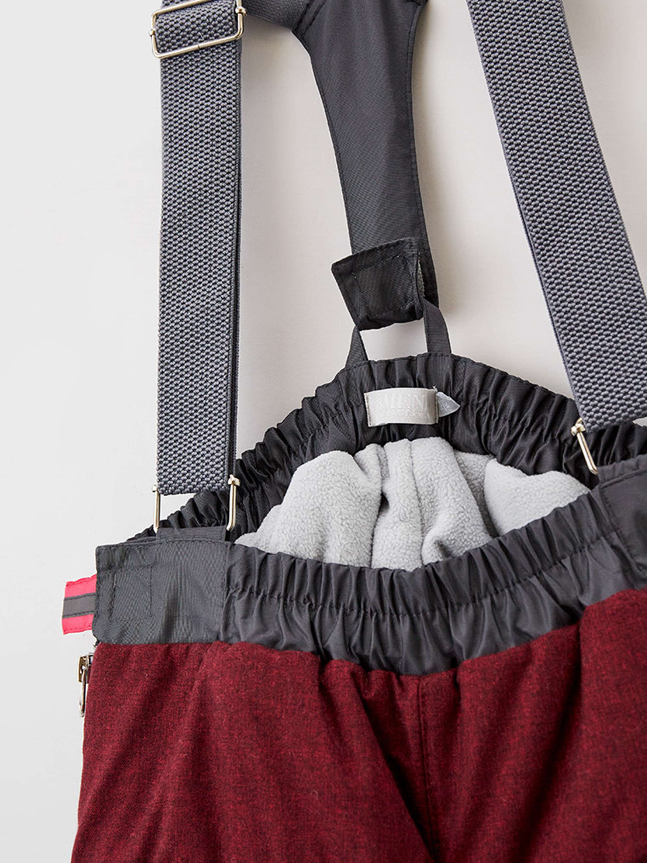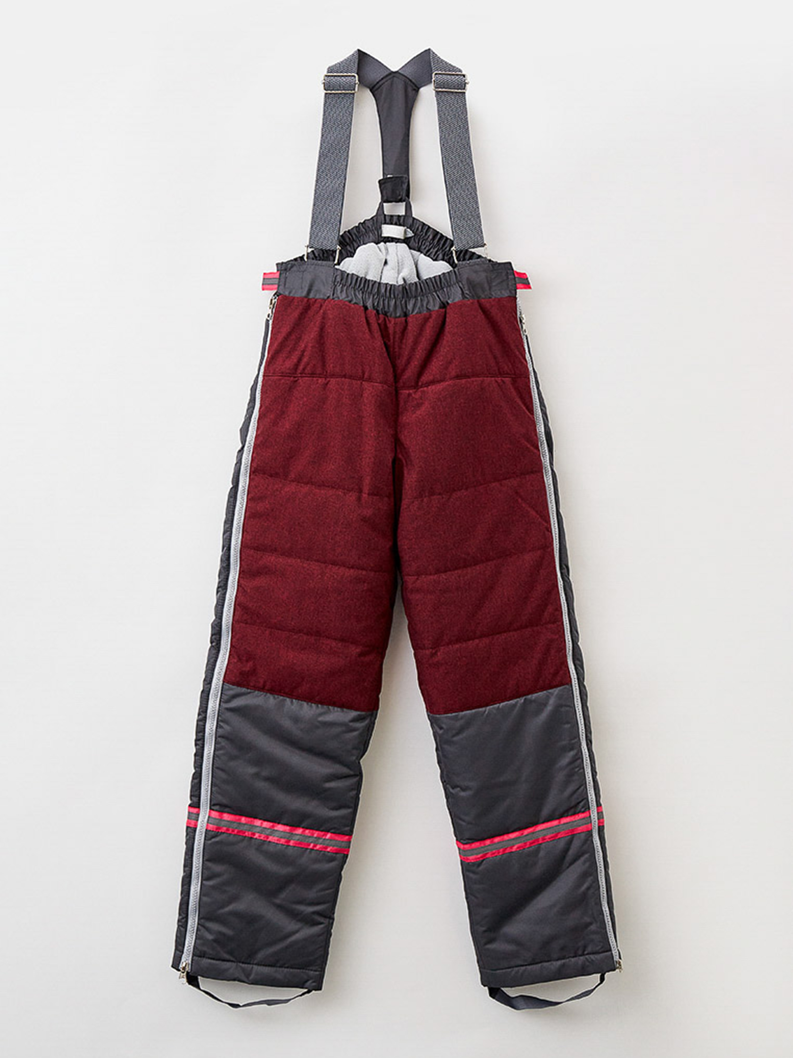 Брюки зимние из мембранной ткани с стёжкой и отделкой из рефлективной ткани. Верхняя часть подкладки брюк из флиса, нижняя часть из смесовой вискозной подкладочной ткани. На передних половинках брюк застёжки на разъёмные молнии, смещённые в сторону боковых швов, для удобства одевания ребенка. Модель адаптирована для сидячего положения за счет расположения линия кокетки и линии имитации наколенников, а также линии отреза под коленом. Пояс на резинке с застёжками на «липучки». Брюки дополнены пристёгивающимися подтяжками из декоративных резинок с регулировкой по росту, а также пристёгивающимися штрипками по низу из резинок для фиксации брюк на обуви. Брюки декорированы модной в этом сезоне отделкой из рефлективной ткани – такое решение выглядит стильно, а также послужит хорошим элементом безопасности для ребёнка.