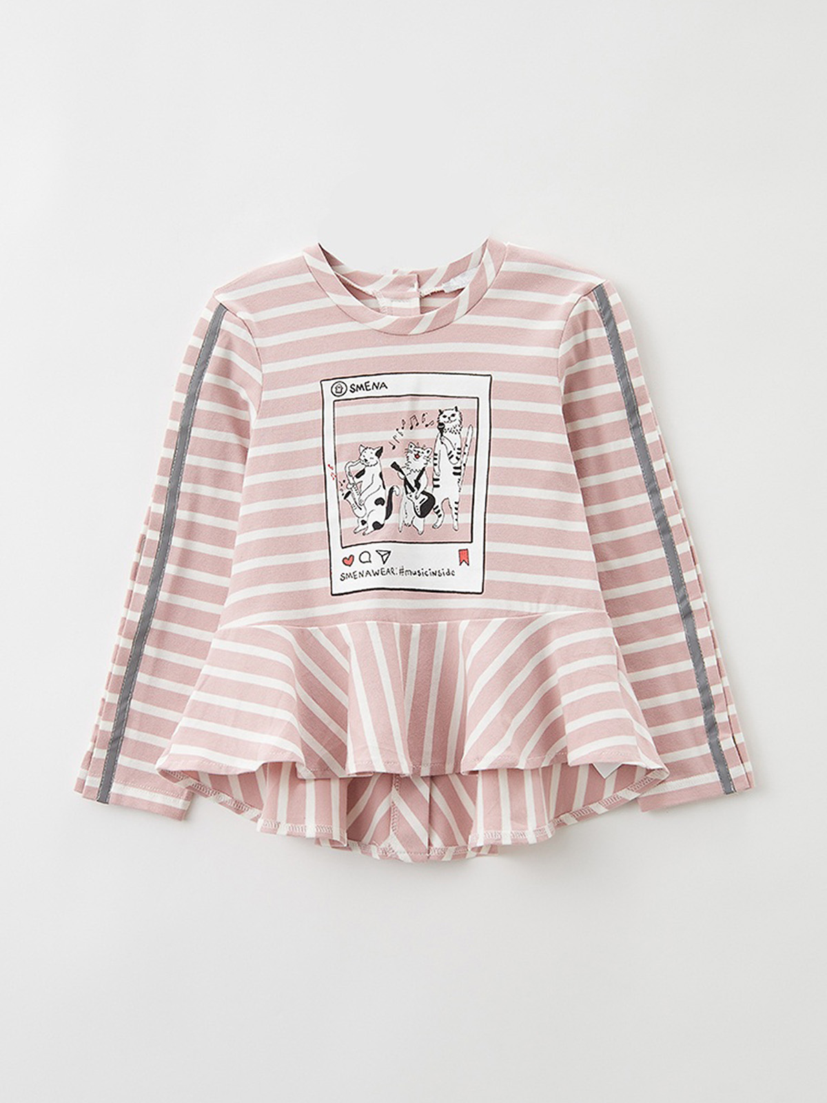 Лонгслив из кулирной глади. Материал изделия хорошо пропускает воздух и отводит влагу за счет повышенного содержания хлопка. Спинка и рукава распашные с застежкой на «липучки» для удобства одевания ребёнка. Рукава декорированы рефлективной тесьмой, которая обеспечивает безопасность ребенка. На переде изделия стильный принт, отлично дополняющий изделие. Конструкция адаптирована для сидячего положения. Романтичный вид модели придаёт баска-солнце с удлинением по спинке, что обеспечивает эстетичный вид в сидячем положении, чтобы изделие не затягивало, и не образовывались складки.