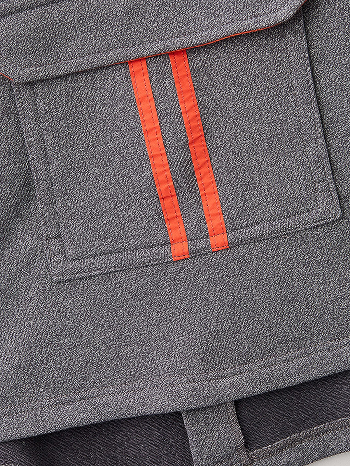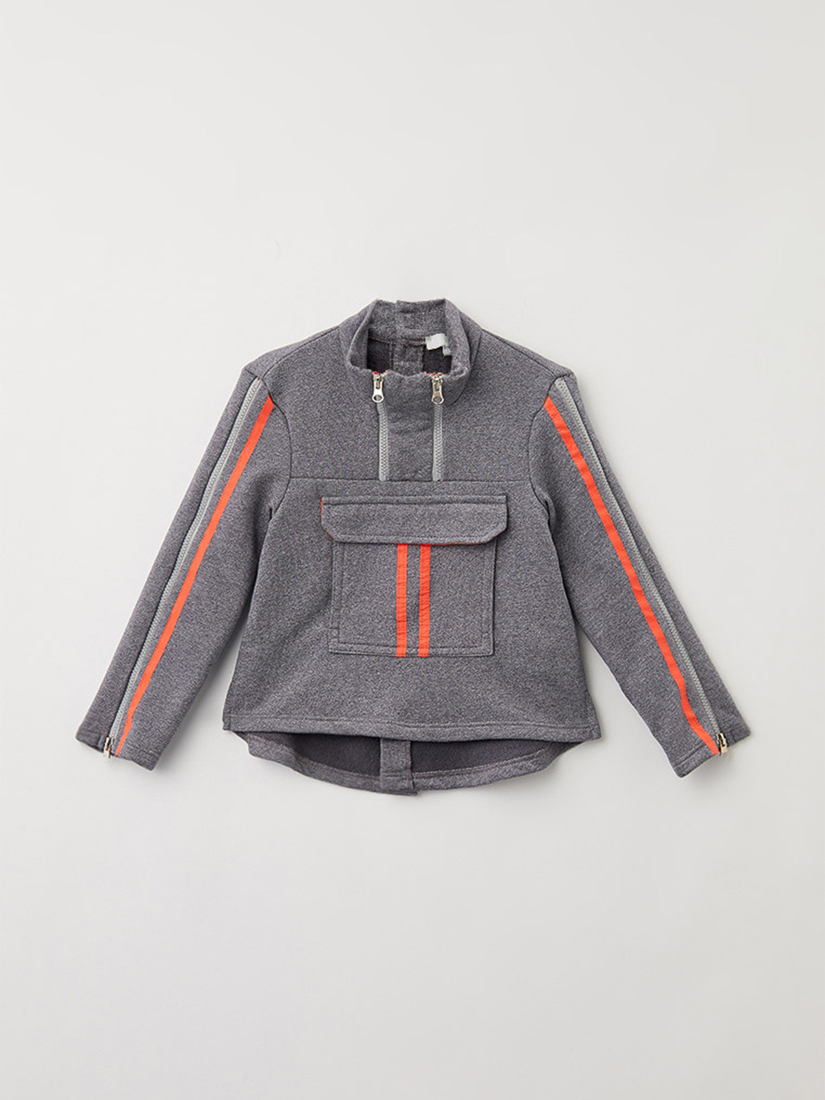 Стильный анорак из футера свободного силуэта. Конструкция адаптирована для сидячего положения: передняя часть изделия короче обычной с разрезами, которые обеспечивают эстетичный вид, чтобы изделие не затягивало, и не образовывались складки. Спинка, удлинённая до линии сидения, распашная для удобства одевания ребенка с застёжками на «липучки». Рукава расстегиваются для удобства надевания при спастике рук. Анорак дополнен большим карманом "кенгуру" на переде изделия и отделкой рефлективными тесьмами, что обеспечивает дополнительную безопасность и современный вид.