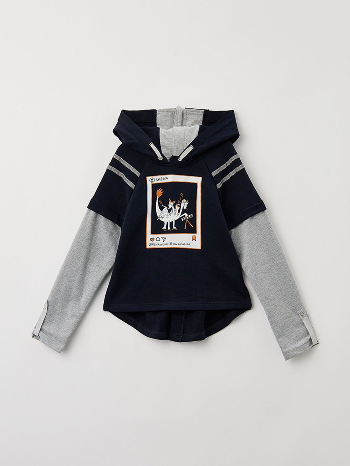 Модная толстовка-трансформер из футера свободного силуэта. Конструкция адаптирована для сидячего положения: передняя часть изделия короче обычной с разрезами, которые обеспечивают эстетичный вид в сидячем положении, чтобы изделие не затягивало, и не образовывались складки. Спинка, удлинённая до линии сидения, распашная для удобства одевания ребенка с застёжками на «липучки». Верхние части рукавов с застёжками на разъёмные молнии для удобства надевания при спастике рук, декорированы рефлективной тесьмой. Нижние удлинённые части рукавов с функцией митенок и отверстиями для больших пальцев, подворачиваются и фиксируются на паты из рефлективной тесьмы. На переде стильный принт, отлично дополняющий изделие.