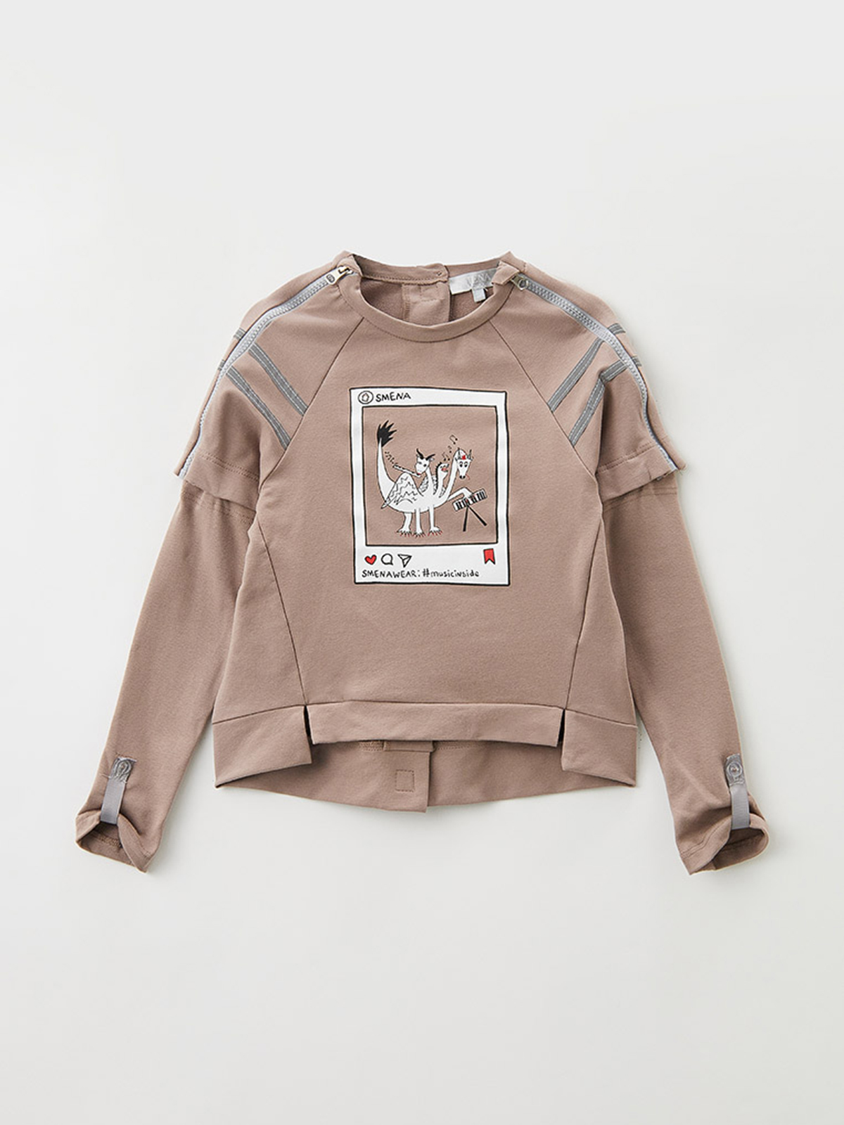 Модная толстовка-трансформер из футера свободного силуэта. Конструкция адаптирована для сидячего положения: передняя часть изделия короче обычной с разрезами, которые обеспечивают эстетичный вид в сидячем положении, чтобы изделие не затягивало, и не образовывались складки. Спинка, удлинённая до линии сидения, распашная для удобства одевания ребенка с застёжками на «липучки». Верхние части рукавов с застёжками на разъёмные молнии для удобства надевания при спастике рук, декорированы рефлективной тесьмой. Нижние удлинённые части рукавов с функцией митенок и отверстиями для больших пальцев, подворачиваются и фиксируются на паты из рефлективной тесьмы. На переде стильный принт, отлично дополняющий изделие.