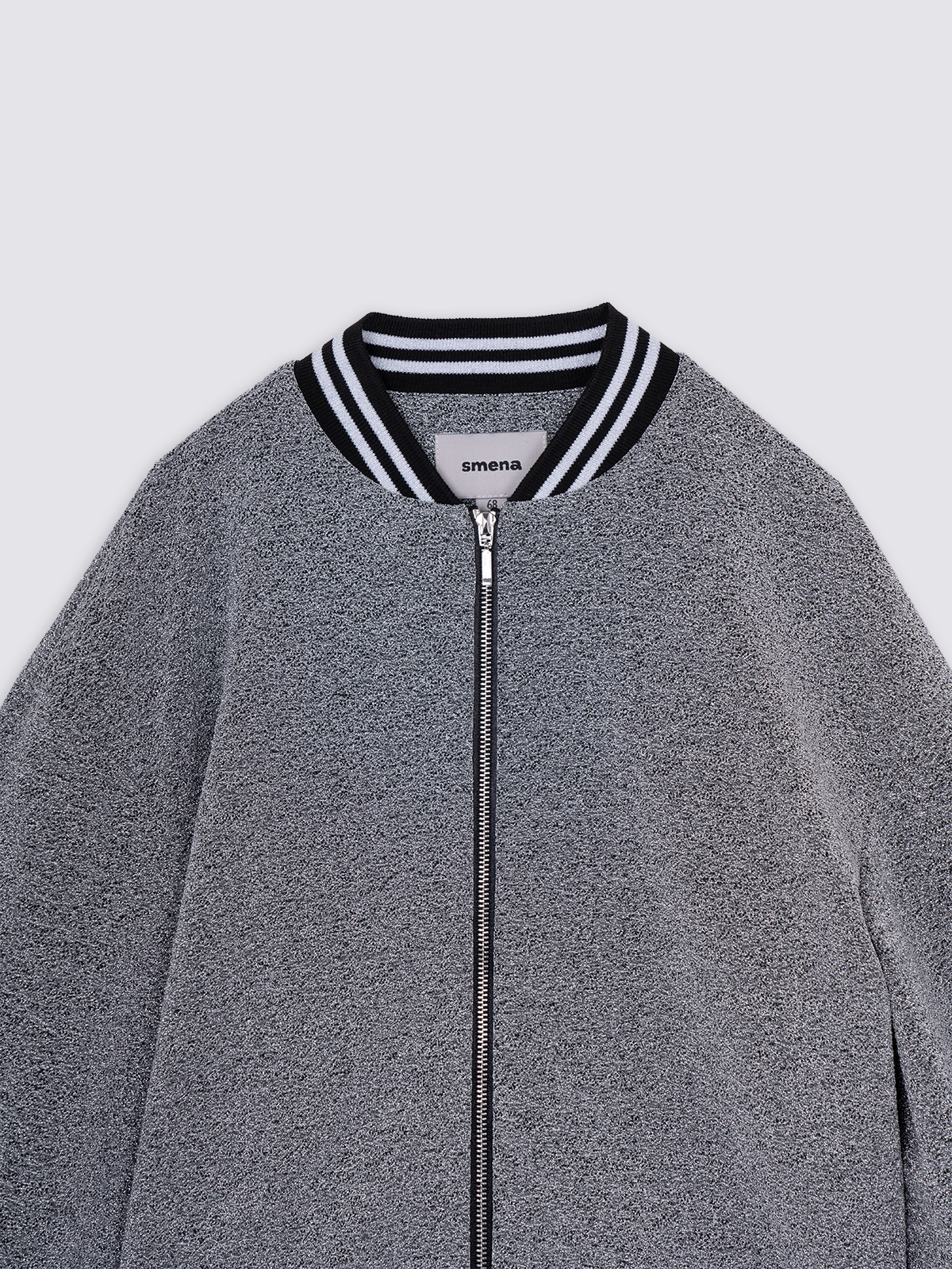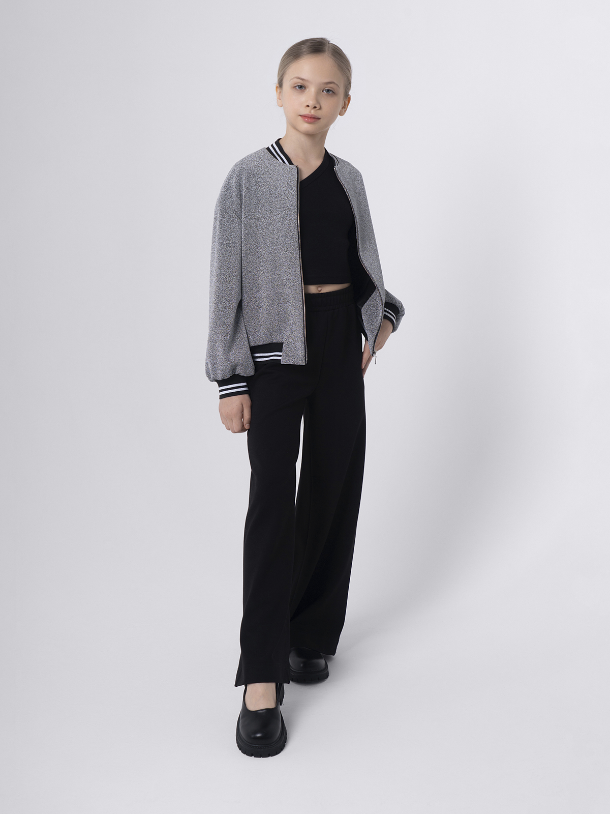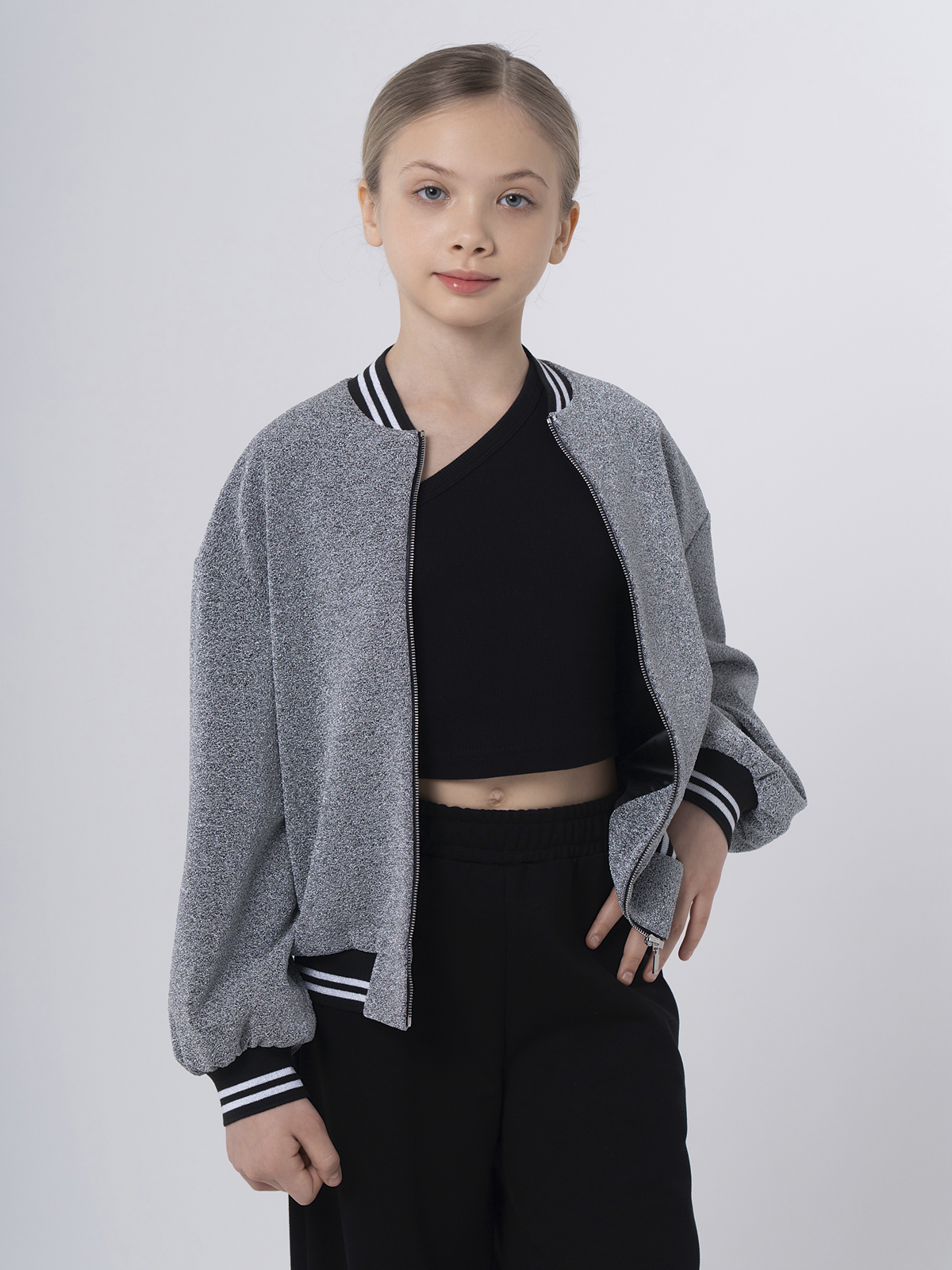 Бомбер для девочки свободного силуэта со спущенной линией плеча. Выполнен из трикотажа. Застежка прямая на молнию. Манжет и воротник в тон изделия с контрастными полосками.