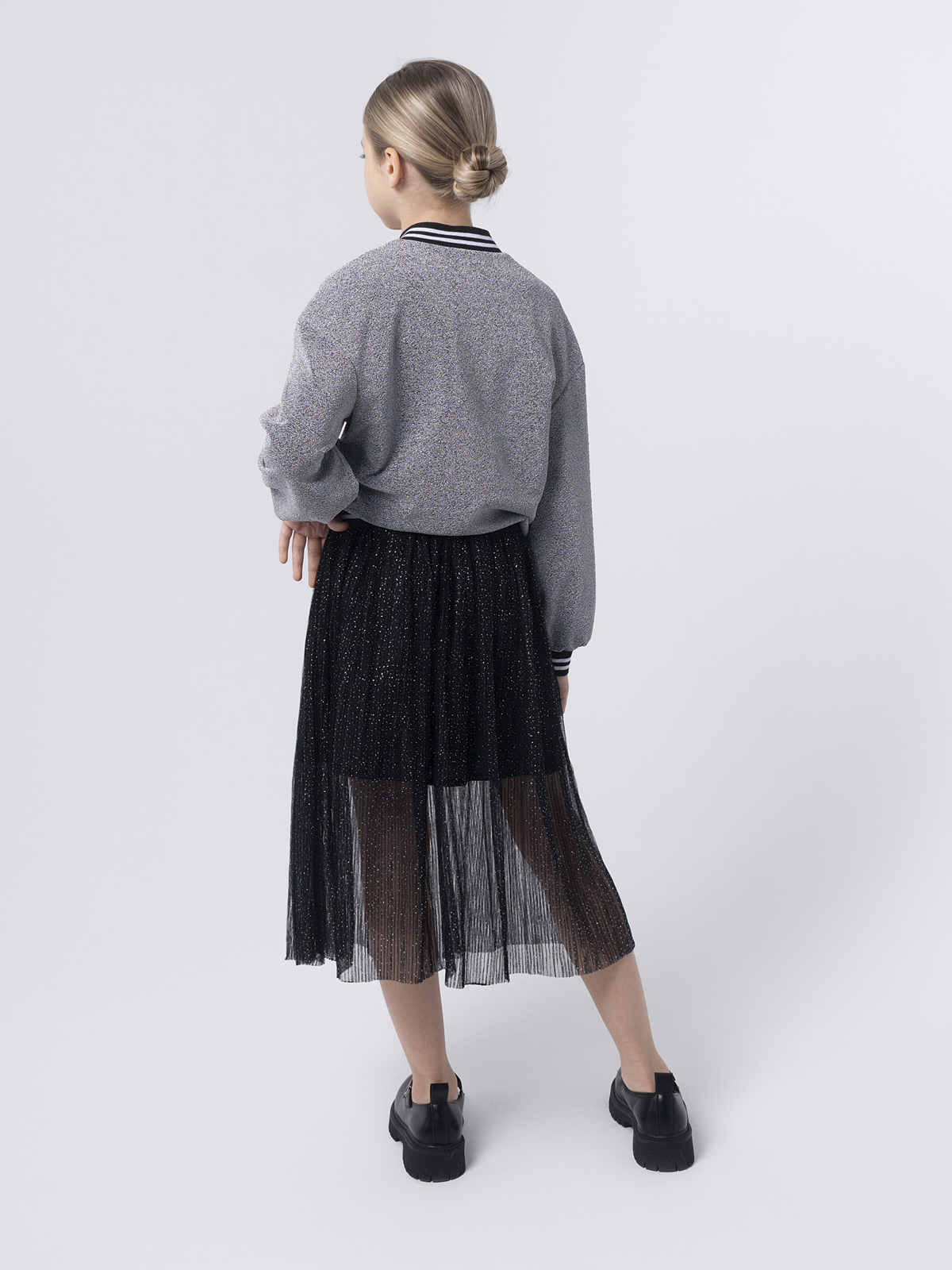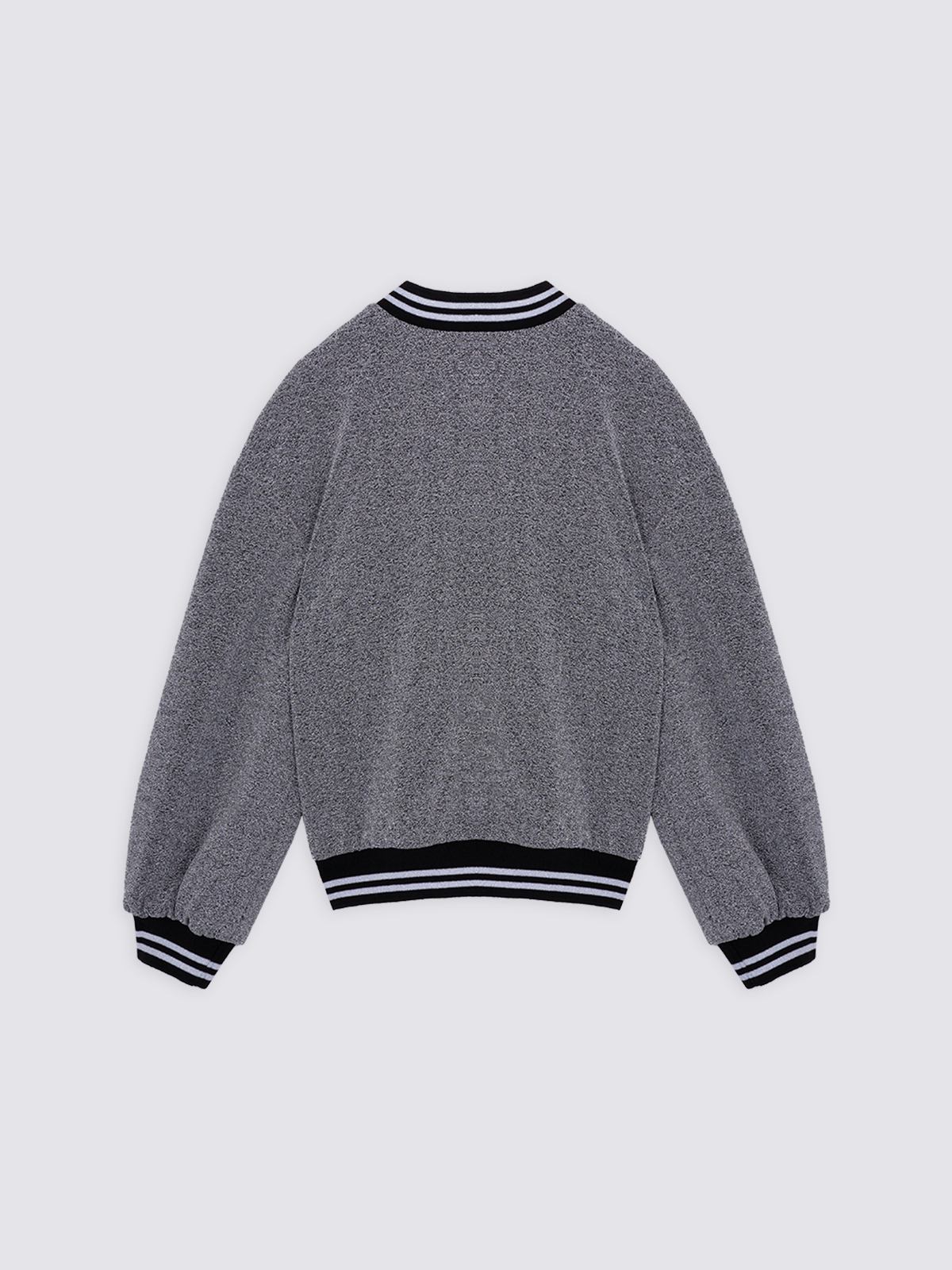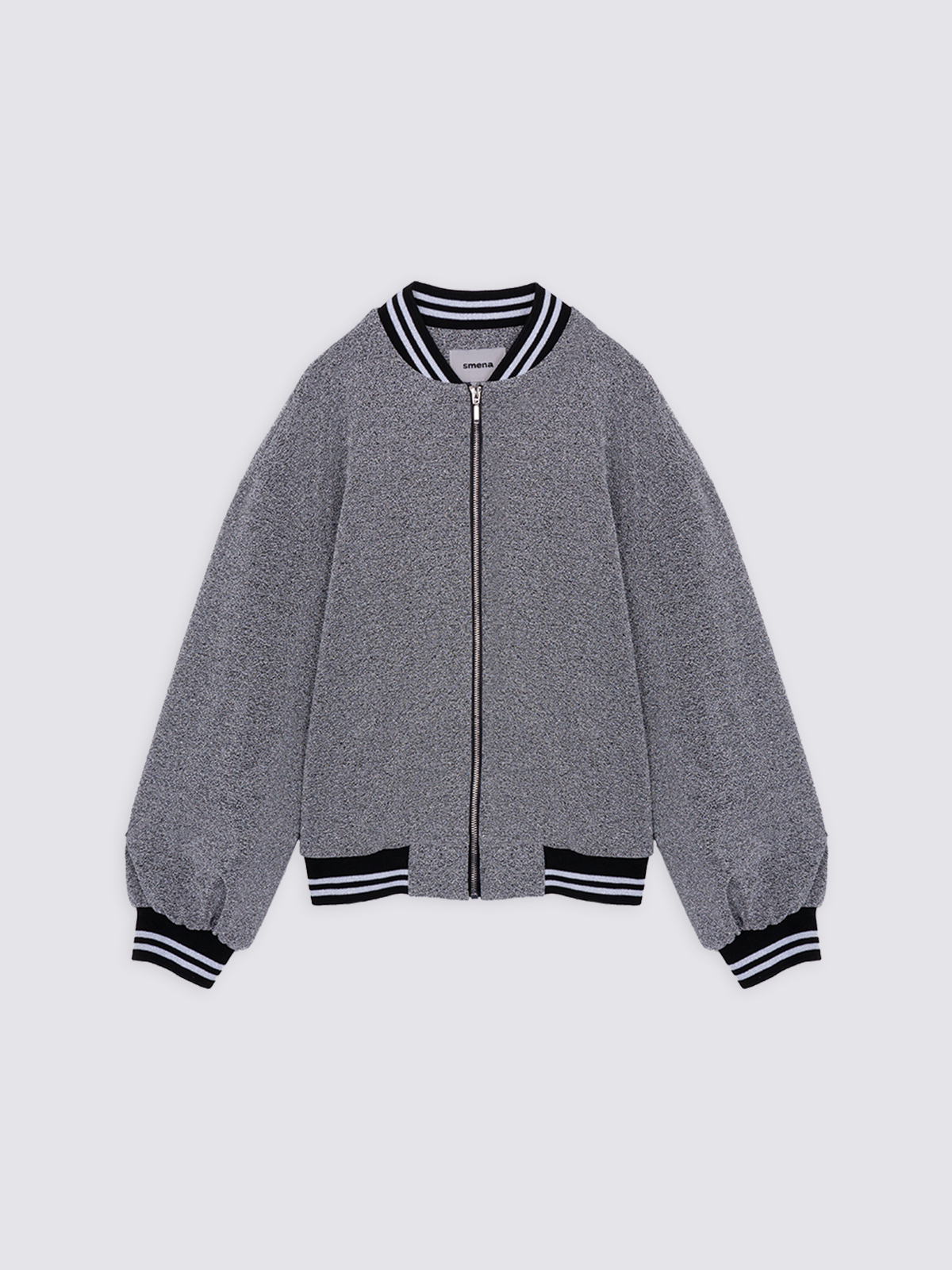 Бомбер для девочки свободного силуэта со спущенной линией плеча. Выполнен из трикотажа. Застежка прямая на молнию. Манжет и воротник в тон изделия с контрастными полосками.