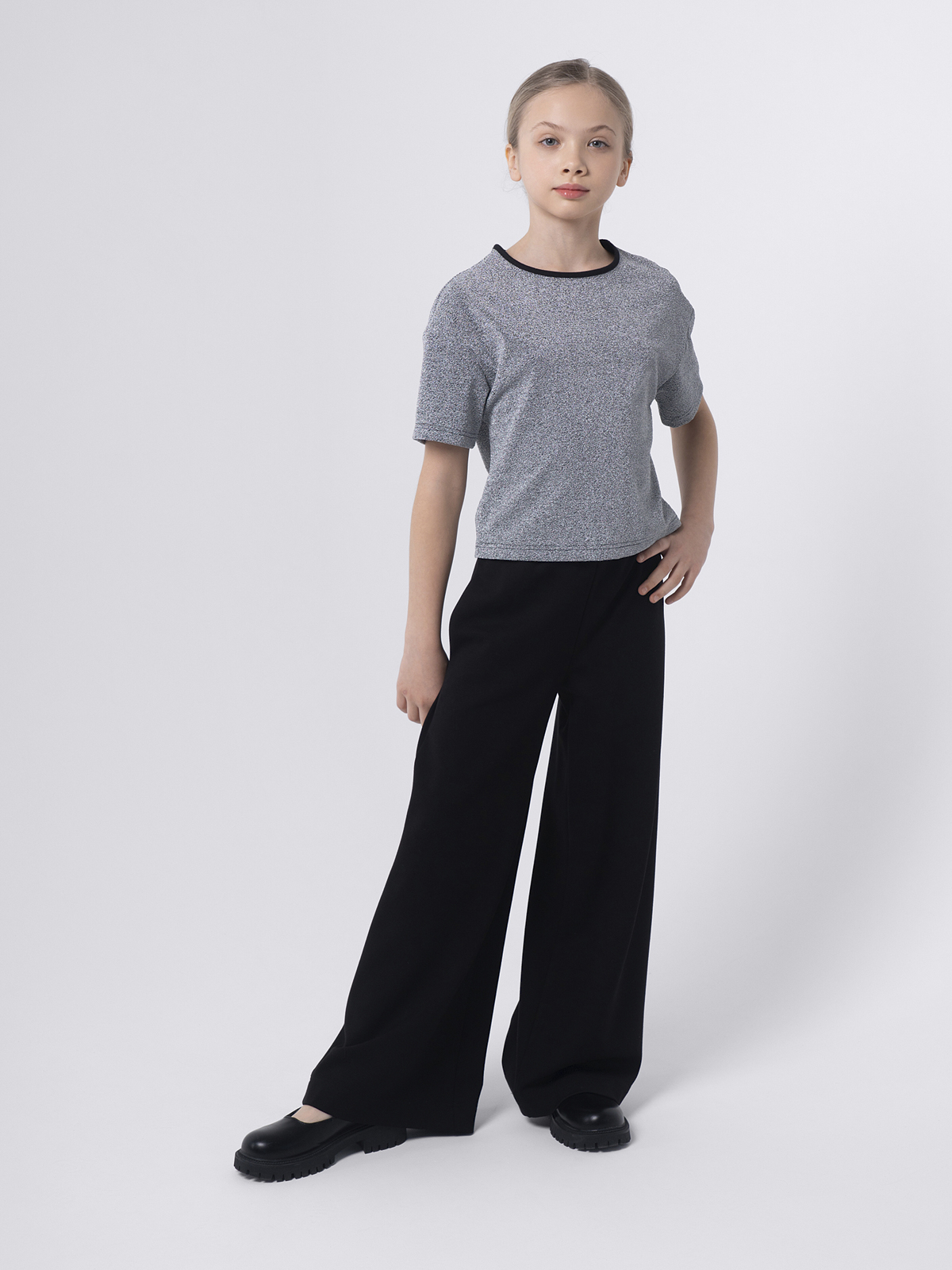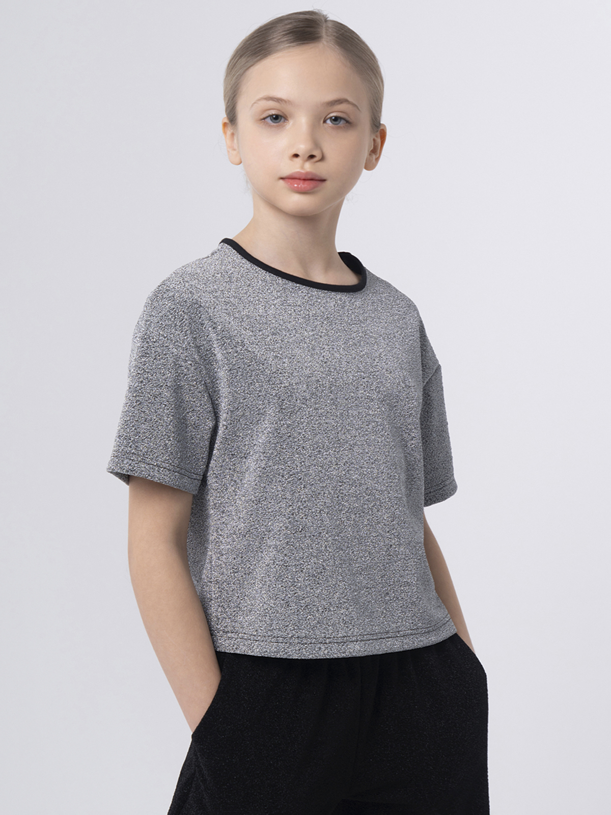 Стильная укороченная футболка из серебристой мерцающей ткани станет ярким акцентом в образе. Контрастная горловина добавляет современный спортивный штрих и подчёркивает дизайн.