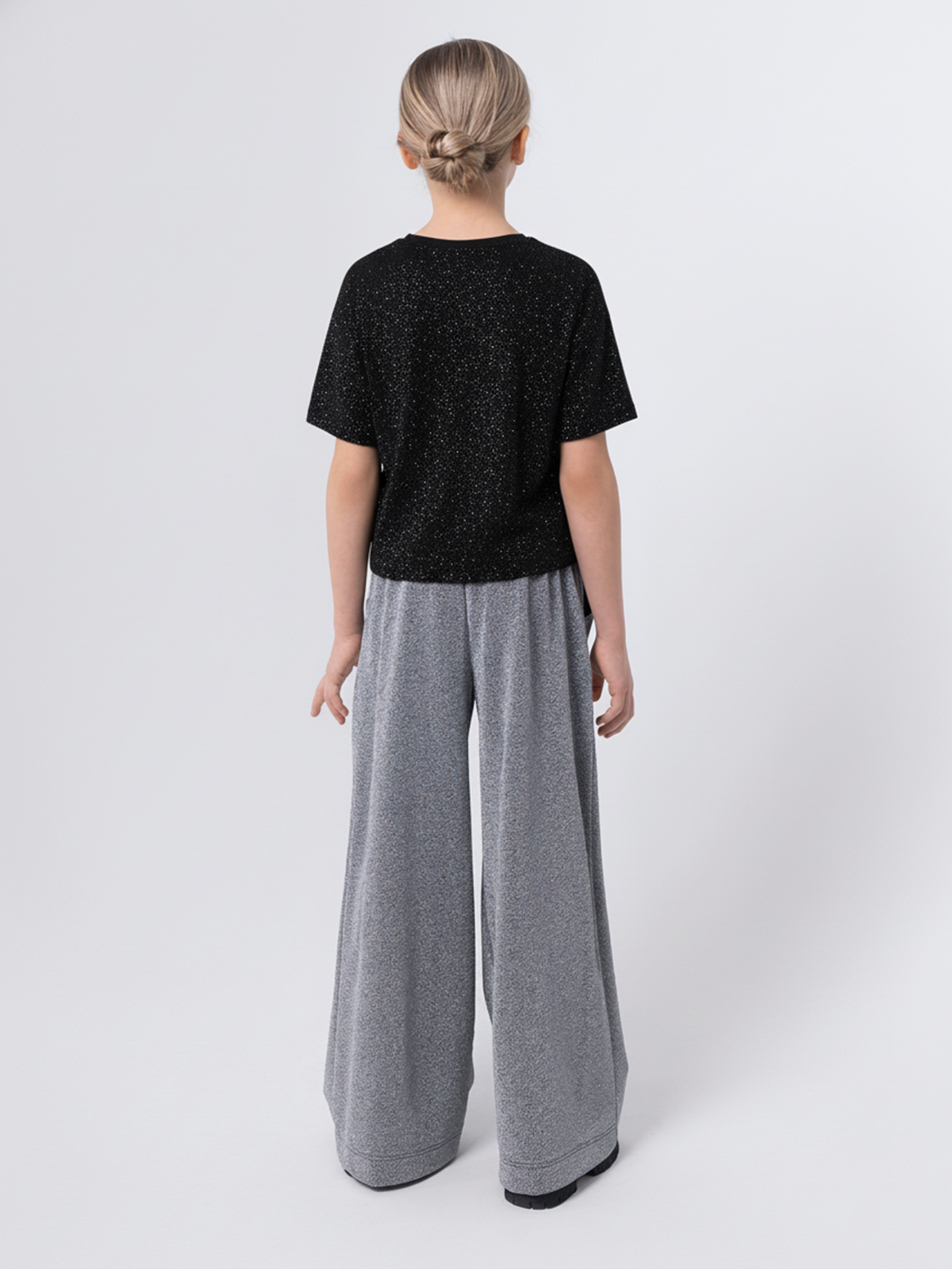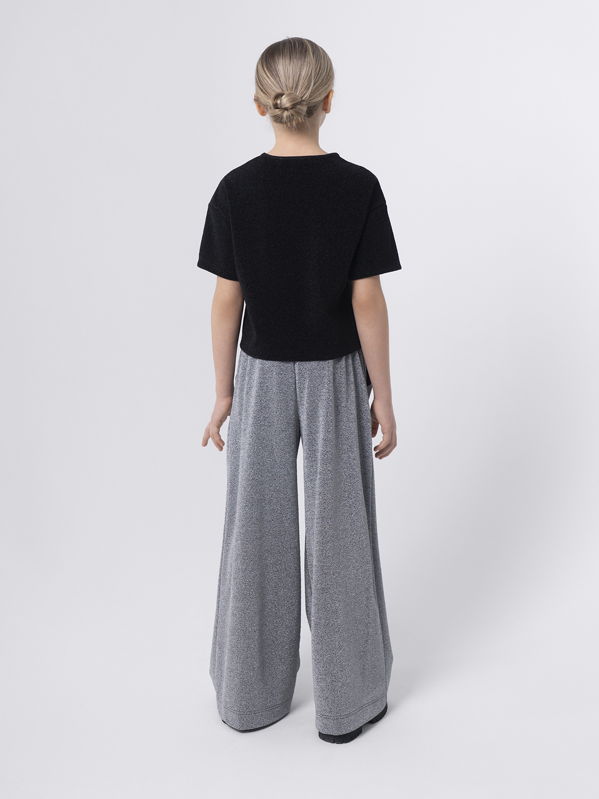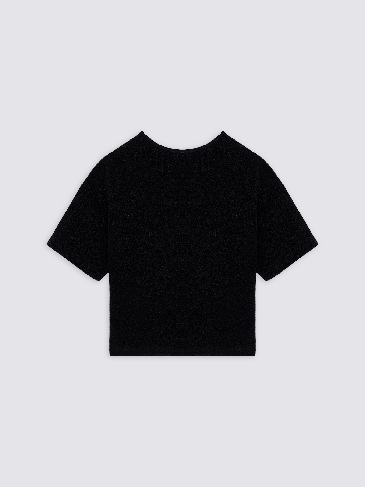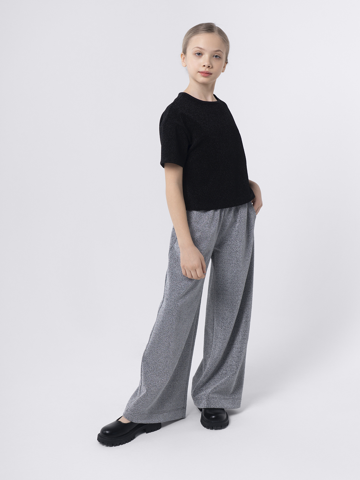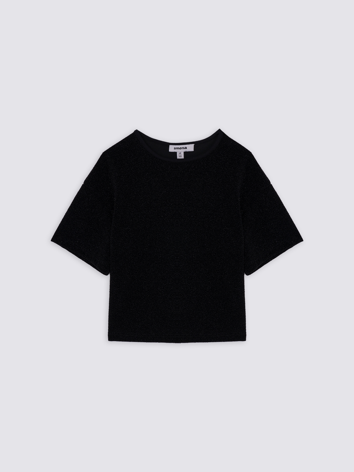 Модная укороченная футболка из чёрной мерцающей ткани — стильный выбор для особых случаев и повседневных образов. Лаконичный крой подчёркивает силуэт, а лёгкий блеск материала добавляет нарядности.