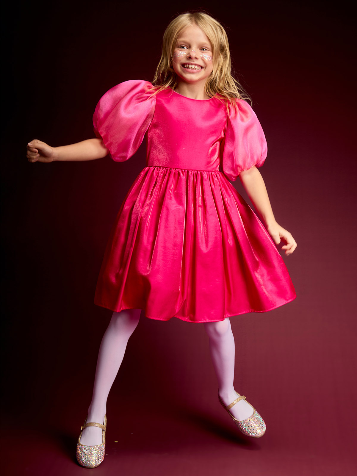 Силуэт и крой: оверсайз с пышной юбкой и объёмными короткими рукавами, создающими эффектное и торжественное звучание образа.