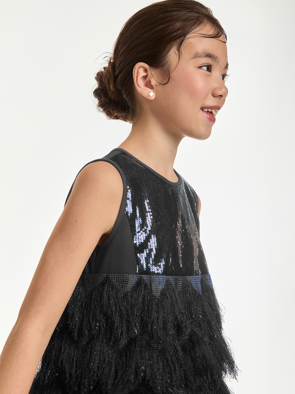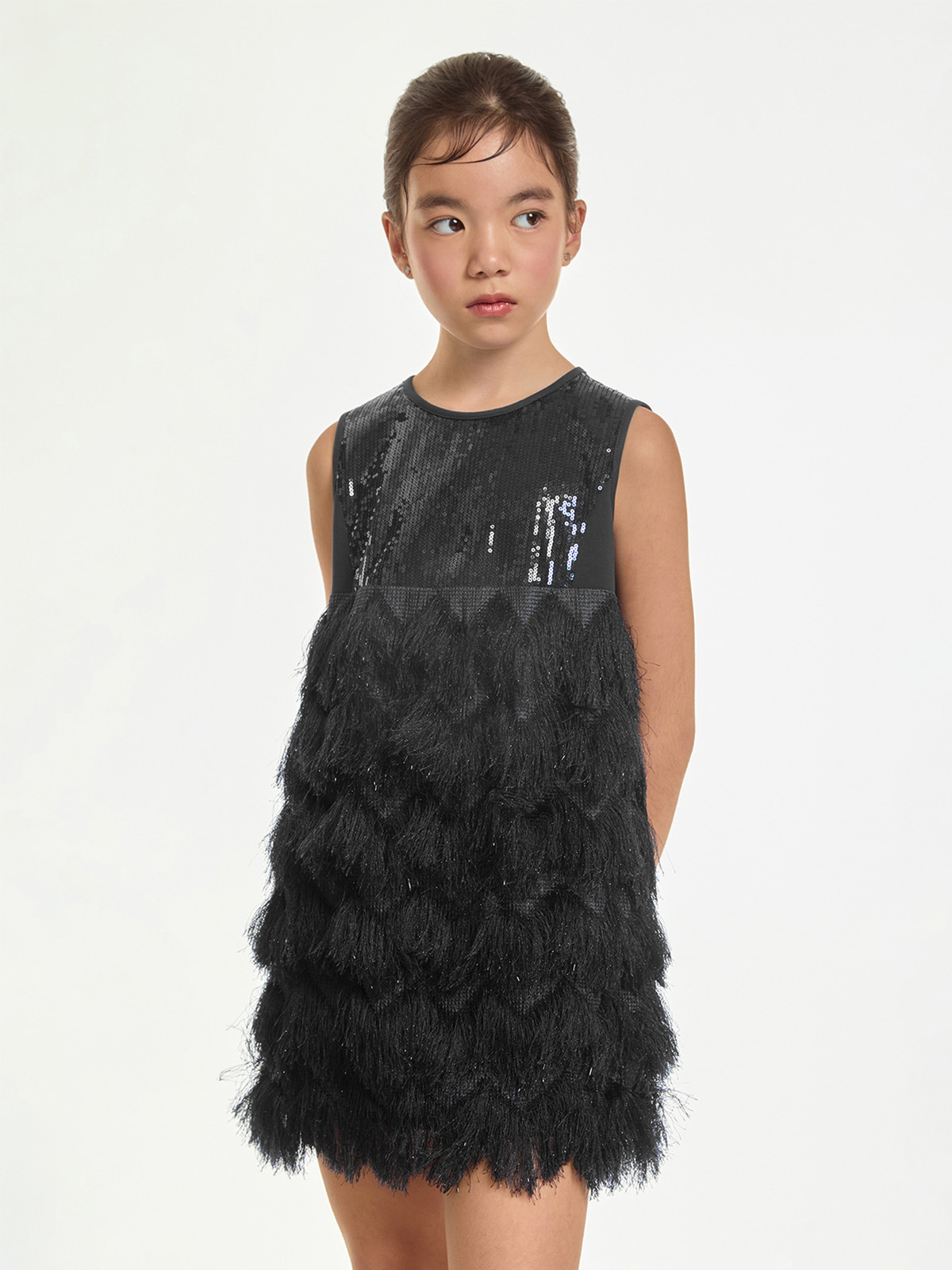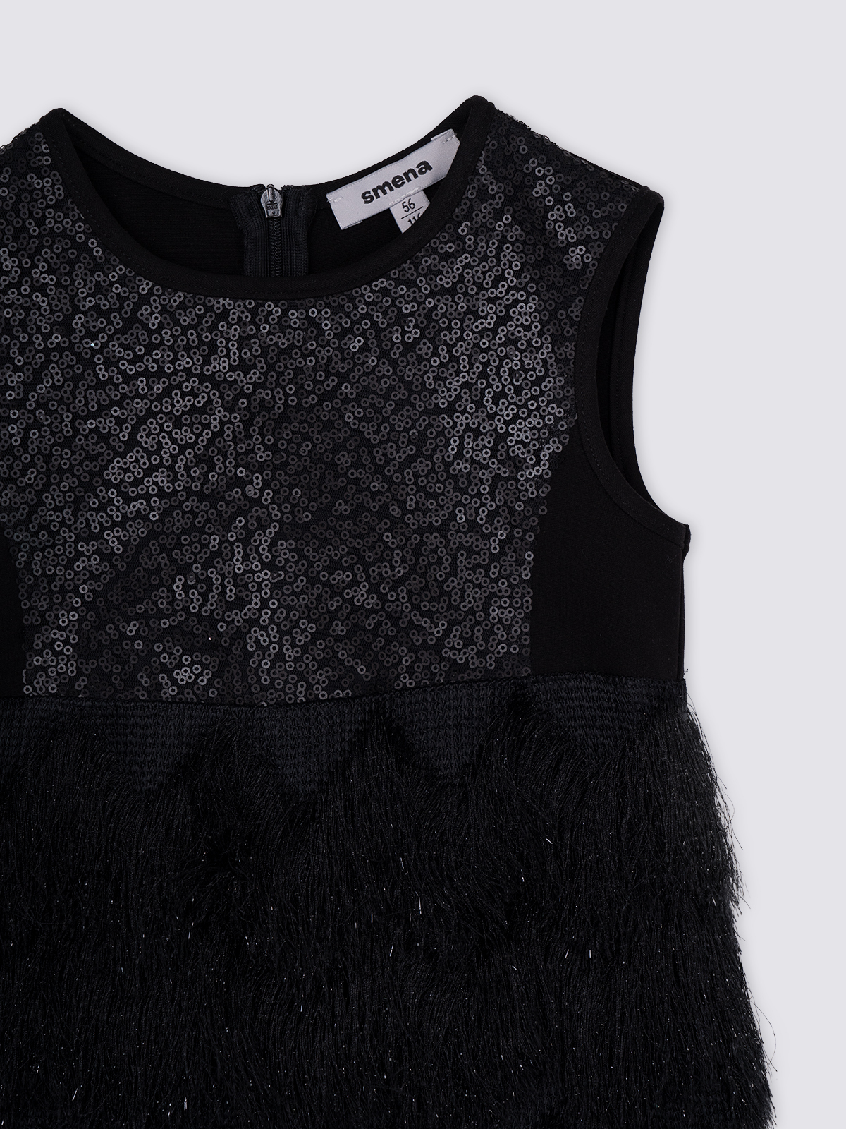 Платье с Высокой линией талии без рукавов. Верх трикотажного лифа украшают блестящие пайетки. Лиф облегает фигуру, создавая полуприталенный силуэт, который плавно расширяется к низу. Особенного внимания заслуживает юбка: она выполнена из ткани с длинным ворсом. Такой материал придаёт изделию дополнительную фактурность и необычность. Для обеспечения комфорта внутренняя часть юбки имеет приятную на ощупь подкладку из хлопка.