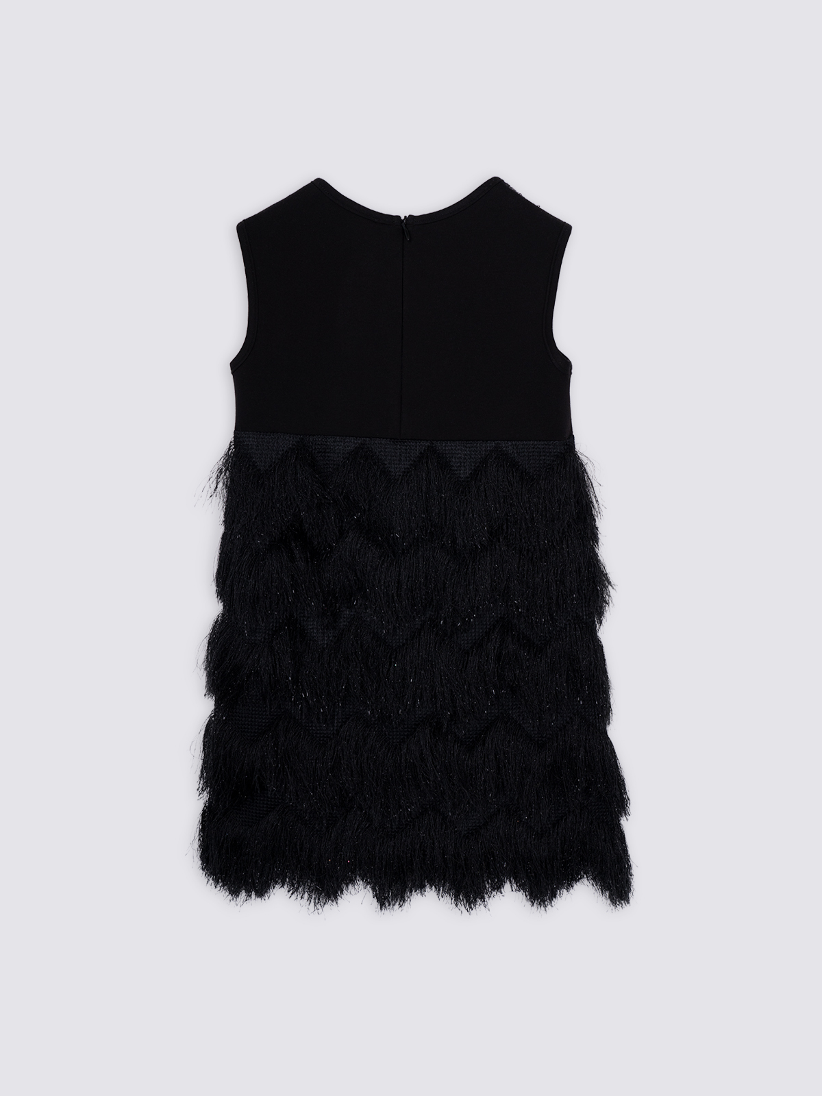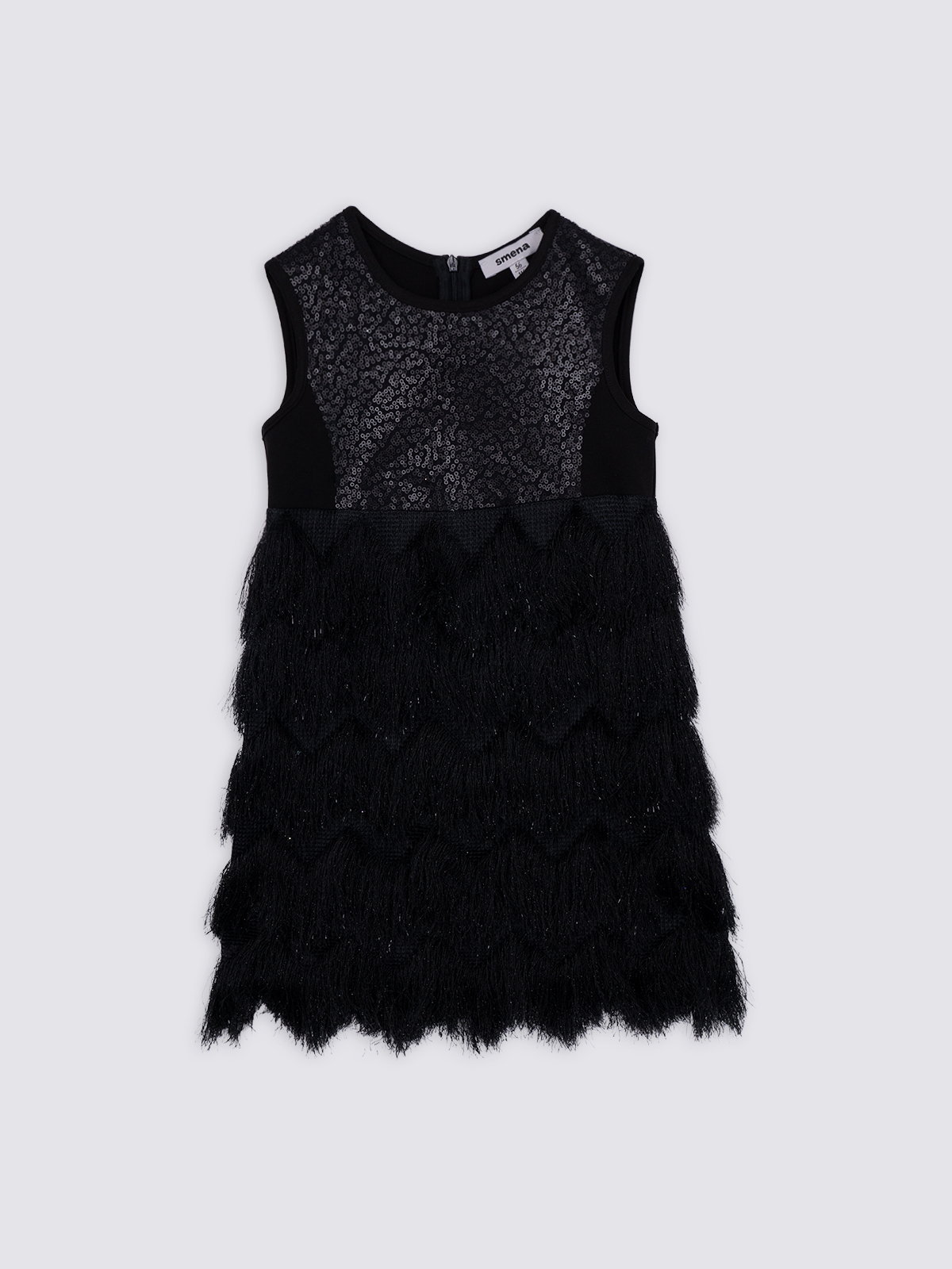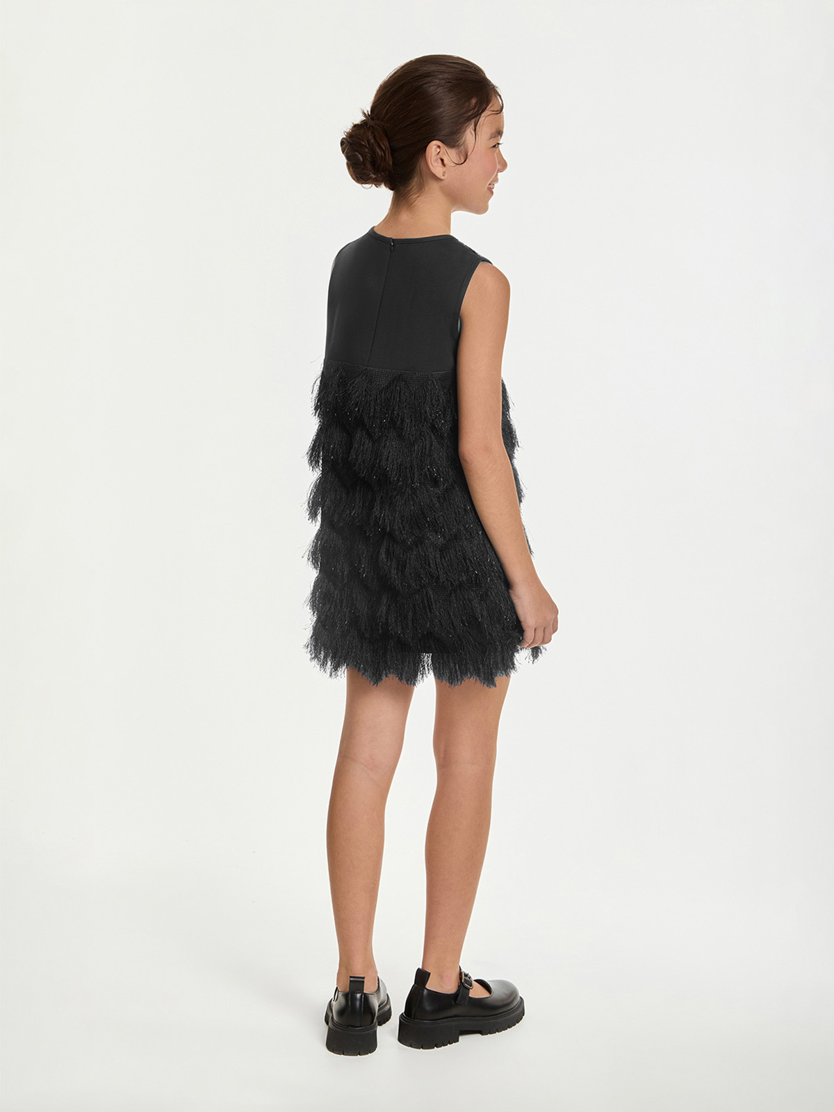 Платье с Высокой линией талии без рукавов. Верх трикотажного лифа украшают блестящие пайетки. Лиф облегает фигуру, создавая полуприталенный силуэт, который плавно расширяется к низу. Особенного внимания заслуживает юбка: она выполнена из ткани с длинным ворсом. Такой материал придаёт изделию дополнительную фактурность и необычность. Для обеспечения комфорта внутренняя часть юбки имеет приятную на ощупь подкладку из хлопка.