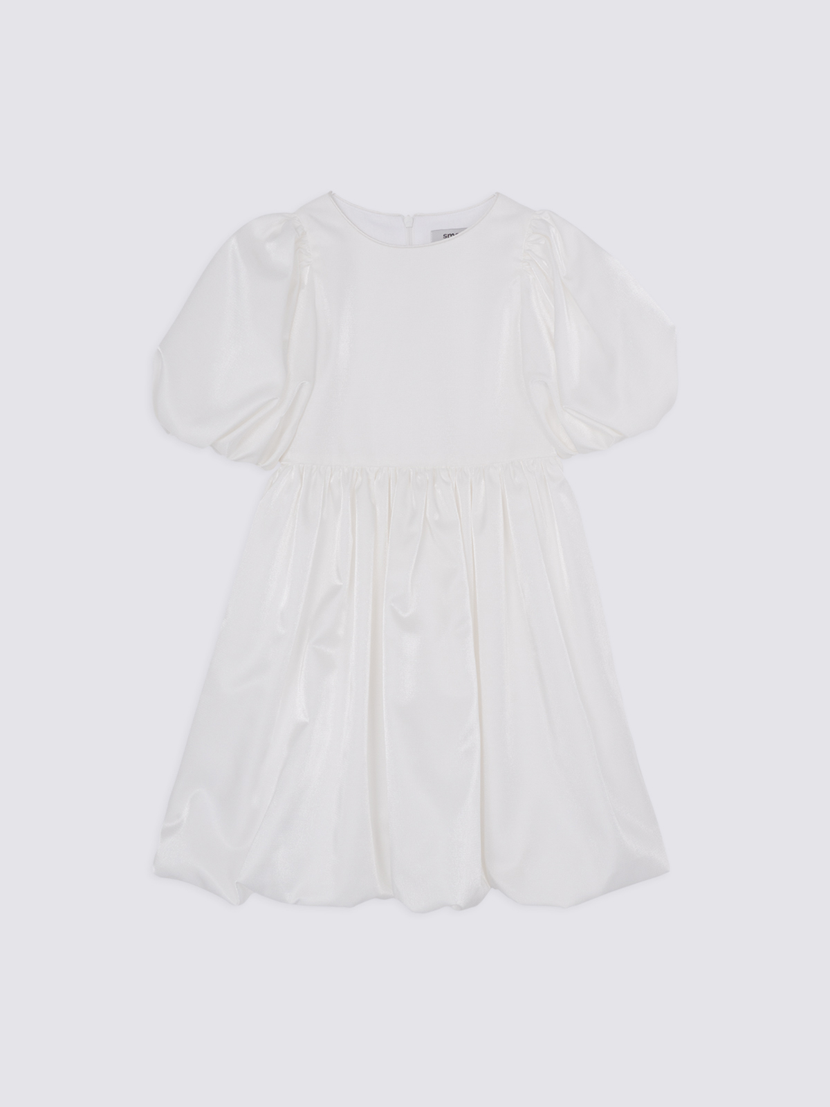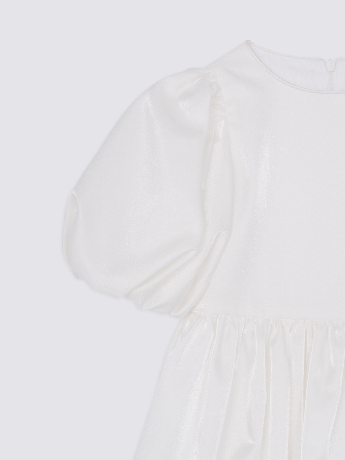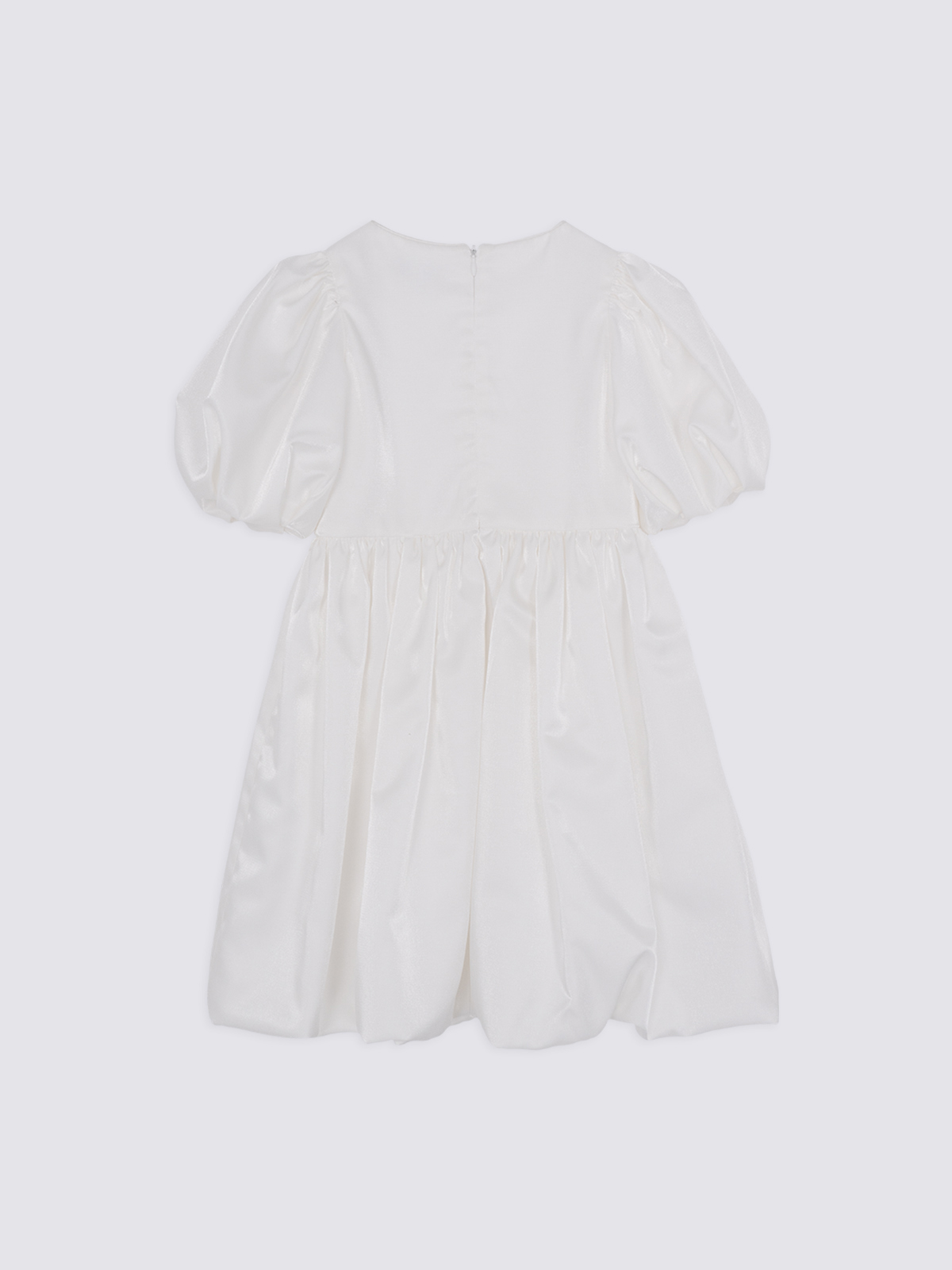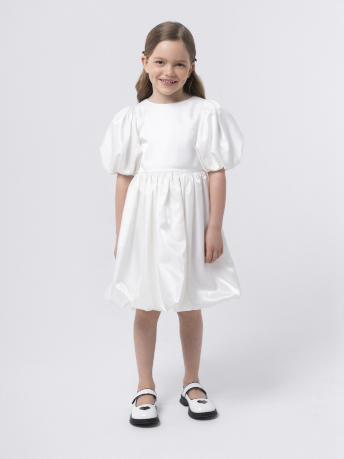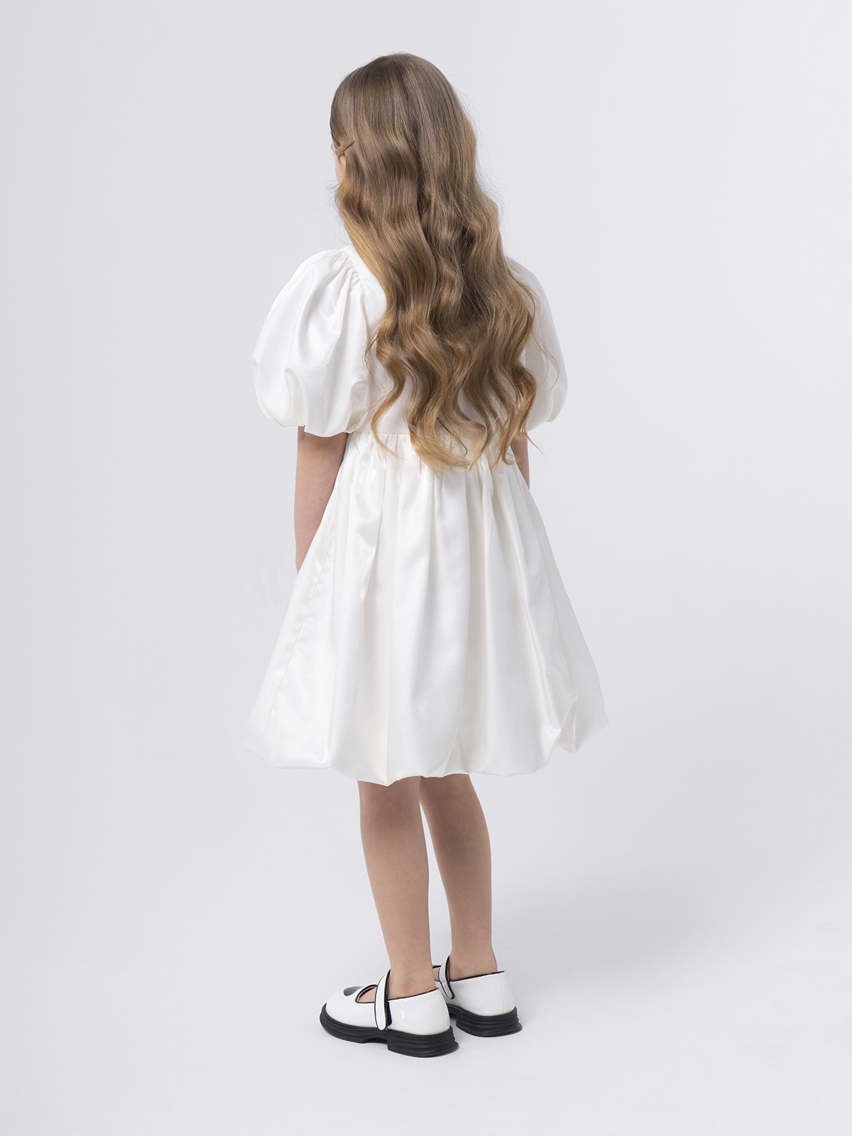 Силуэт и крой: оверсайз с пышной юбкой и объёмными короткими рукавами, создающими эффектное и торжественное звучание образа.