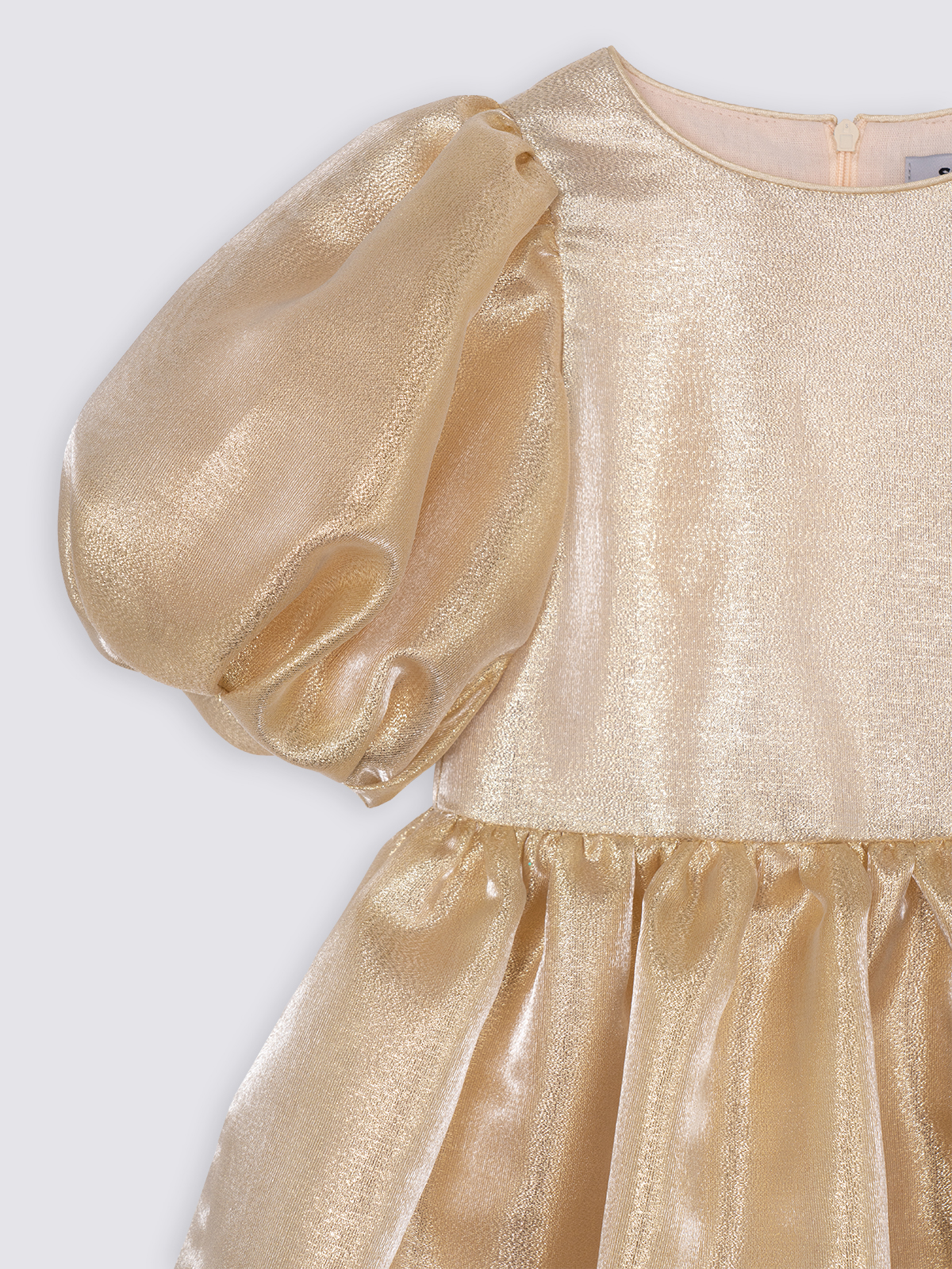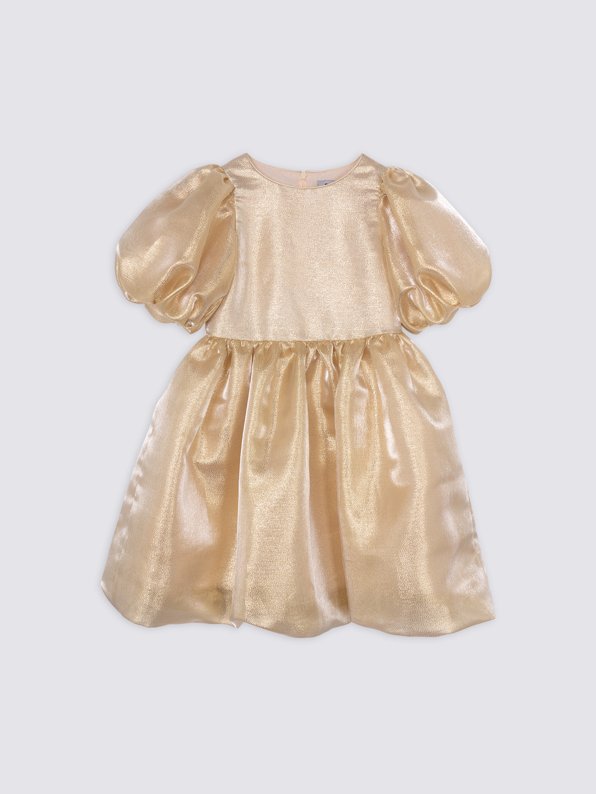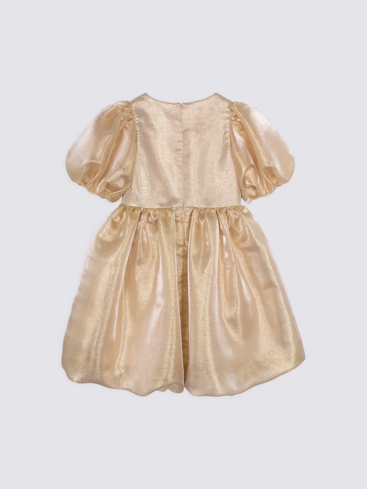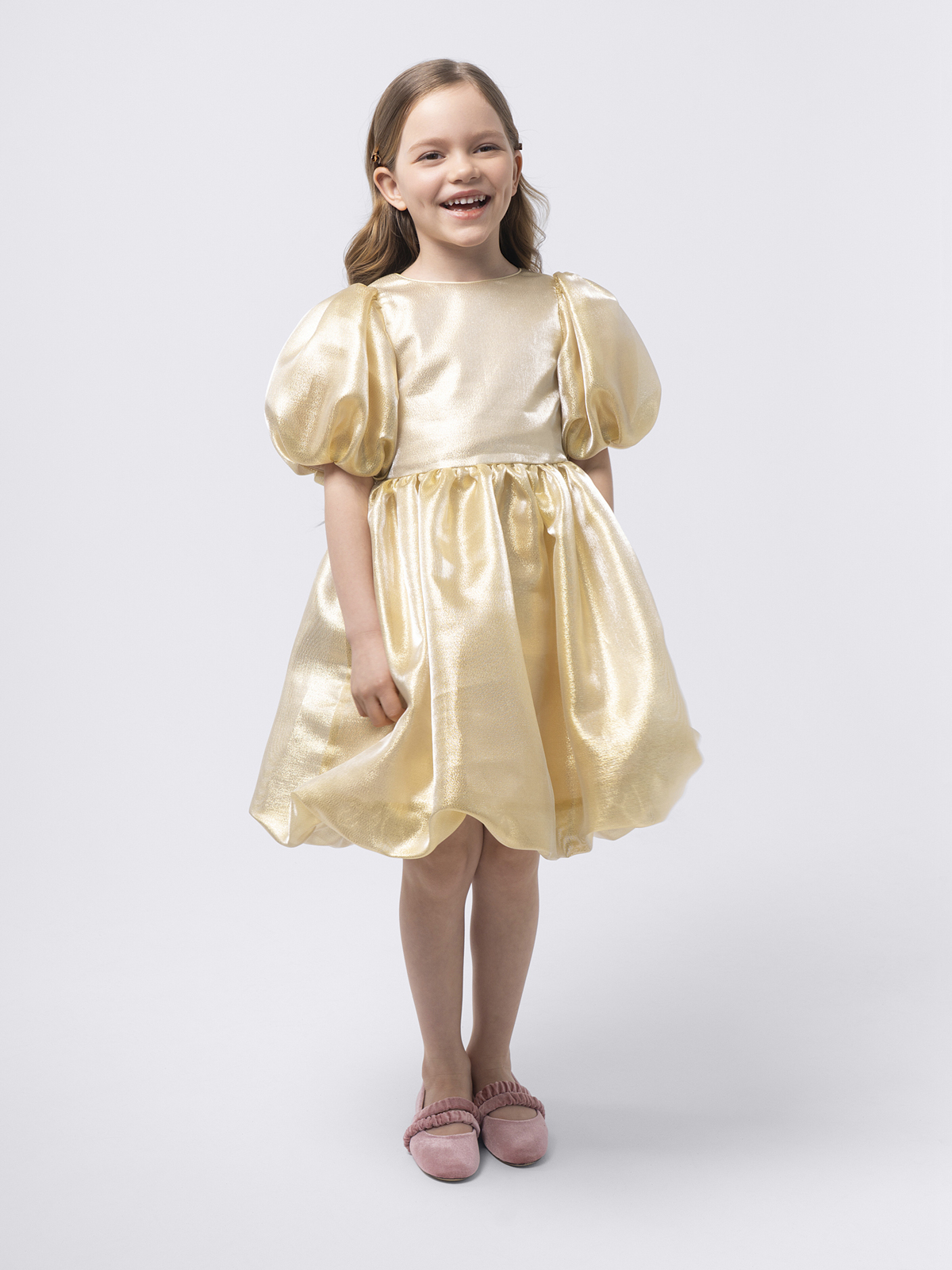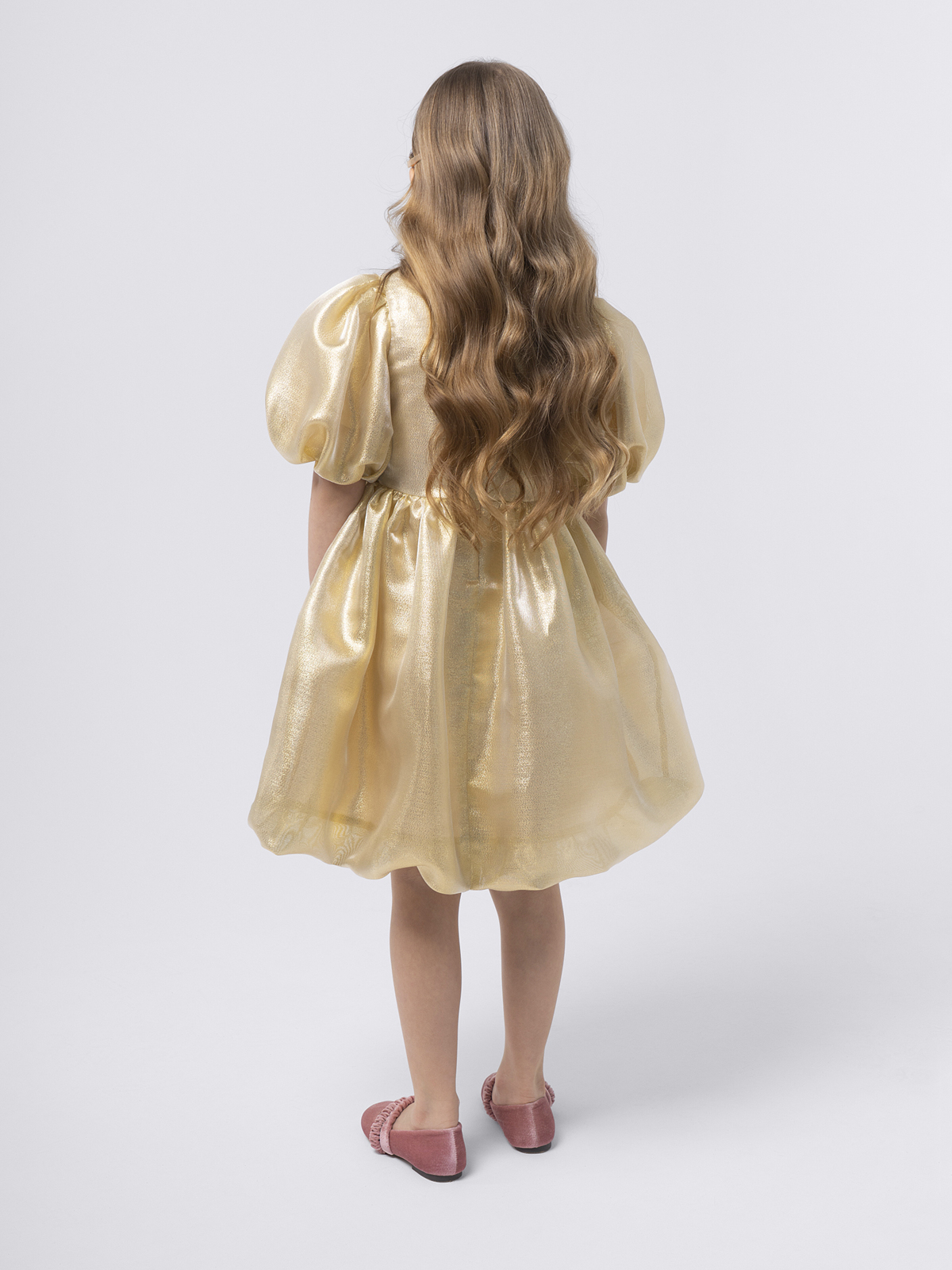 Силуэт и крой: оверсайз с пышной юбкой и объёмными короткими рукавами, создающими эффектное и торжественное звучание образа.