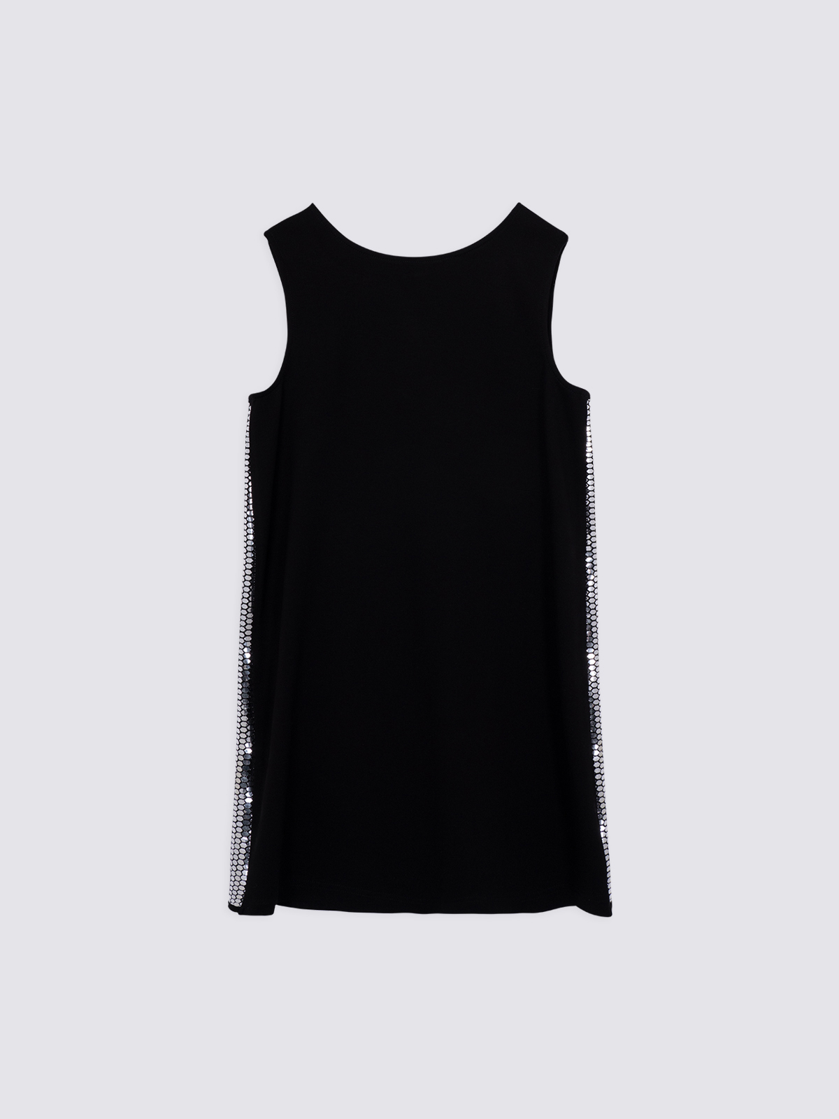 Трикотажное мини-платье без рукавов. Актуальная модель свободного силуэта, который слегка расширяется к низу, без застежки. Спереди на сарафане пайетки.