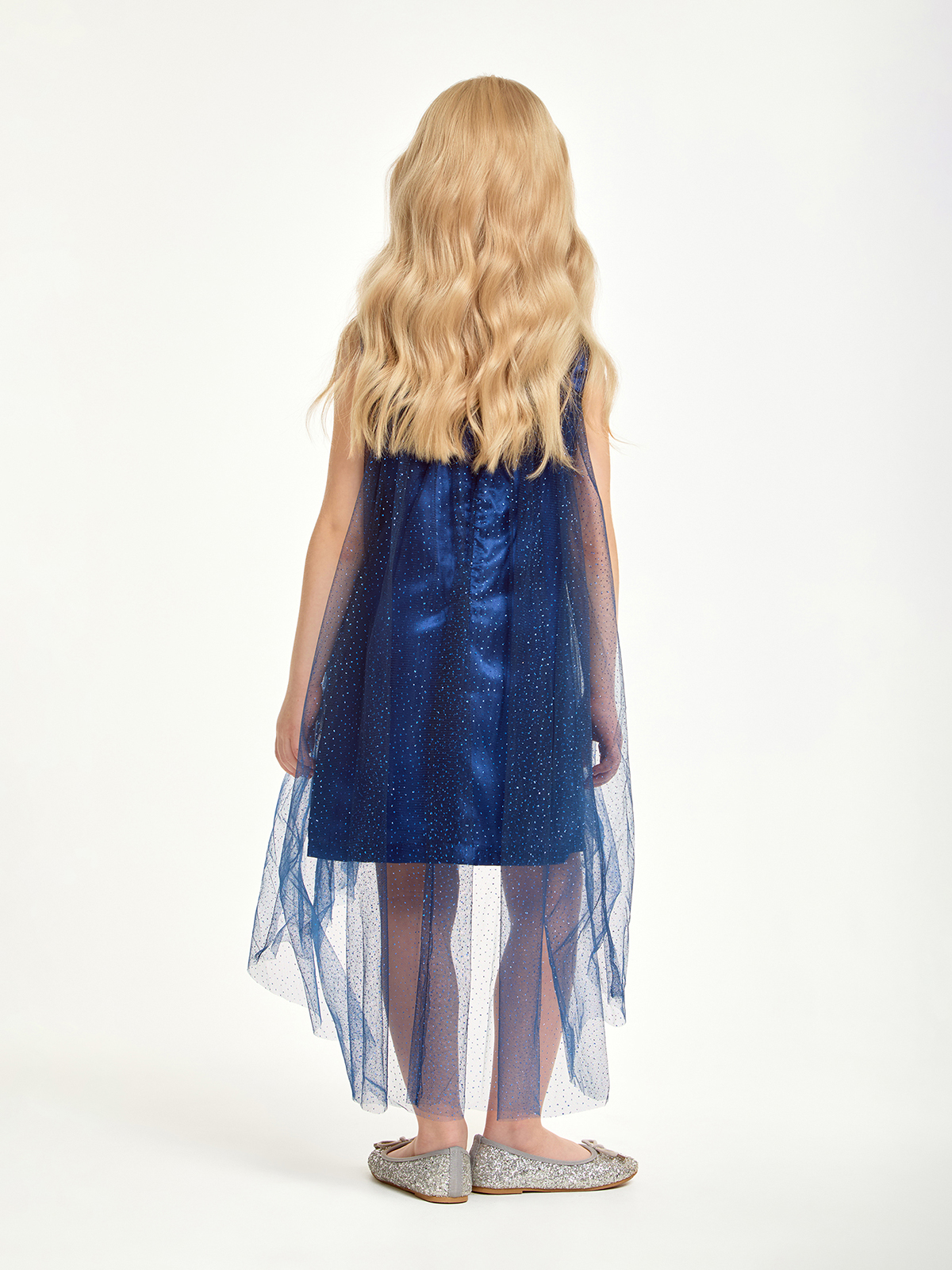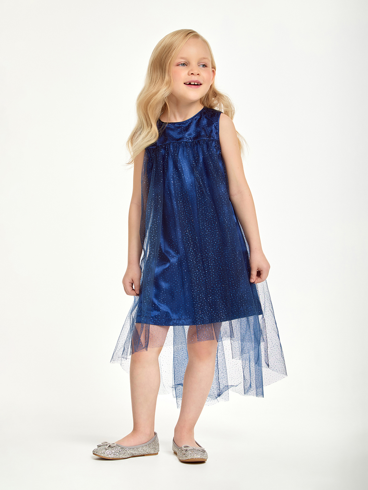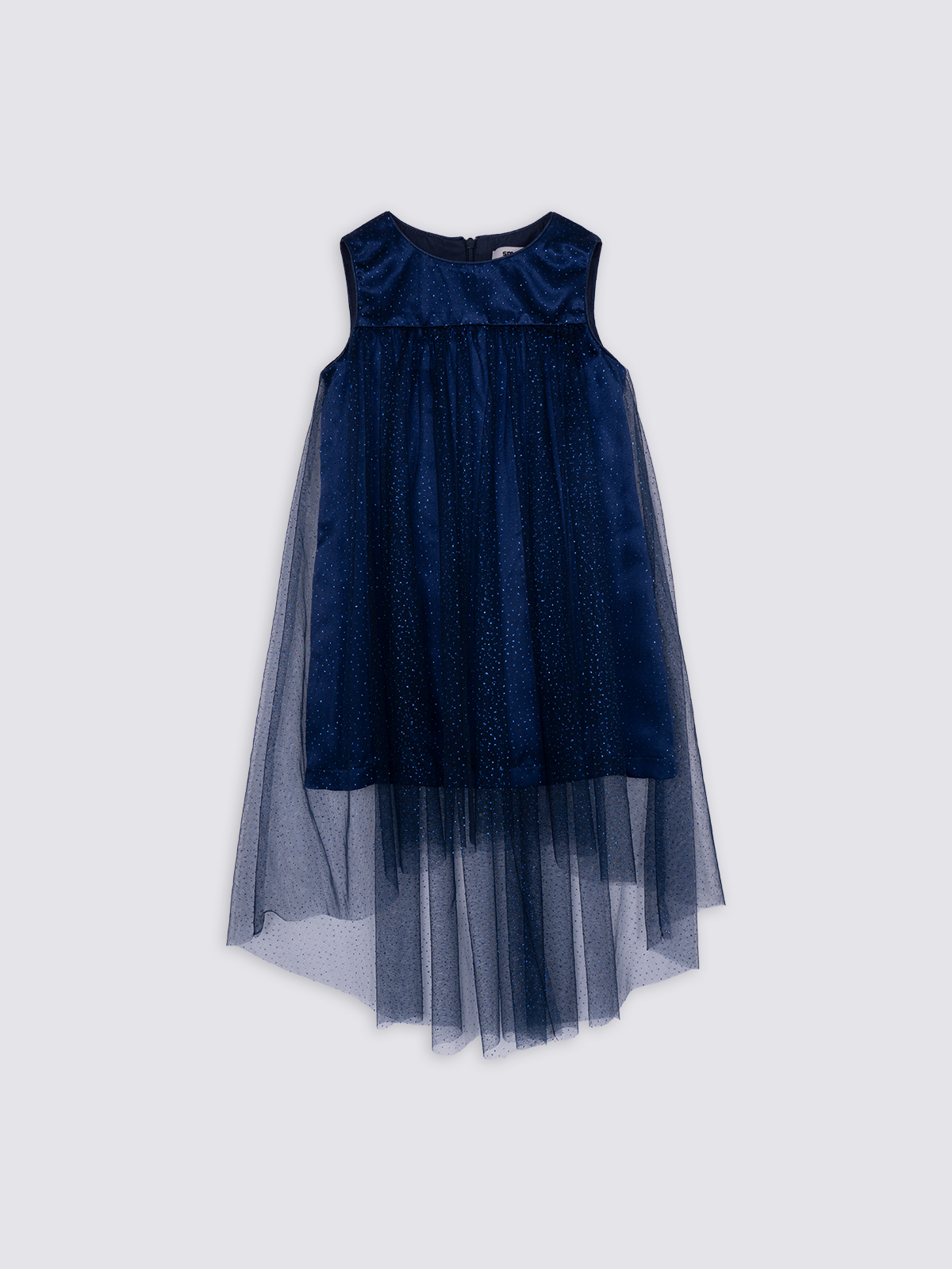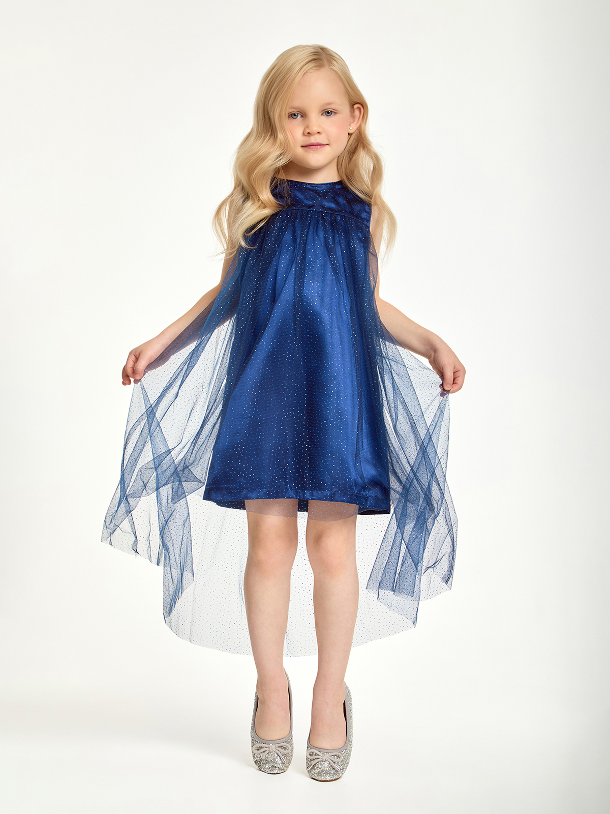 Нарядное платье с кокеткой на груди А-силуэта из гладкого атласа с подкладкой идеально подойдёт для особых случаев. Верх модели драпирован сеткой с блёстками, которая создаёт лёгкое сияние и праздничное настроение. Удлинённая спинка добавляет изысканности и подчёркивает элегантный силуэт.
