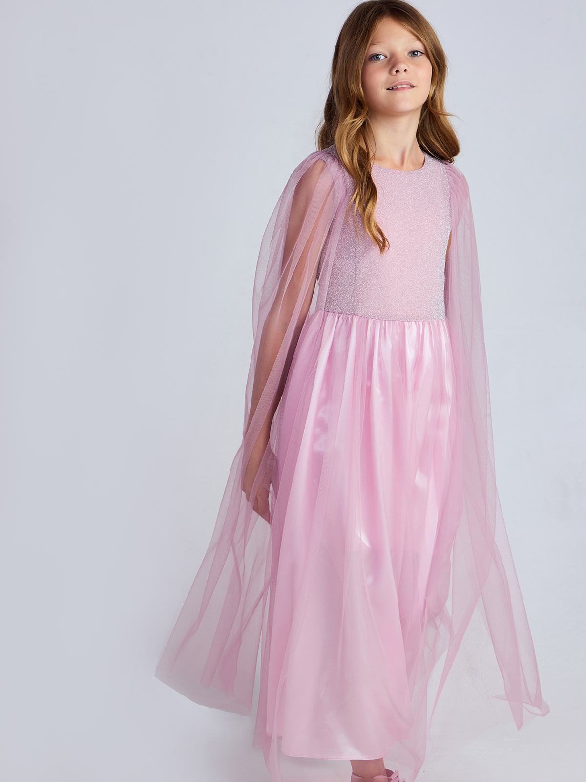 Платье из атласа на хлопчатобумажной отлетной подкладке с застежкой на потайную молнию. Сетчатые рукава-крылья с напылением блесток эффектно спускаются до подола. Юбка из нескольких слоёв: верхний слой выполнен из сетки с напылением блесток, нижний слой из атласа.