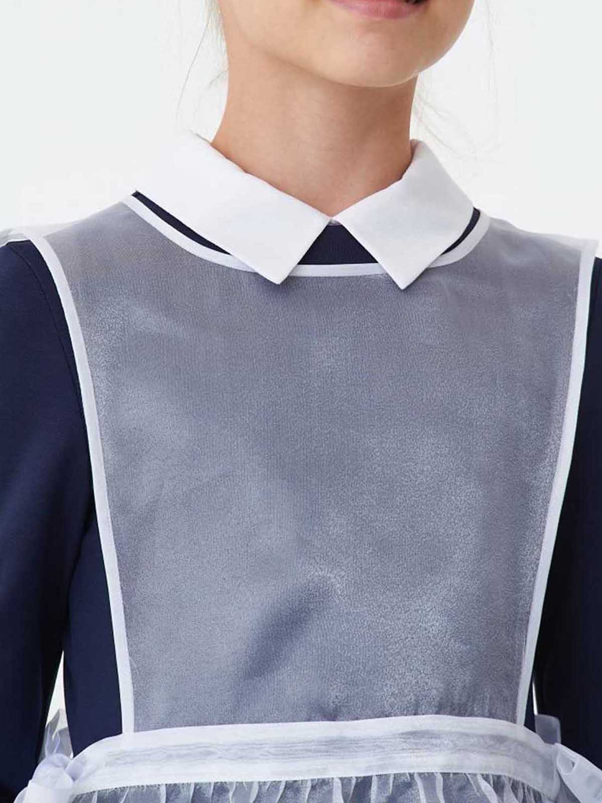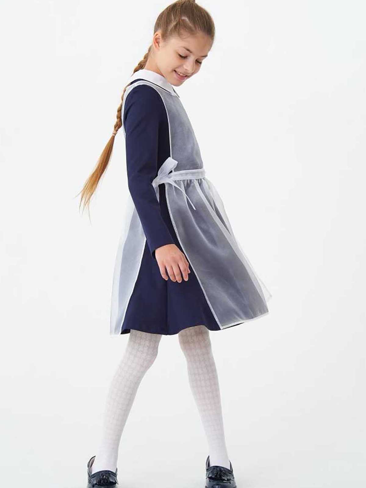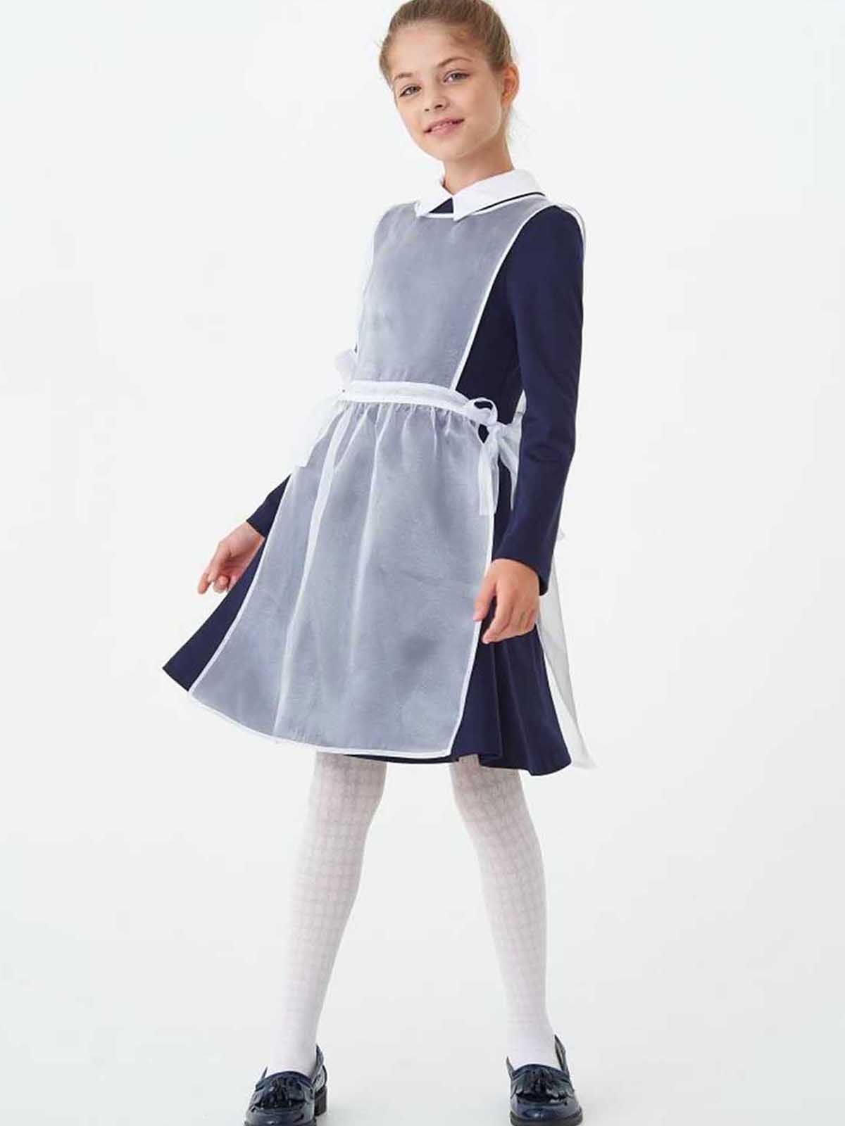 Фартук для девочек из органзы. Перед и спинка цельные с круглым вырезом горловины. Нижняя часть фартука присборена у талии. Пояс из основной ткани завязывается по бокам на бантик.