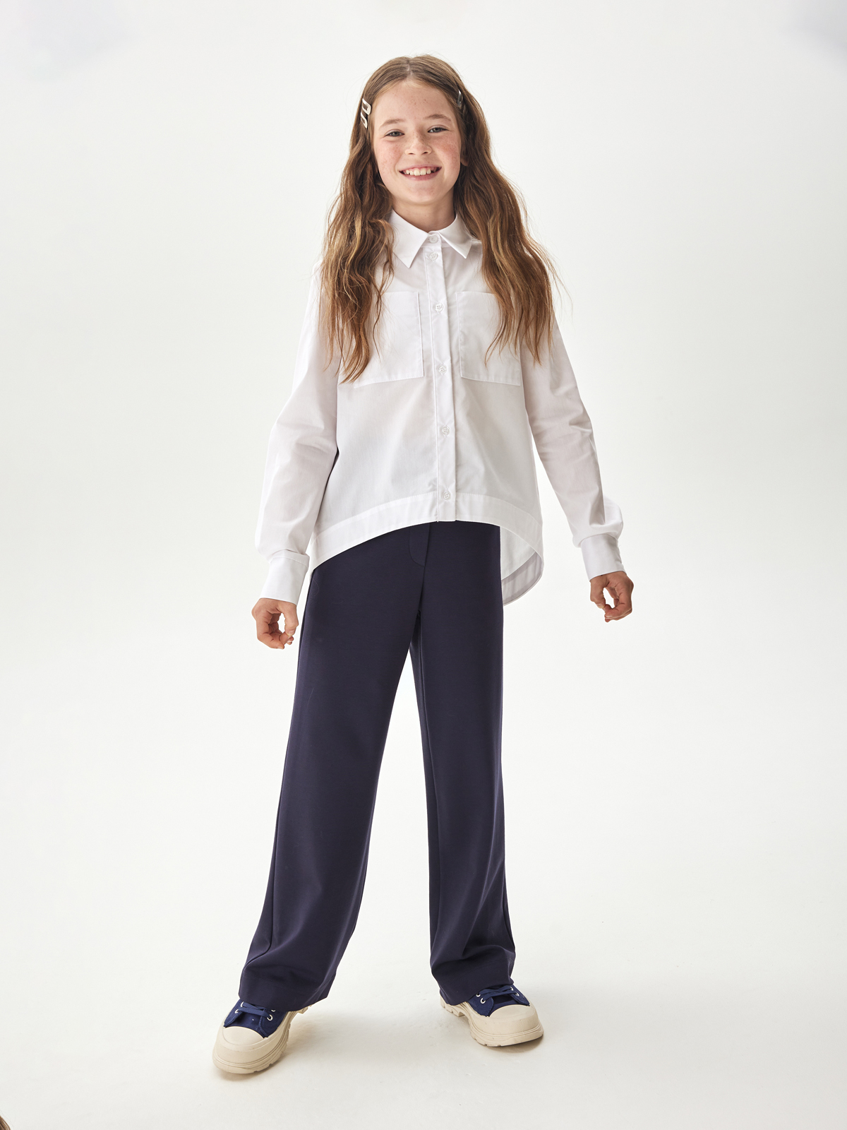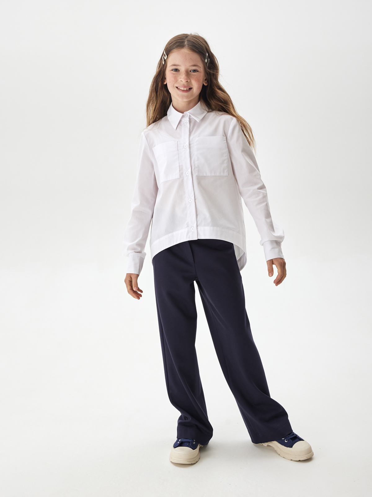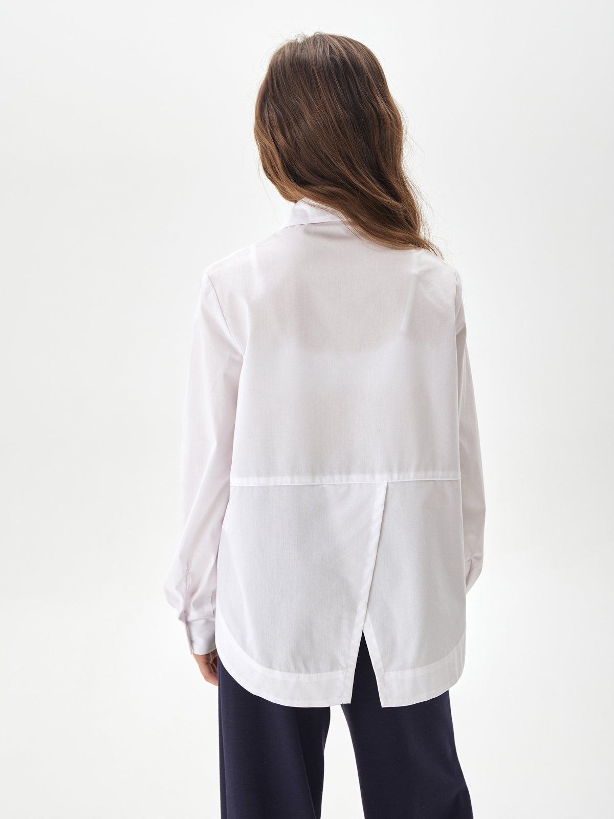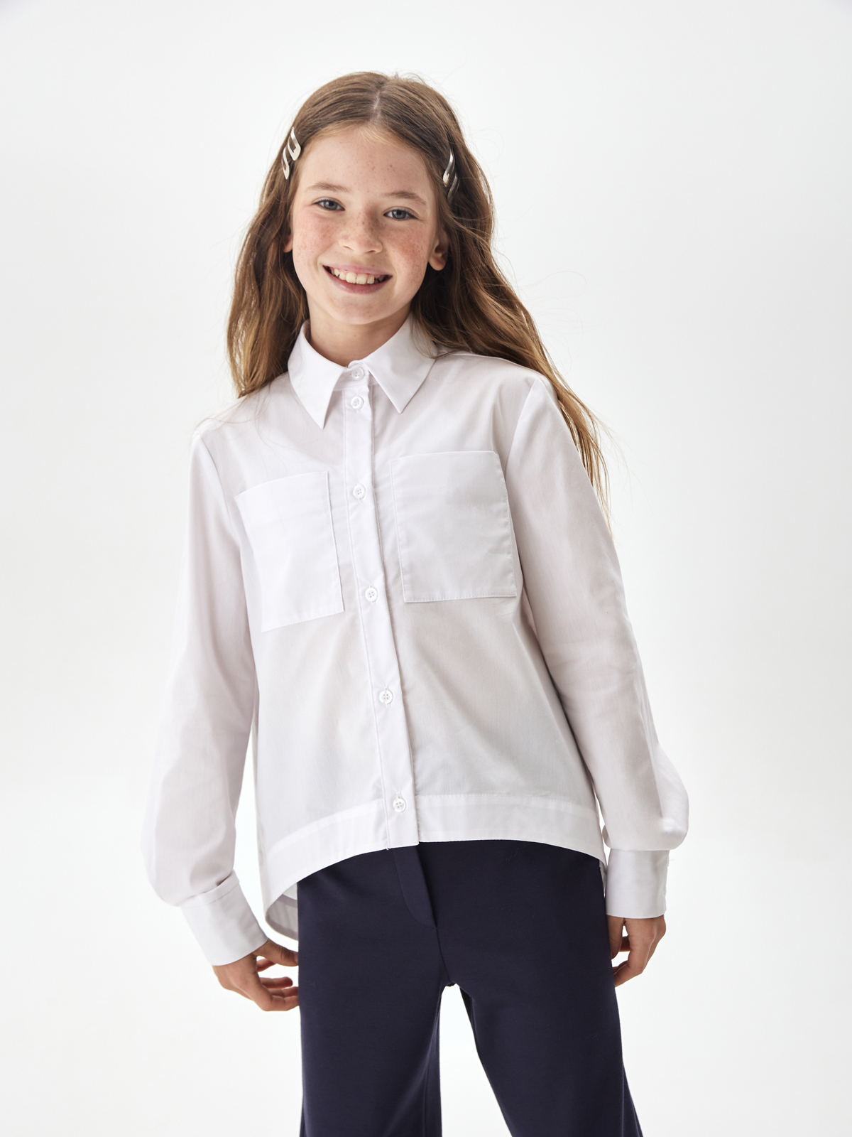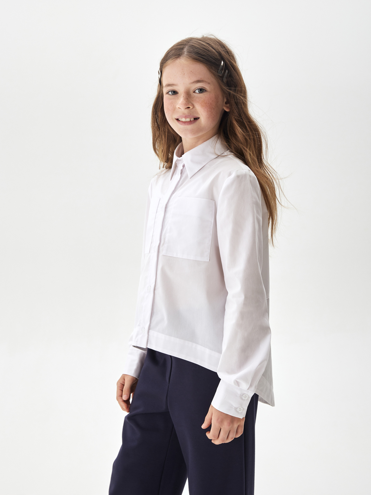 Свободная блузка для подростков из смесового хлопка с отложным воротником со стойкой и длинными рукавами на манжете. Передняя часть укороченная. На полочке расположены два накладных кармана. Спинка удлинённая с фигурным низом и запахом из под линии кокетки. Застежка на планку с пуговицами. Высокое содержание хлопка в составе обеспечивает отличную воздухопроницаемость и комфорт в повседневной носке. Блузка будет прекрасным дополнением к моделям из школьной коллекции SMENA, отличный вариант на каждый день.