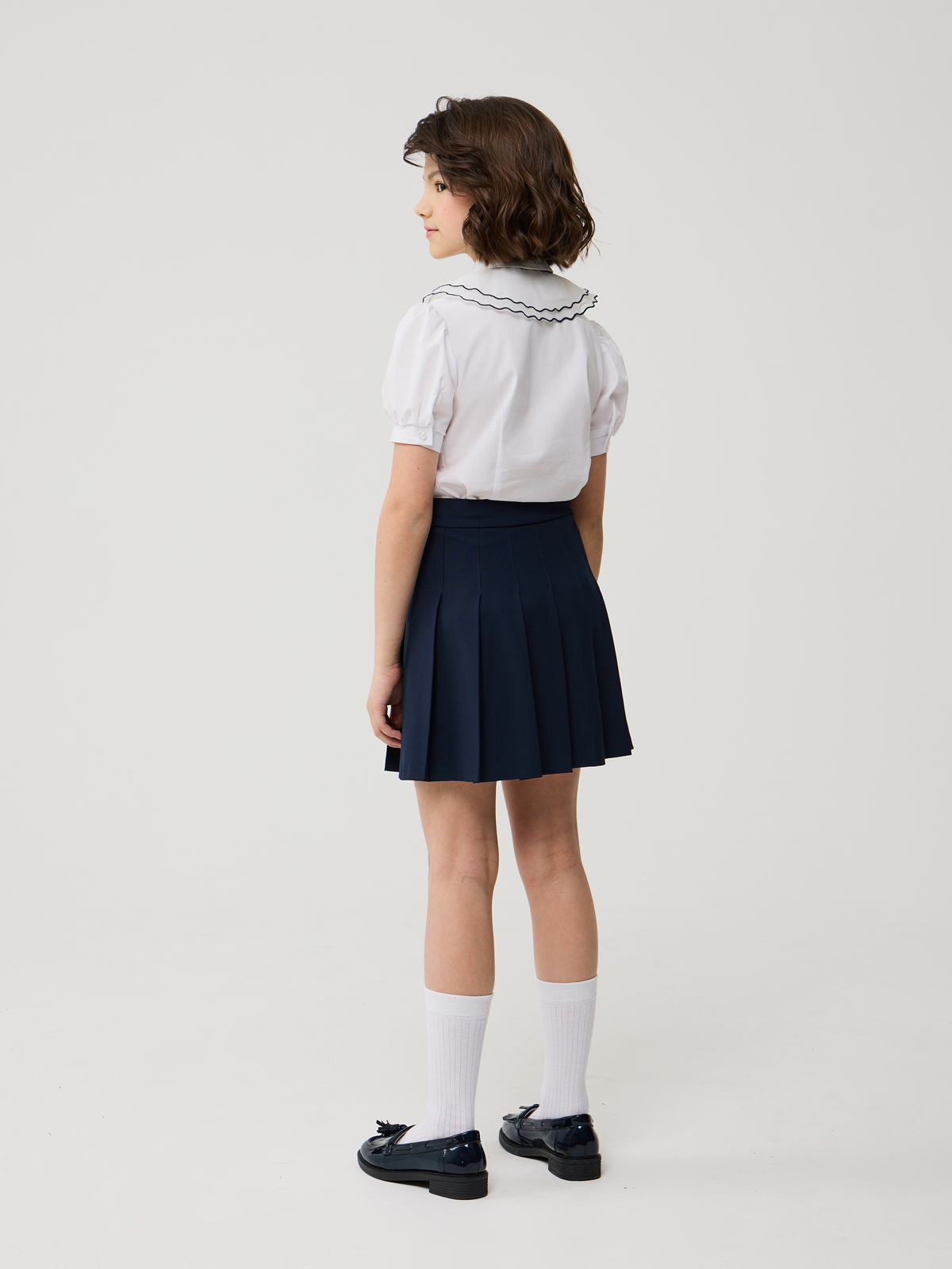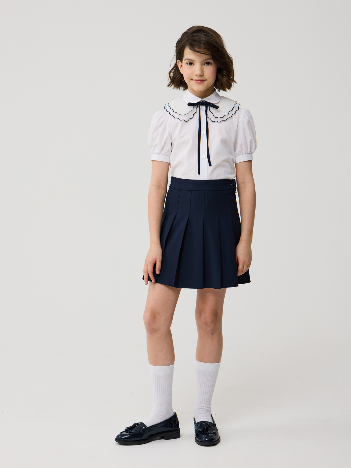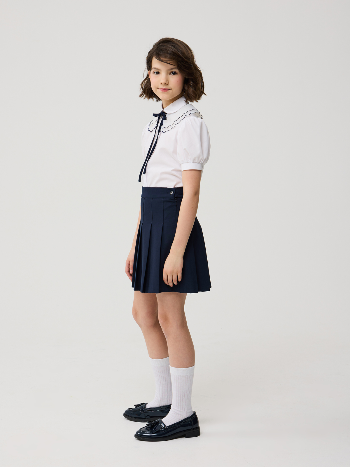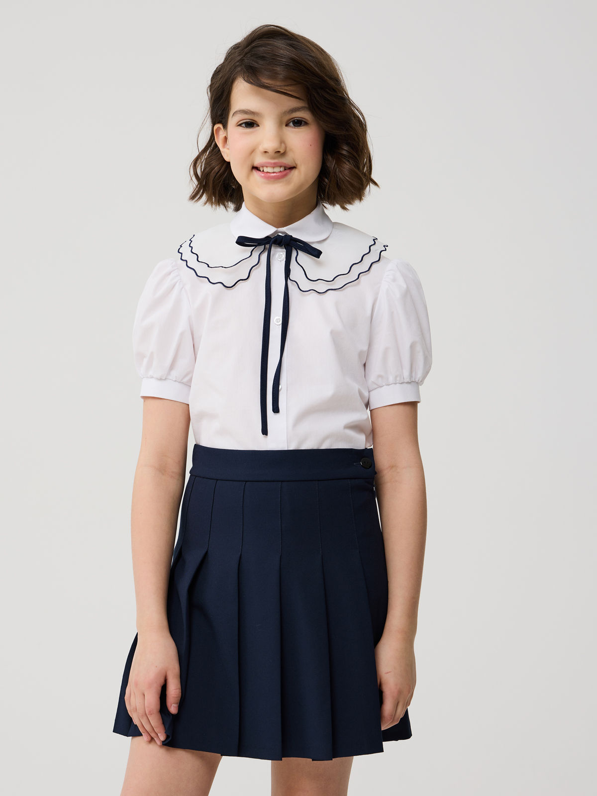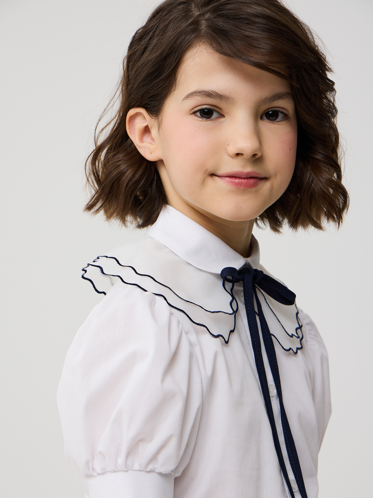 Стильная блуза из смесового хлопка полуприлегающего силуэта с отложным воротником и короткими рукавами, присборенными у манжеты. Блузка дополнена съемным воротником из органзы. Срез воротничка окантован лентой контрастного цвета. Концы ленты образуют завязки и завязаны на бант. Воротничок дополнительно прикреплен к изделию закрепкой на участке левого плечевого шва. Центральная застёжка на планку с пуговицами ""кристалл"". Высокое содержание хлопка в составе обеспечивает отличную воздухопроницаемость и комфорт в повседневной носке. Отличный вариант на каждый день.