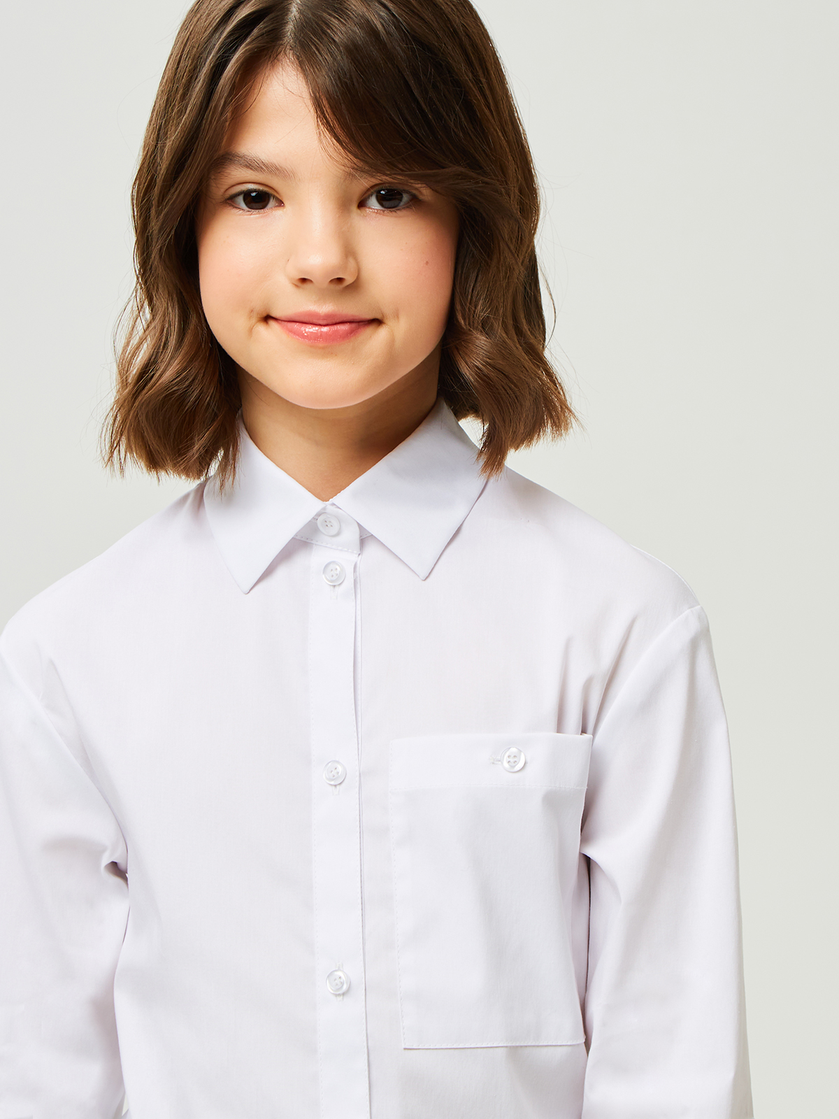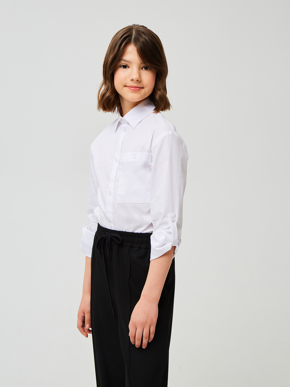 Классическая блузка для подростков из смесового хлопка с отложным воротником на стойке и длинными рукавами на манжете. Рукава декорированы патой и пуговицей позволяющей собрать рукав. Левая сторона полочки дополнена накладным карманом. Застежка центральная на планку с пуговицами. Высокое содержание хлопка в составе обеспечивает отличную воздухопроницаемость и комфорт в повседневной носке. Блузка будет прекрасным дополнением к моделям из школьной коллекции SMENA.