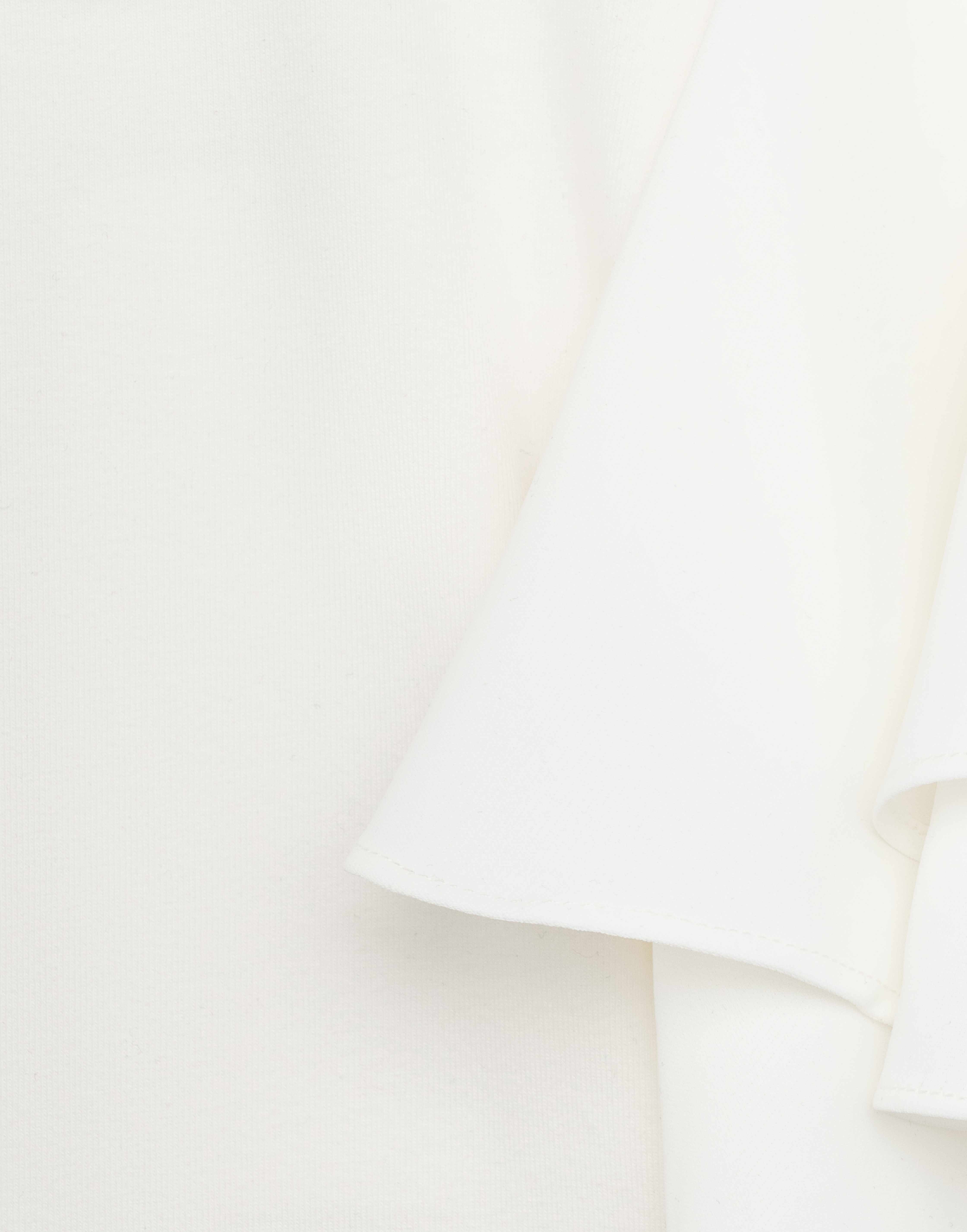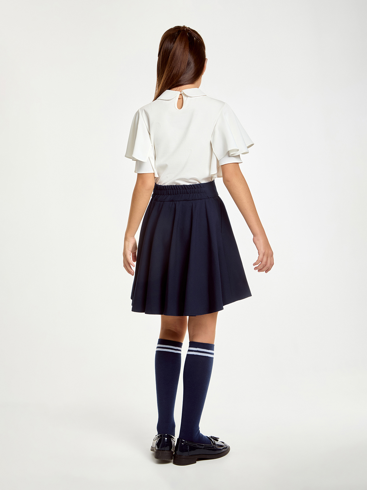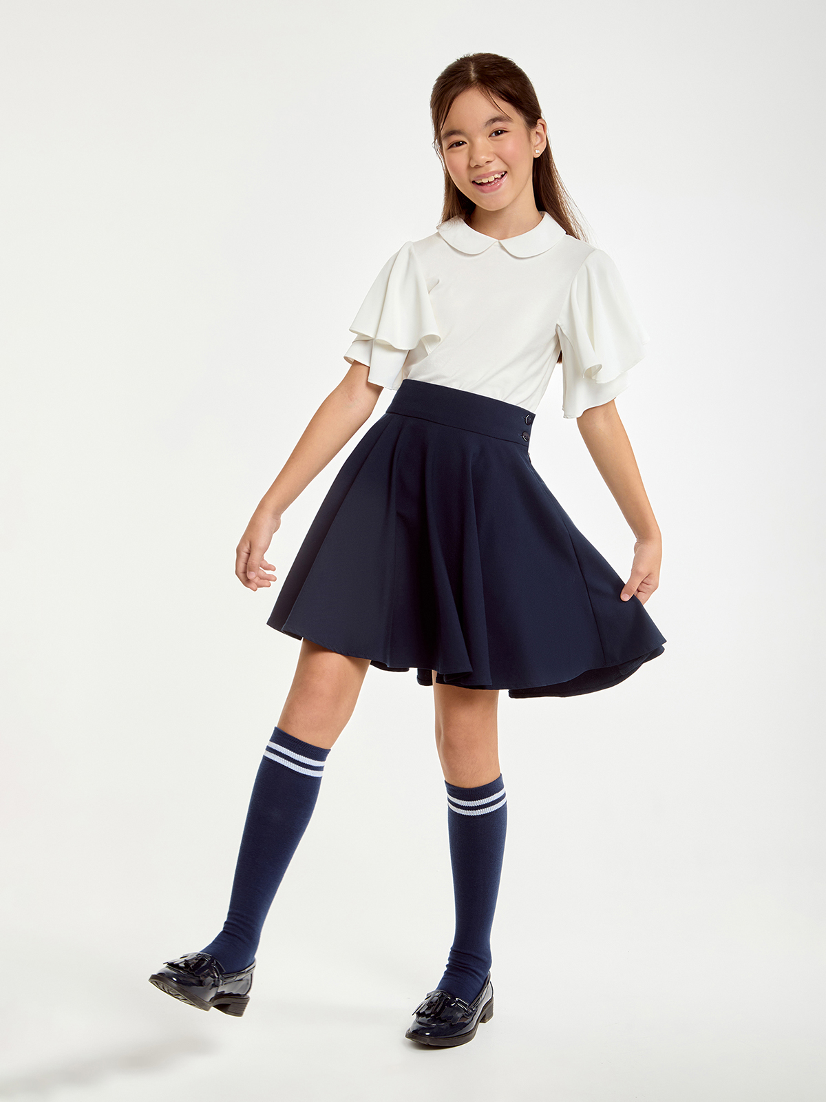 Нарядный трикотажный джемпер станет идеальным выбором для школы. Выполненный из мягкого полотна, он обеспечивает комфорт и стиль в течение всего дня. Особенность модели — вырез «капля» на спинке, оформленный застежкой, добавляет элегантности образу. Воротник состоит из двух частей с закругленными концами как спереди, так и сзади, подчеркивая аккуратность дизайна. Волан придает изделию легкость и изящность.Короткие рукава обеспечивают свободу движений и идеально подходят для теплого времени года или помещений.