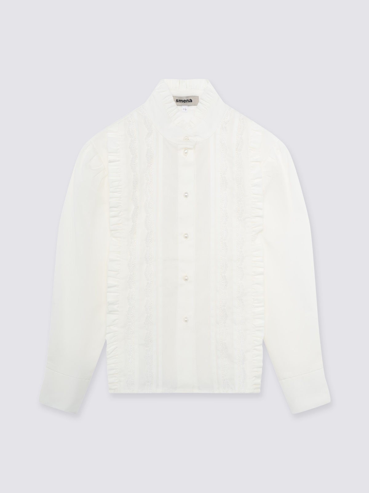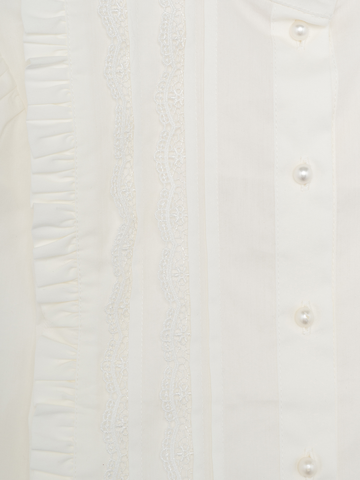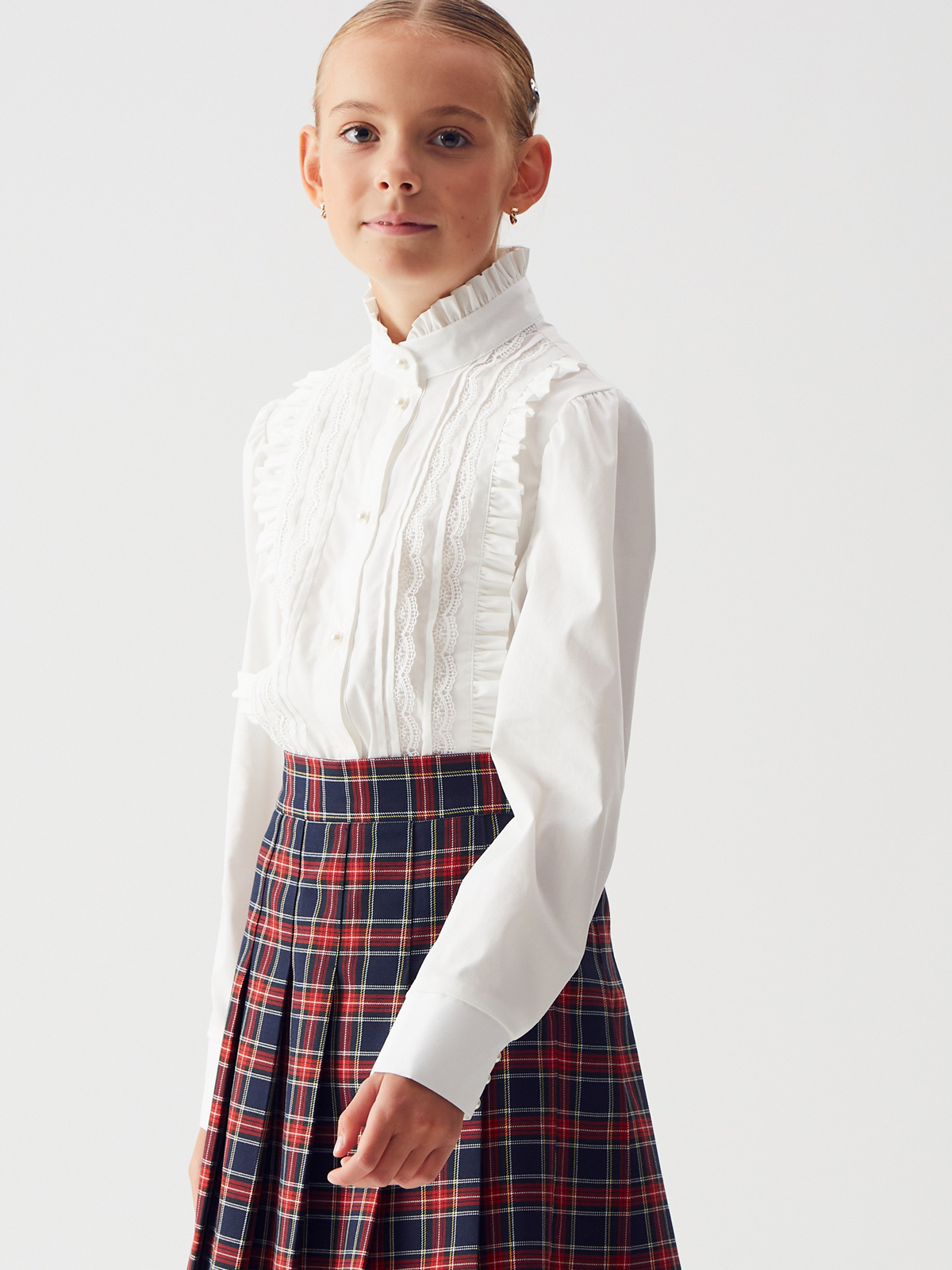 Романтичная блузка из смесового хлопка полуприлегающего силуэта с кружевным воротником и ажурным кружевом . Высокое содержание хлопка в составе обеспечивает отличную воздухопроницаемость и комфорт в повседневной носке. Отличное решение для создания романтичных образов маленькой модницы.