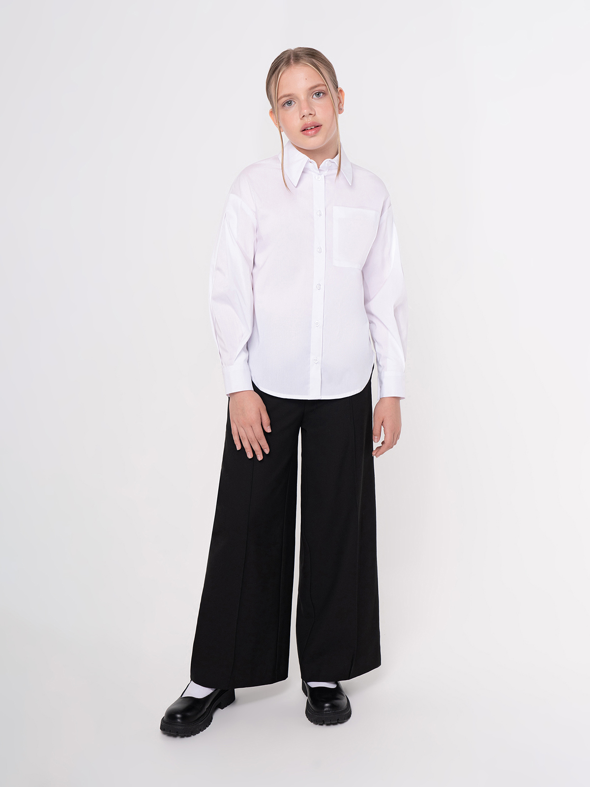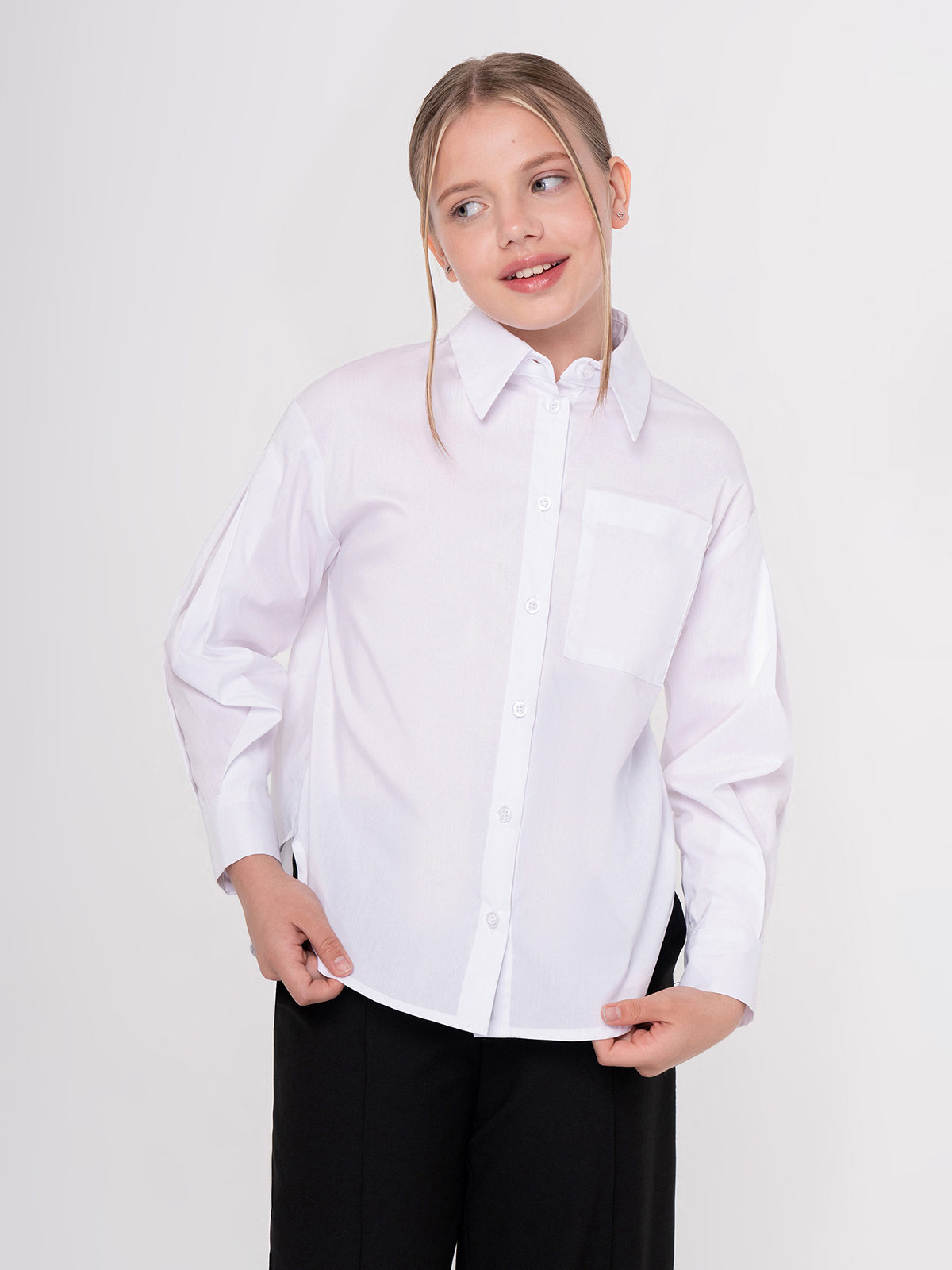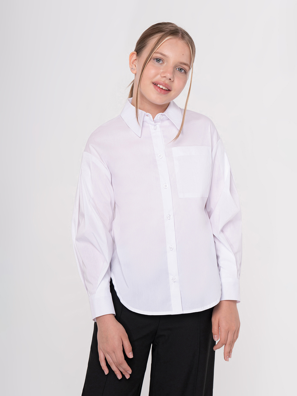 Классическая блузка для девочки из смесового хлопка с отложным воротником со стойкой, длинными спущенными рукавами на манжетах и кокеткой на спинке. Высокое содержание хлопка в составе обеспечивает отличную воздухопроницаемость и комфорт в повседневной носке.