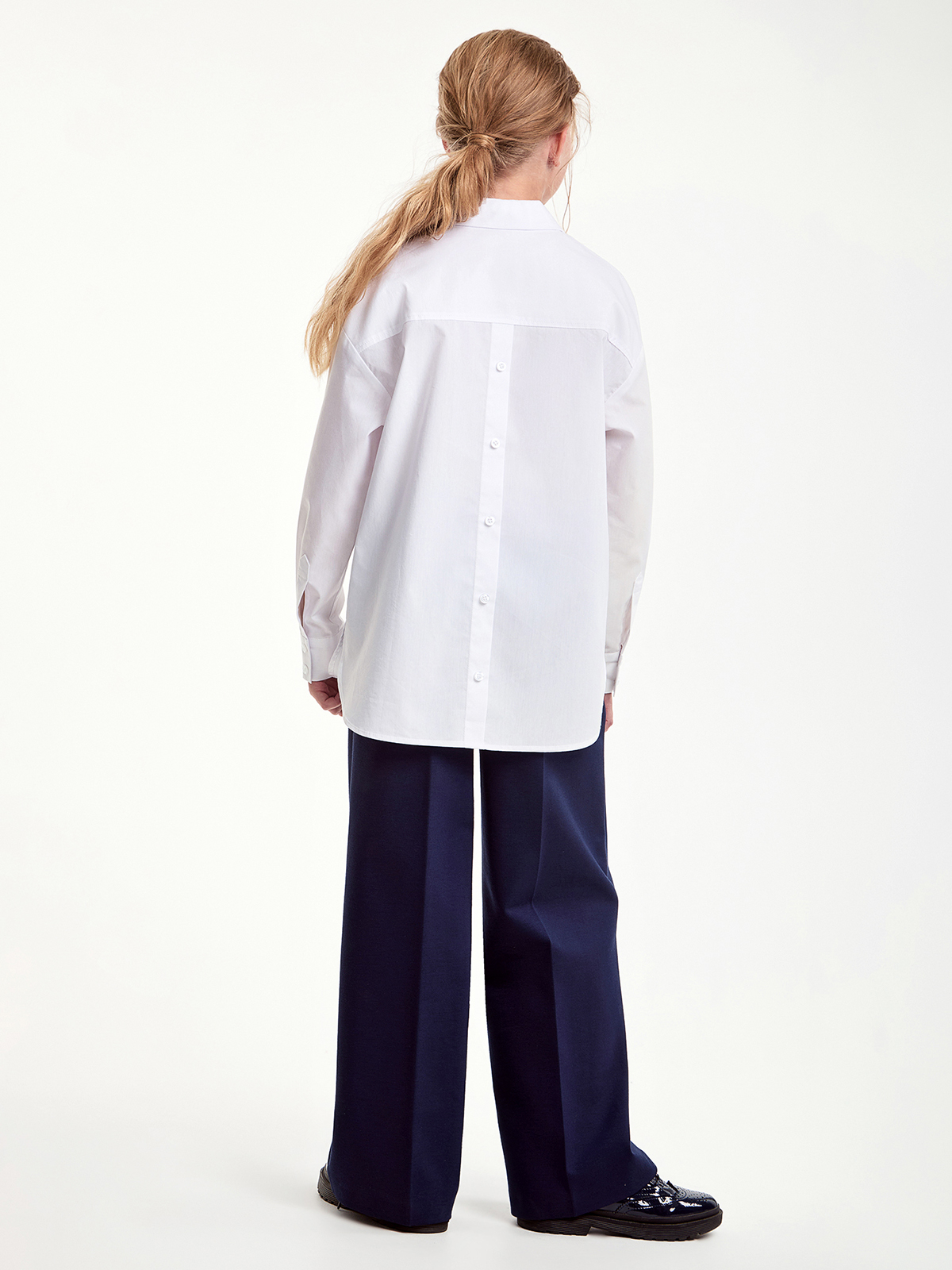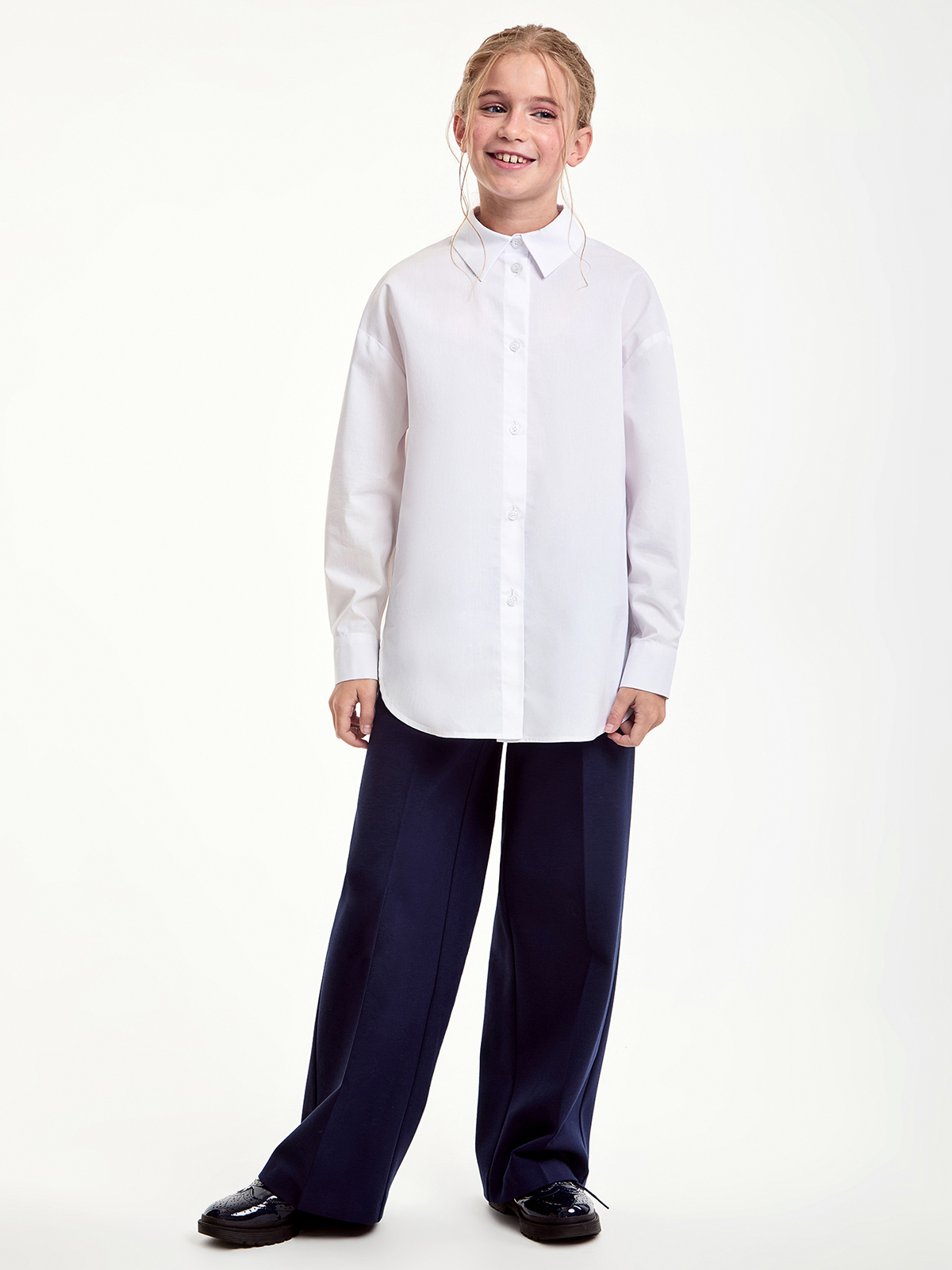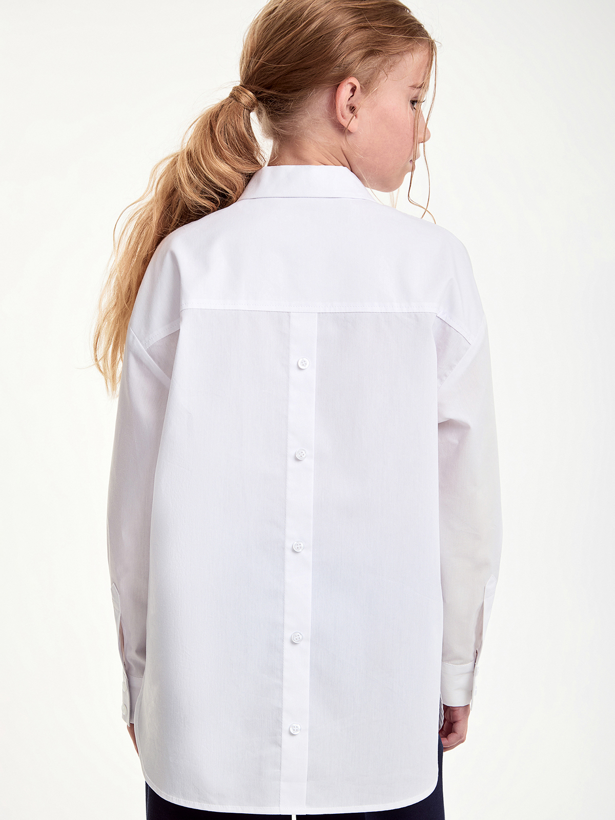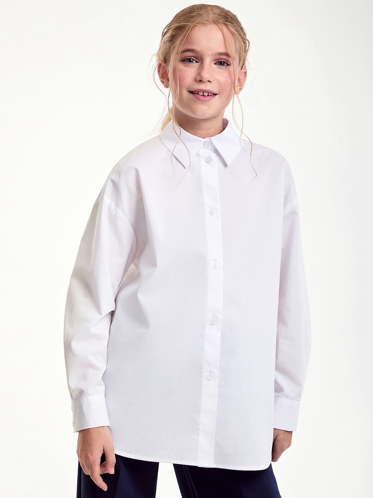 Недостающий пазл в гардеробе девочки — свободная белая блузка оверсайз силуэта! Блузка выполнена из смесового хлопка. Высококачественный материал прекрасно дышит, держит форму и идеально подходит для образов на каждый день. Блузку с удлиненной линией можно сочетать с зауженными или прилегающими брюками, носить как самостоятельный элемент или надевать поверх базовых футболок, чтобы создать более расслабленный и непринужденный комплект.