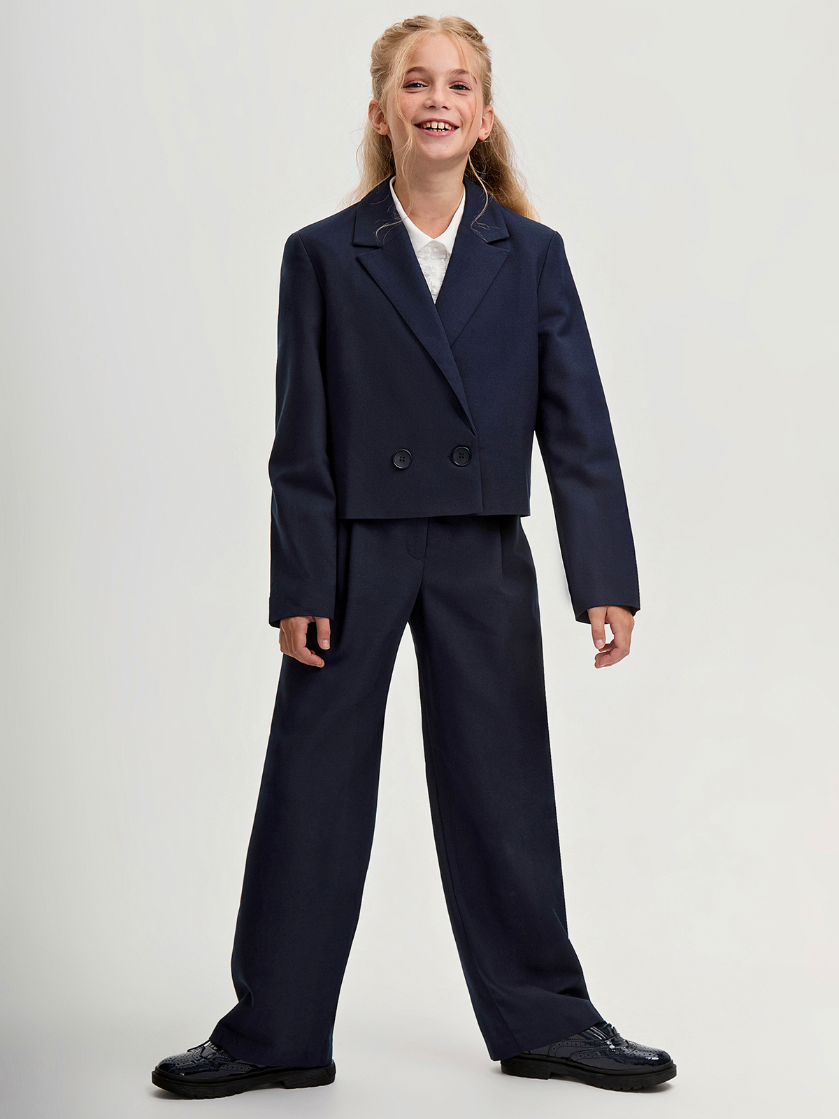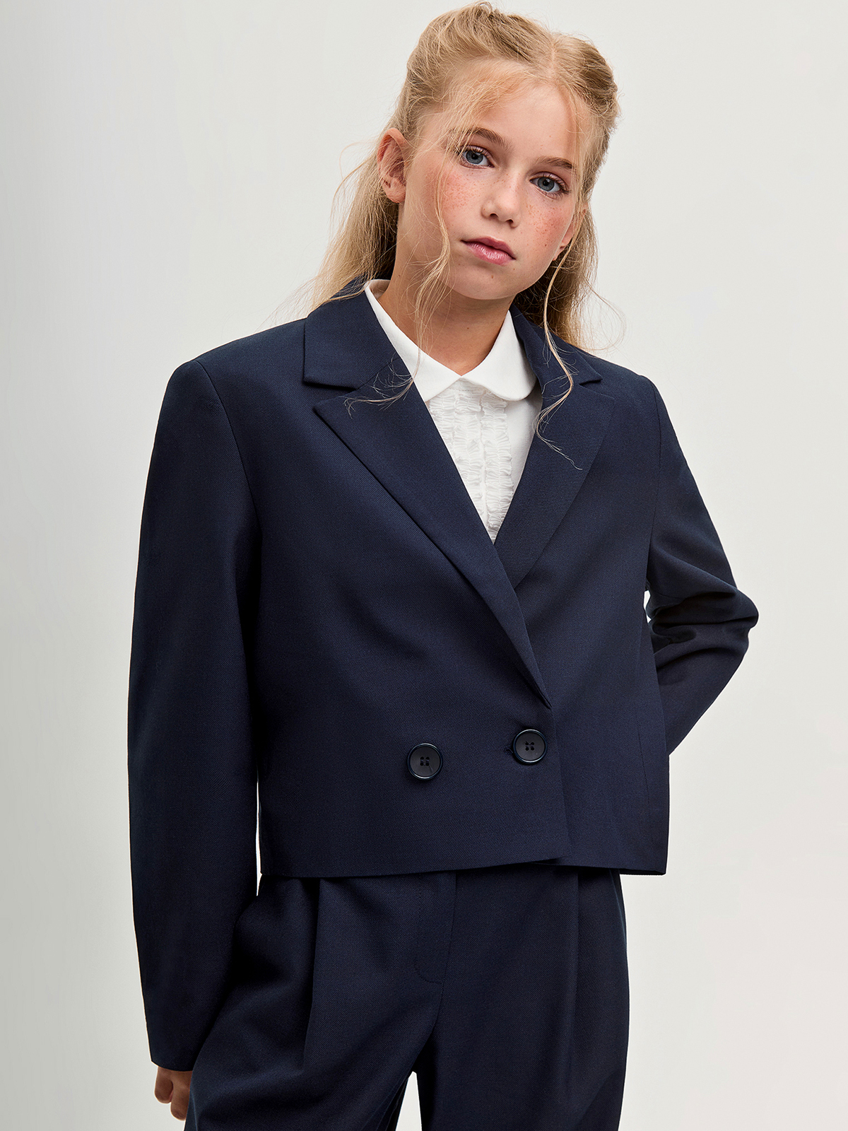 Укороченный жакет для девочек идеально подойдет для школы. Модель имеет двубортную застежку, что добавляет классический акцент и удобство в носке. Воротник выполнен в отложном стиле с лацканами , что подчеркивает аккуратность и элегантность внешнего вида. Дополнительное удобство обеспечивает подкладка, которая создает комфорт при ежедневной носке. На внутренней стороне правого борта предусмотрена потайная пуговица, что гарантирует надежность фиксации. Такой крой удачно впишется в школьный дресс-код, сочетая строгие линии с современным дизайном.