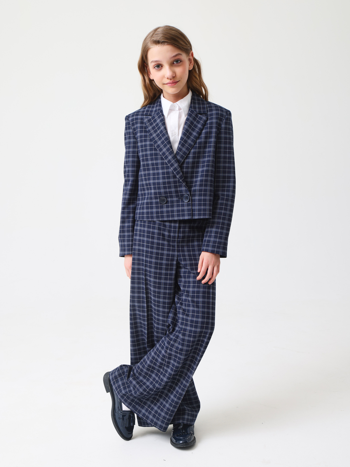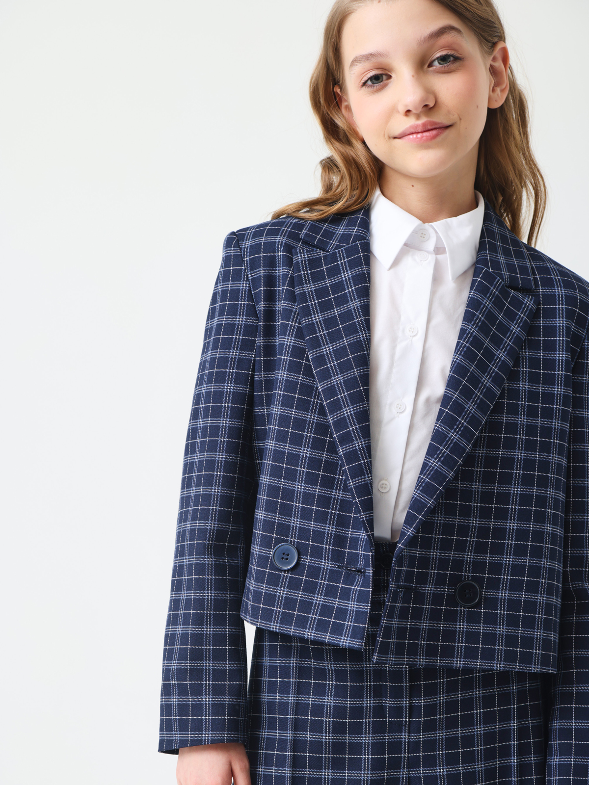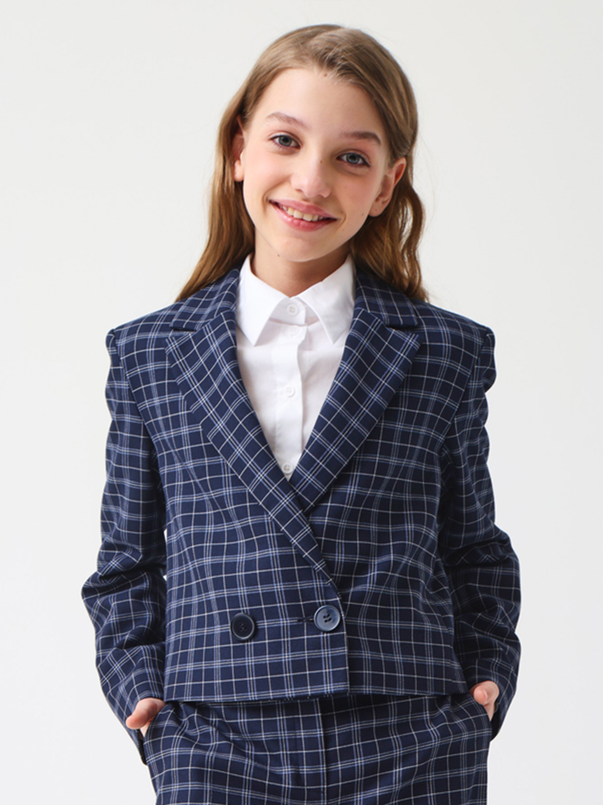 Укороченный жакет для девочек идеально подойдет для школы. Модель имеет двубортную застежку, что добавляет классический акцент и удобство в носке. Воротник выполнен в отложном стиле с лацканами , что подчеркивает аккуратность и элегантность внешнего вида. Дополнительное удобство обеспечивает подкладка, которая создает комфорт при ежедневной носке. На внутренней стороне правого борта предусмотрена потайная пуговица, что гарантирует надежность фиксации. Такой крой удачно впишется в школьный дресс-код, сочетая строгие линии с современным дизайном.