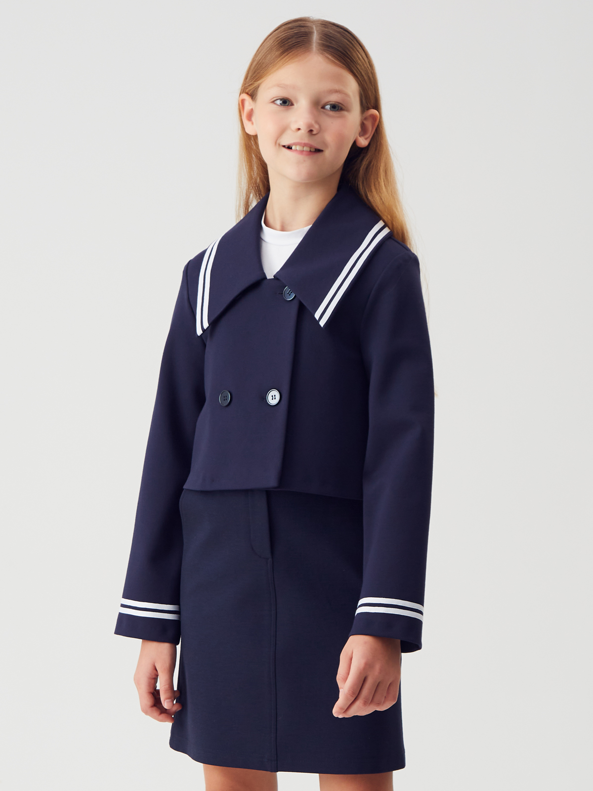 Укороченный жакет для девочек идеально подойдет для школы. Модель имеет двубортную застежку, что добавляет классический акцент и удобство в носке. Акцентный воротник подчеркивает аккуратность и элегантность внешнего вида. Дополнительное удобство обеспечивает подкладка, которая создает комфорт при ежедневной носке. На внутренней стороне правого борта предусмотрена потайная пуговица, что гарантирует надежность фиксации. Такой крой удачно впишется в школьный дресс-код, сочетая строгие линии с современным дизайном.