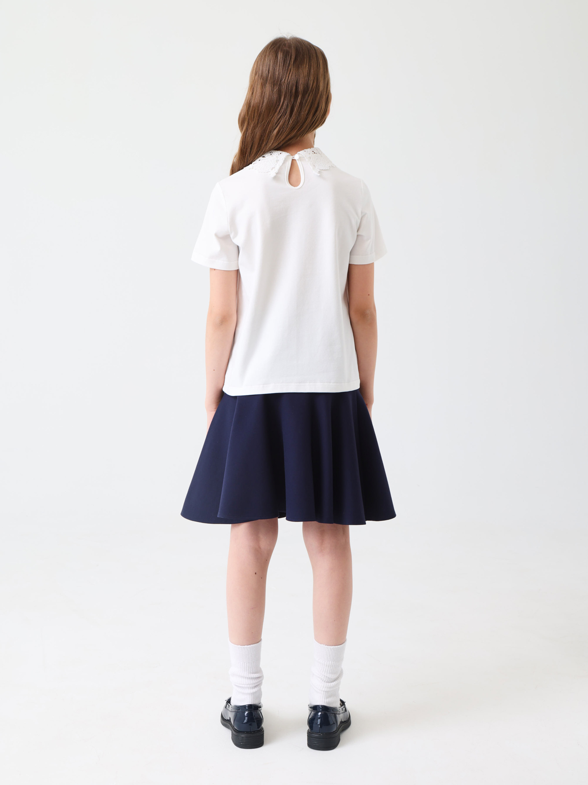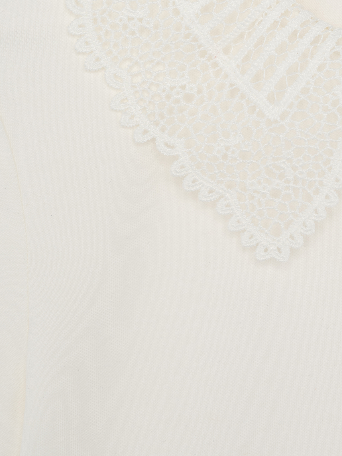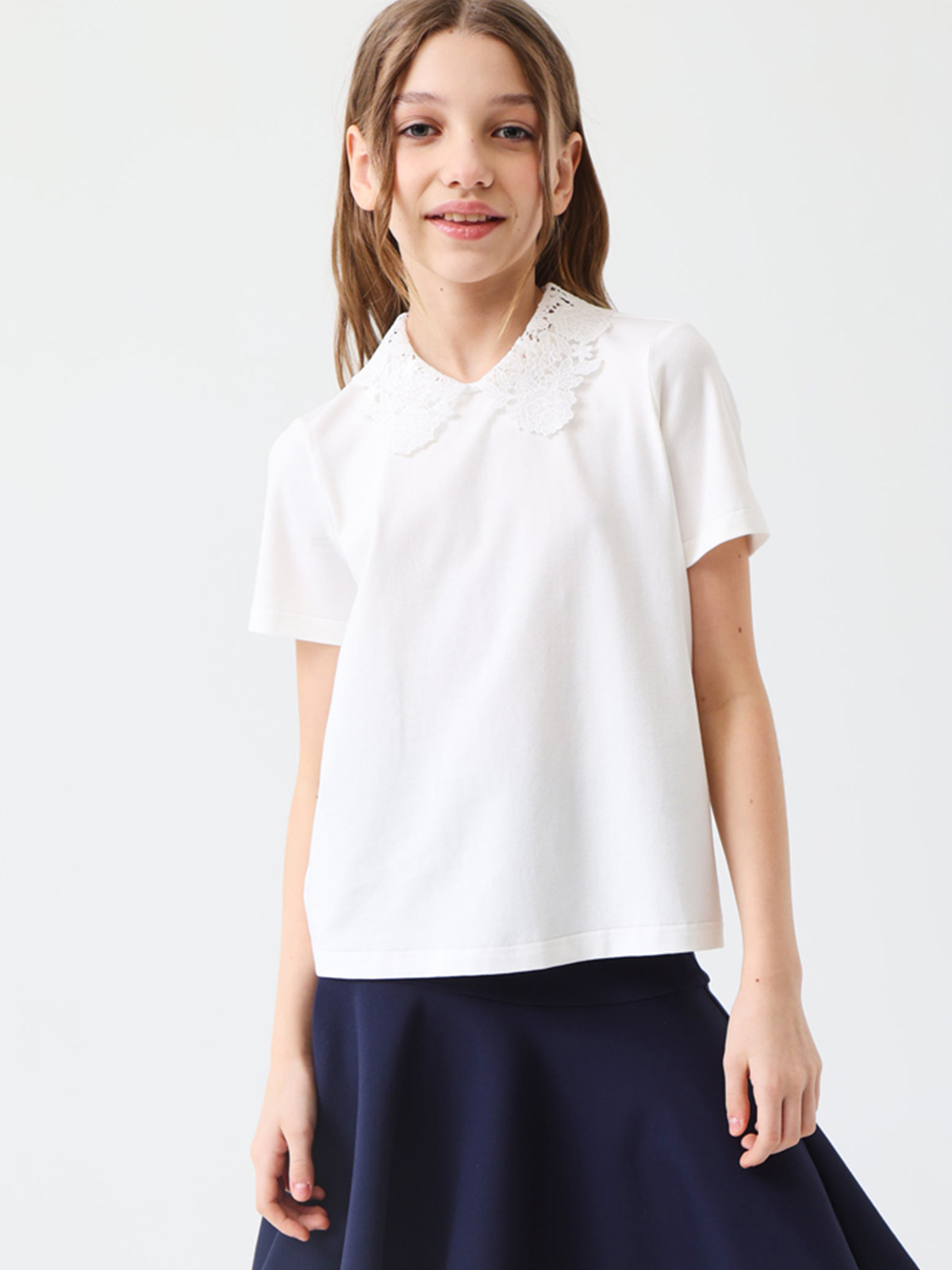 Трикотажный джемпер идеально подойдет для школы благодаря своему элегантному дизайну и практичности. Мягкое трикотажное полотно обеспечивает комфорт на весь день, а оригинальные детали добавляют образу утонченности. На спинке горловина оформлена вырезом «капля», аккуратно обработанным окантовкой, что создает изящный акцент. Круглый вырез горловины и рукава дополнены кружевом. Застежка выполнена в виде навесной петли из узкой резинки с пуговицей на ножке, расположенной на концах выреза по спинке.