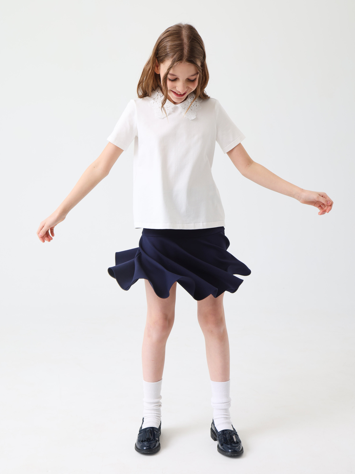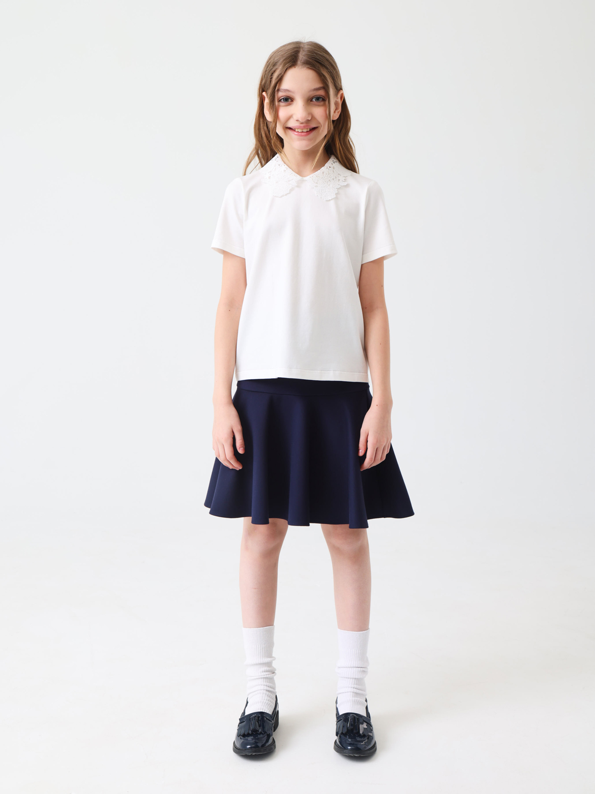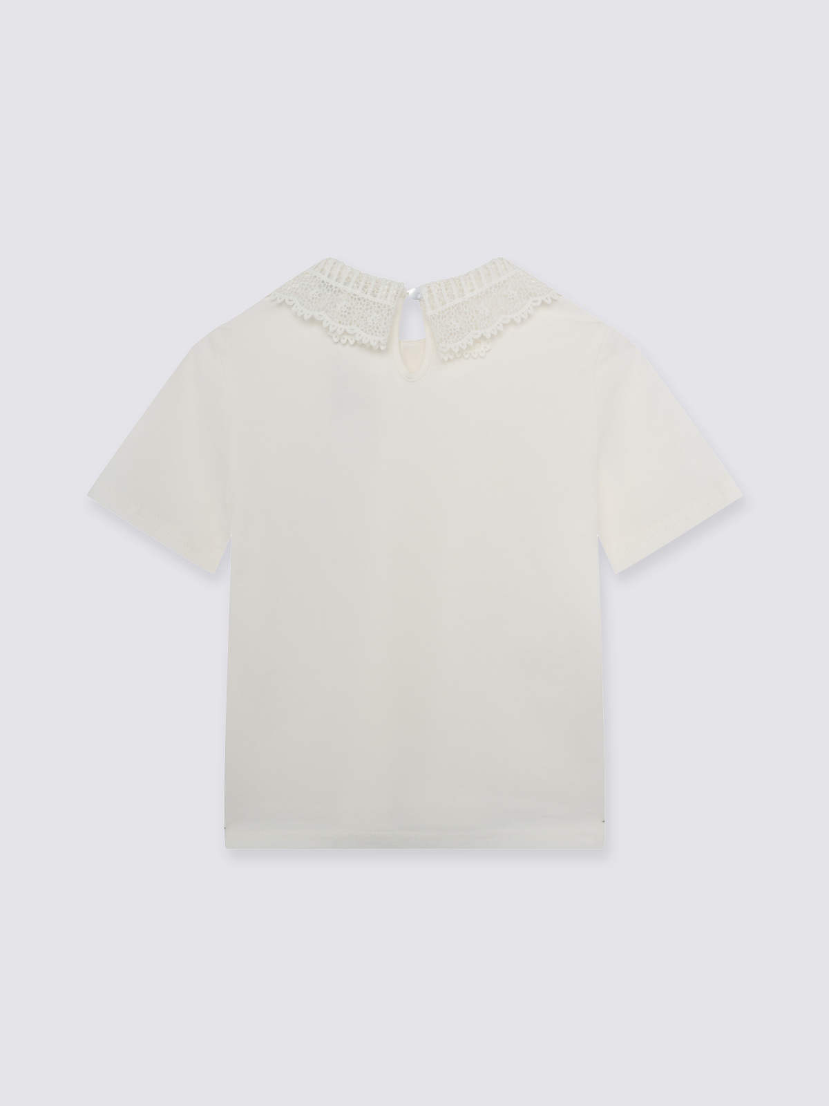 Трикотажный джемпер идеально подойдет для школы благодаря своему элегантному дизайну и практичности. Мягкое трикотажное полотно обеспечивает комфорт на весь день, а оригинальные детали добавляют образу утонченности. На спинке горловина оформлена вырезом «капля», аккуратно обработанным окантовкой, что создает изящный акцент. Круглый вырез горловины и рукава дополнены кружевом. Застежка выполнена в виде навесной петли из узкой резинки с пуговицей на ножке, расположенной на концах выреза по спинке.
