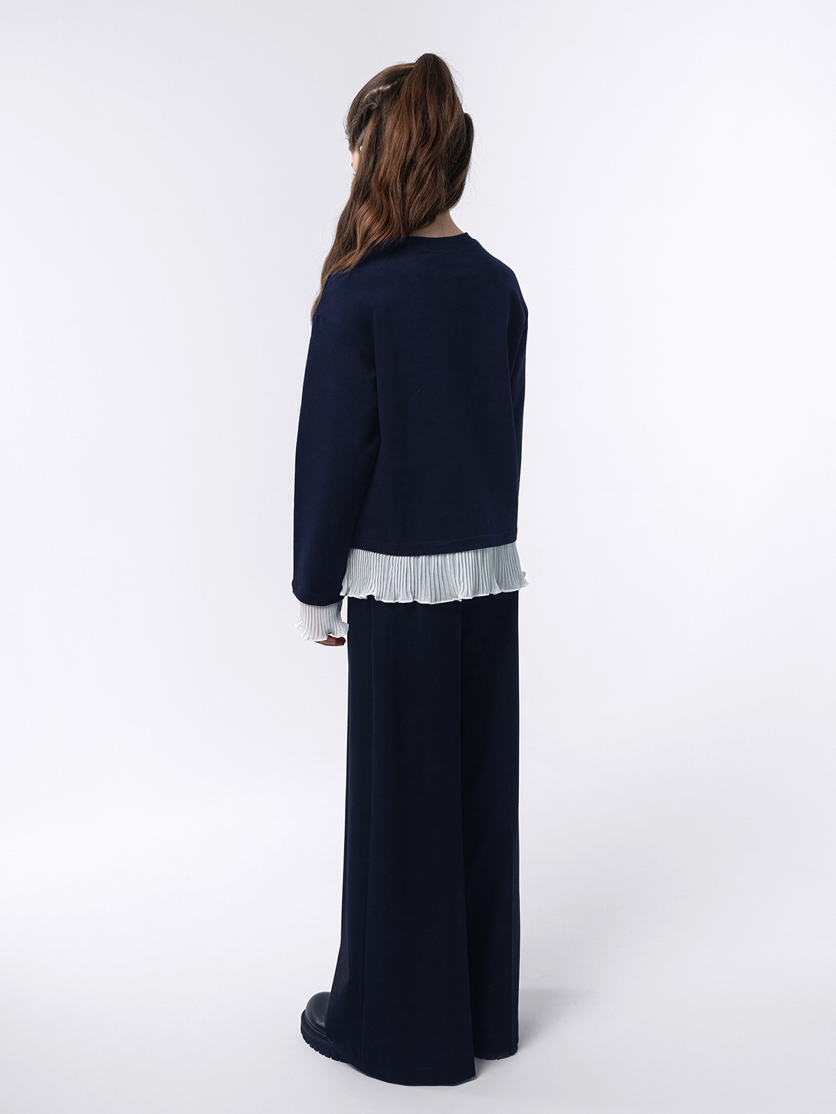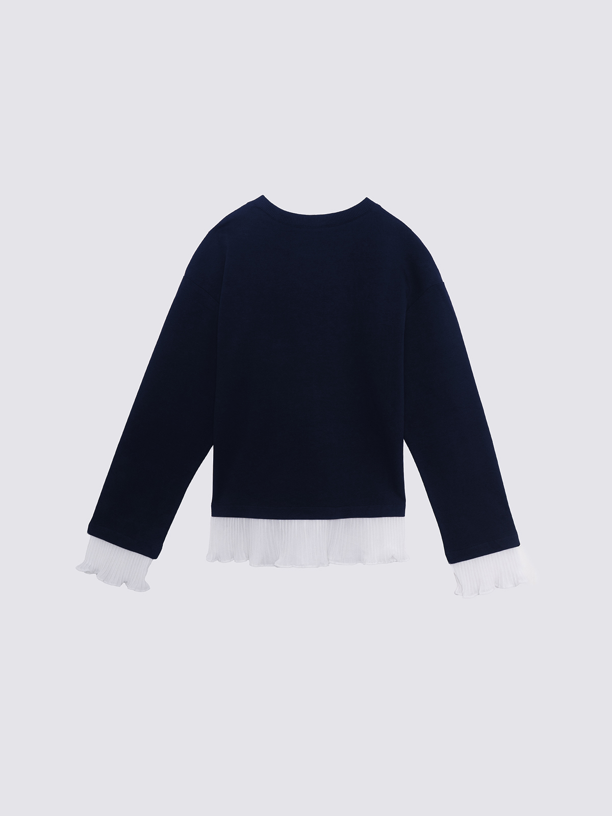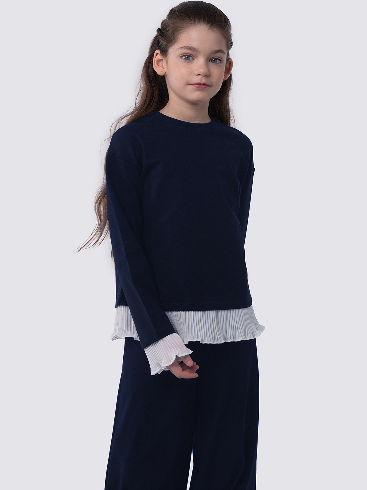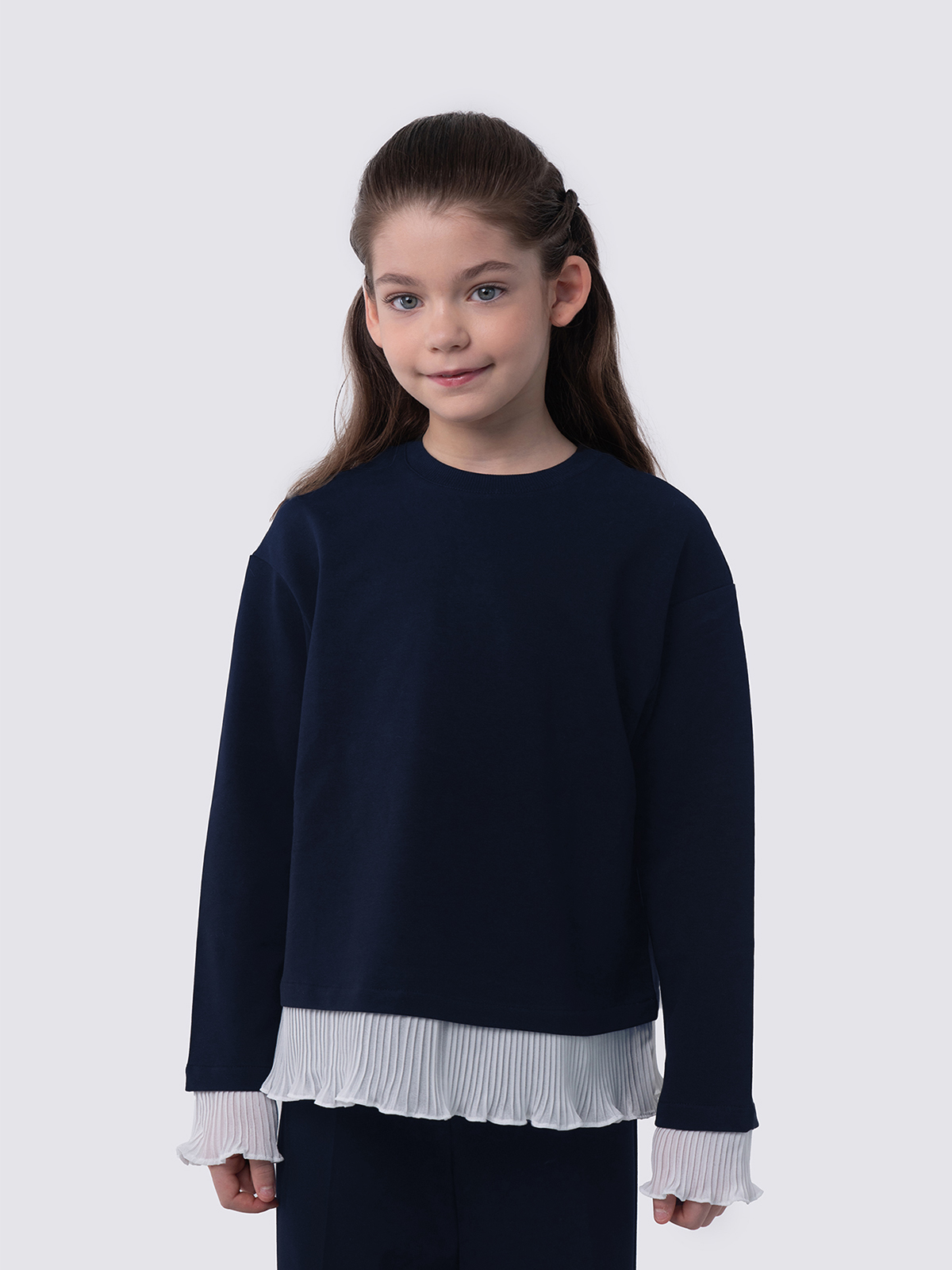 Трикотажный джемпер для девочки с имитацией удлиненной рубашки прямого силуэта с длинным втачным рукавом. Джемпер с высоким содержанием хлопка 95% и эластичными волокнами в составе обеспечивают комфорт в движении на протяжении всего дня.