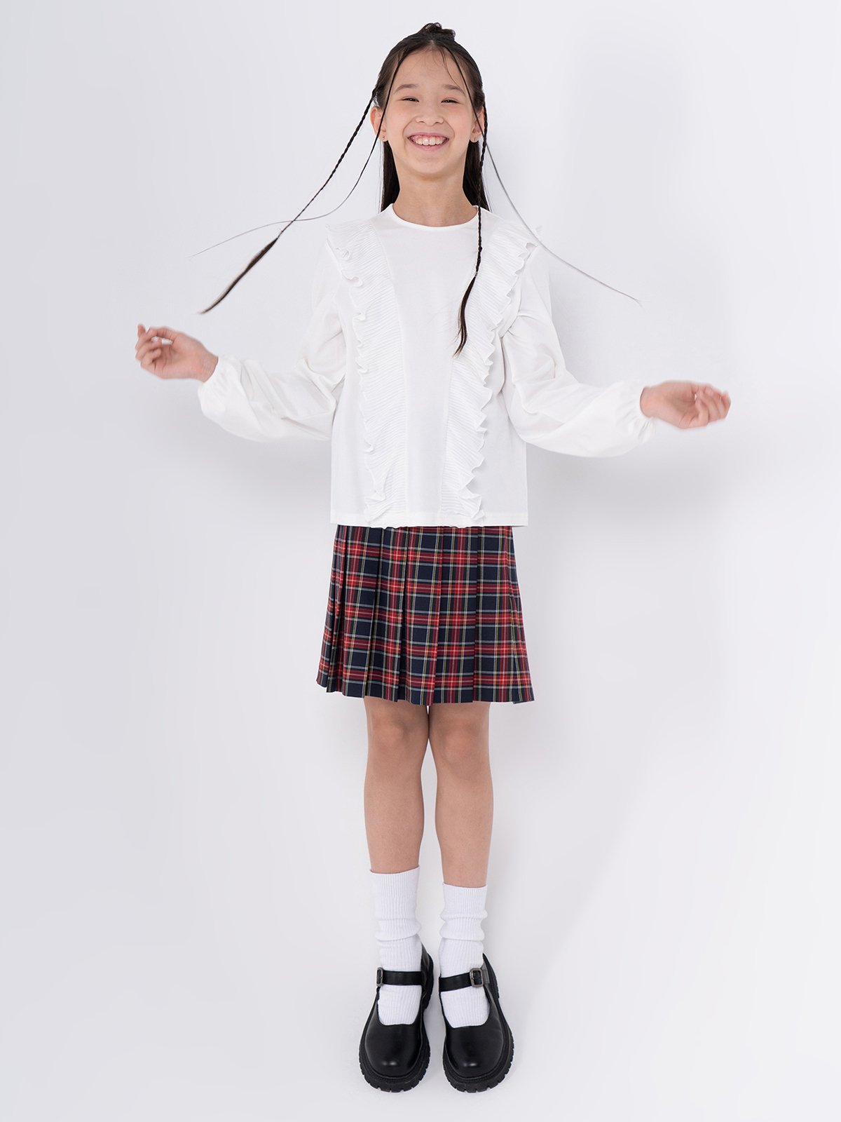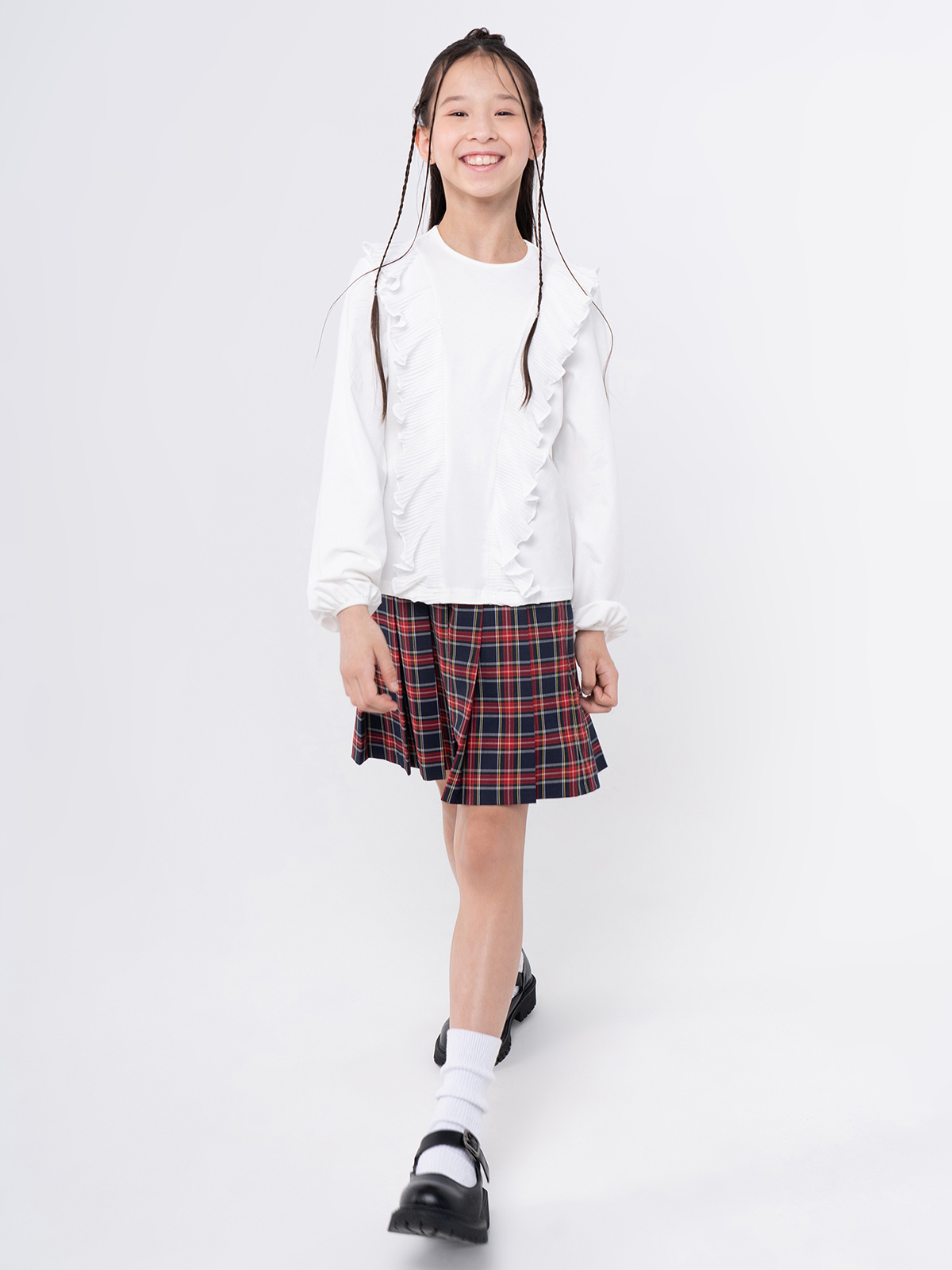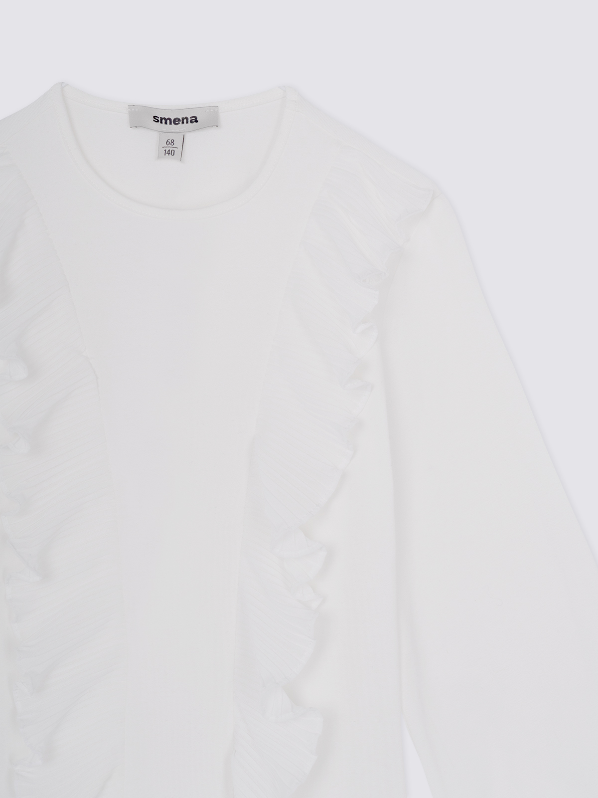 Нарядный джемпер для девочек идеально подойдет для школы и особых случаев. Особенность изделия заключается в оригинальном дизайне:передняя полочка украшена воланами, что добавляет образу легкость и изысканность.