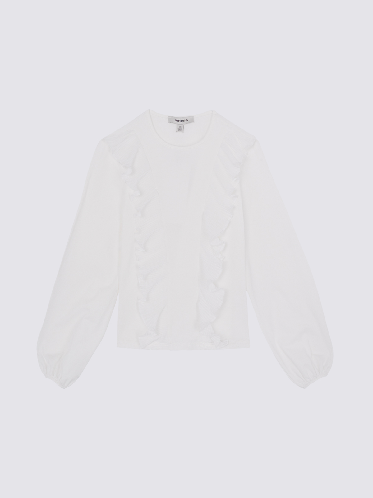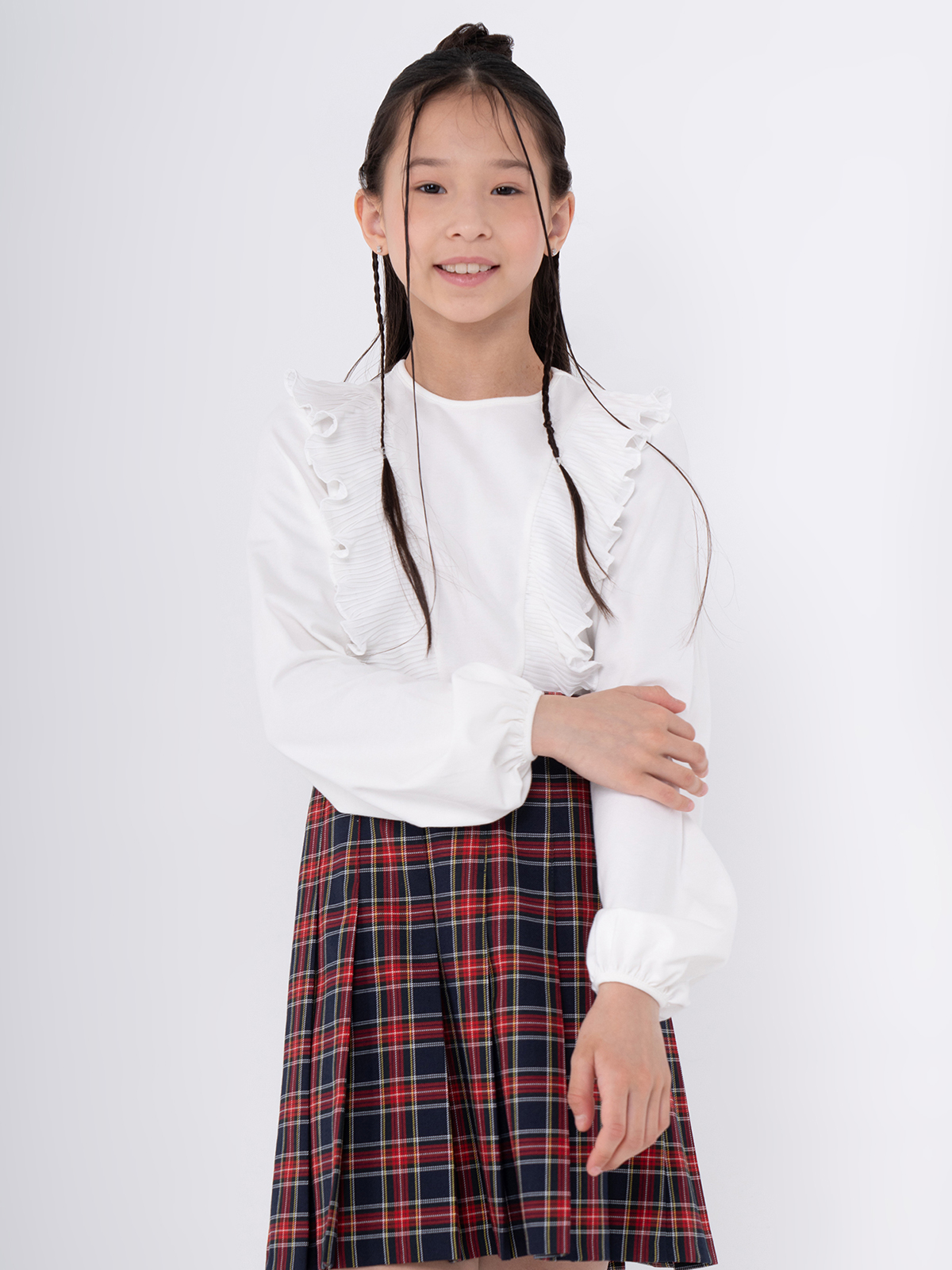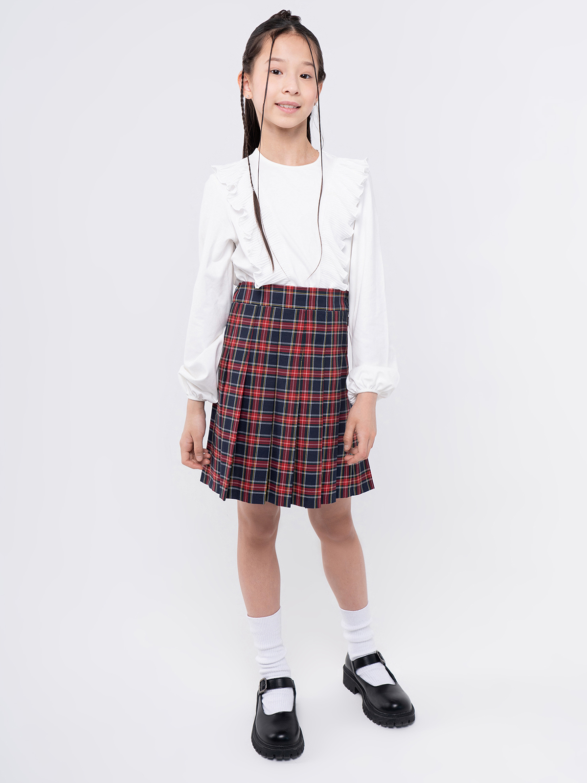 Нарядный джемпер для девочек идеально подойдет для школы и особых случаев. Особенность изделия заключается в оригинальном дизайне:передняя полочка украшена воланами, что добавляет образу легкость и изысканность.