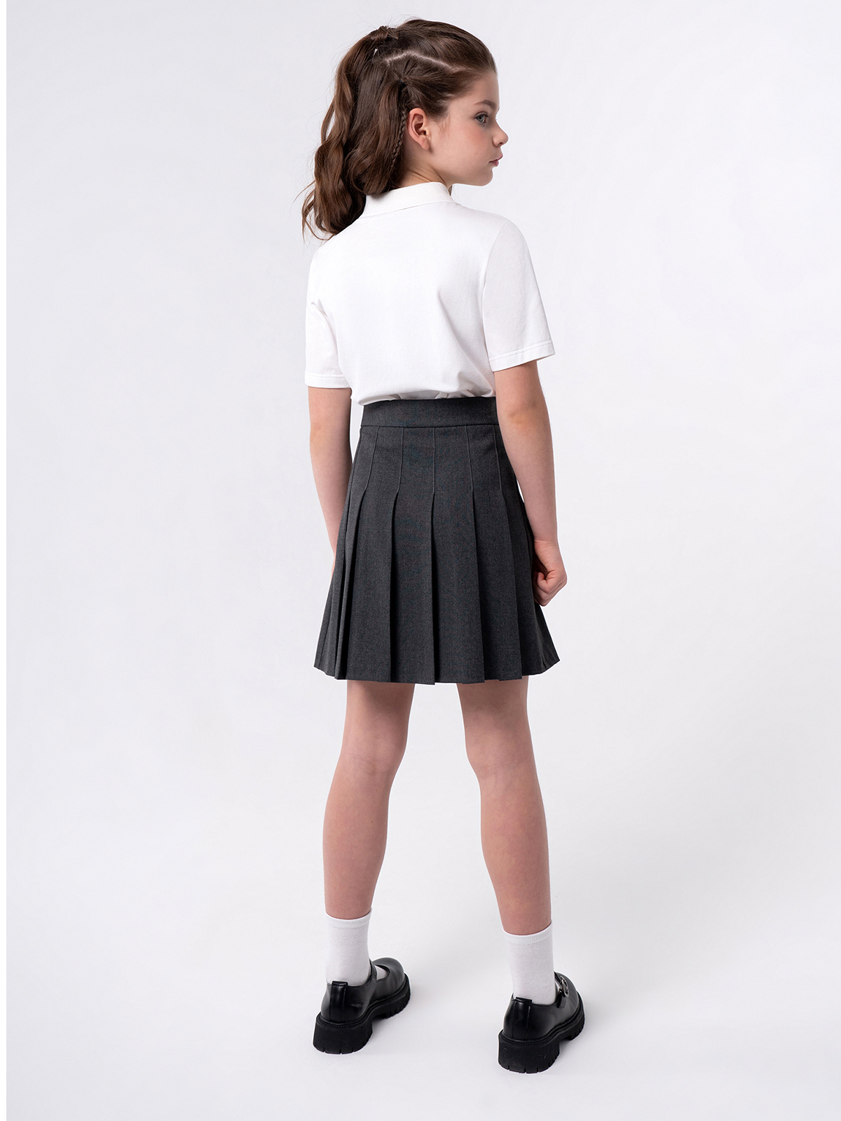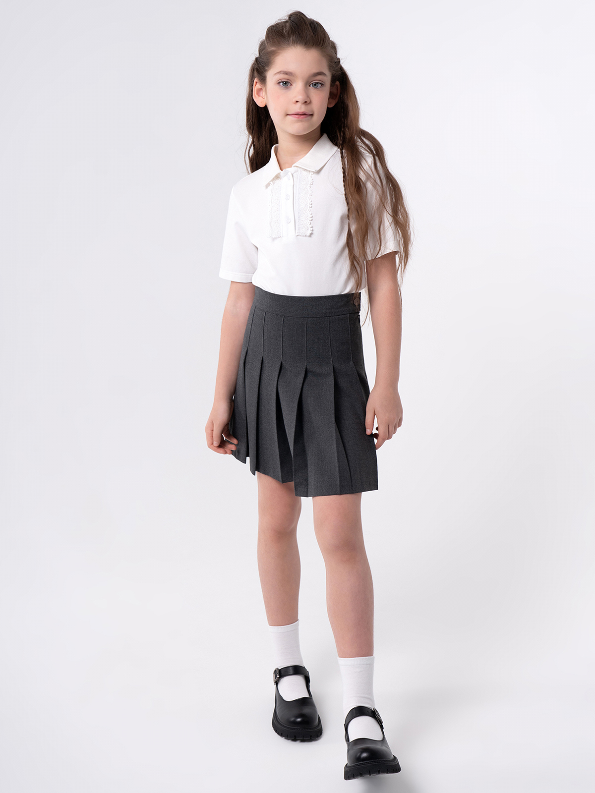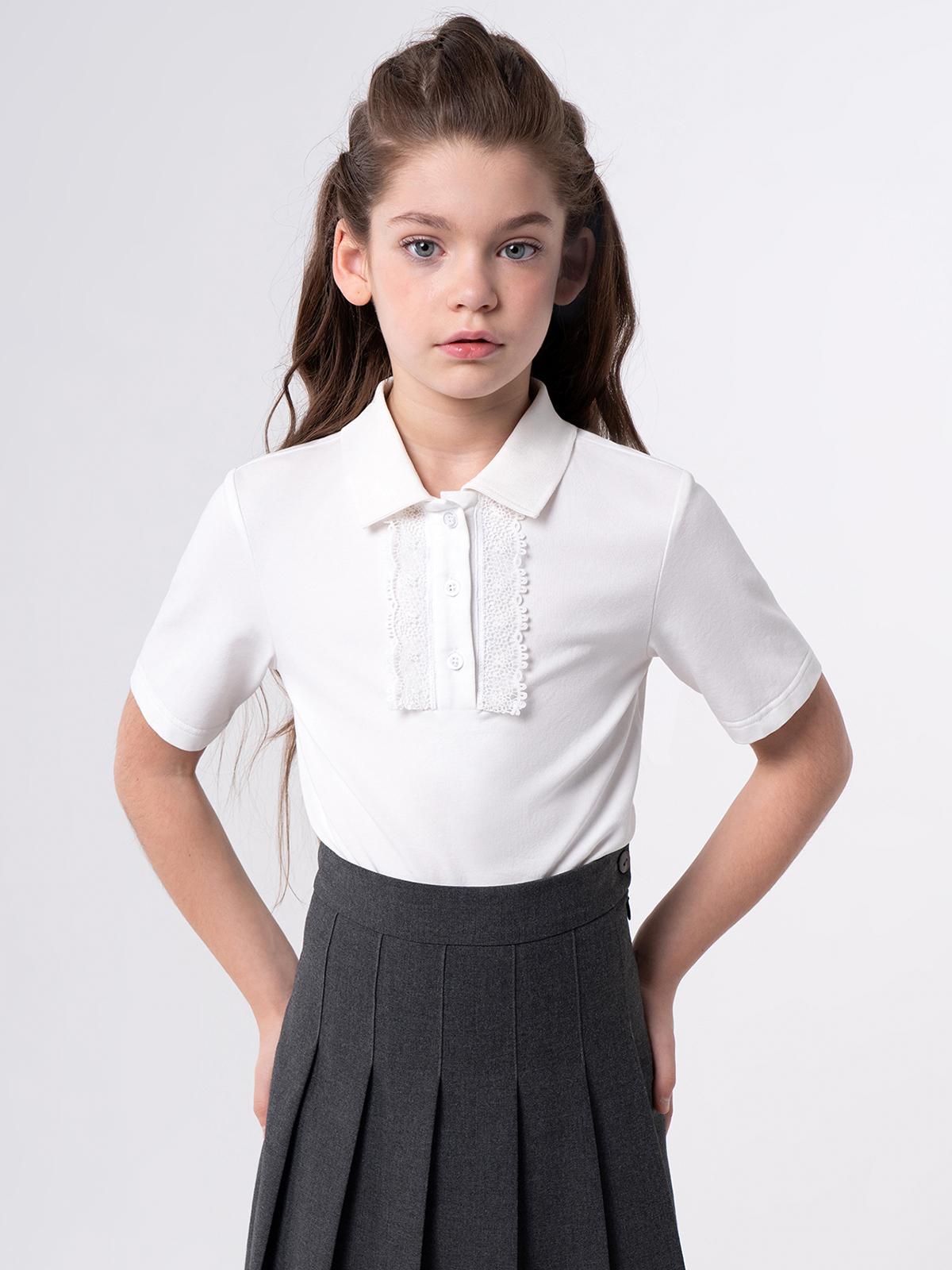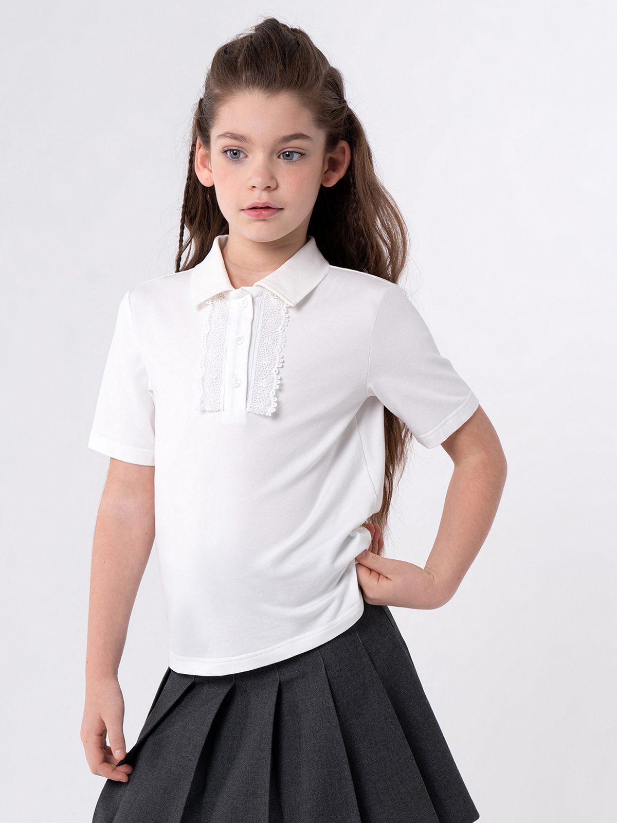 Трикотажное поло для девочки полуприлегающего силуэта с короткими рукавами. Воротник отложной со стойкой . Застегивается на пуговицы расположенные на притачной планке, украшенной кружевом.