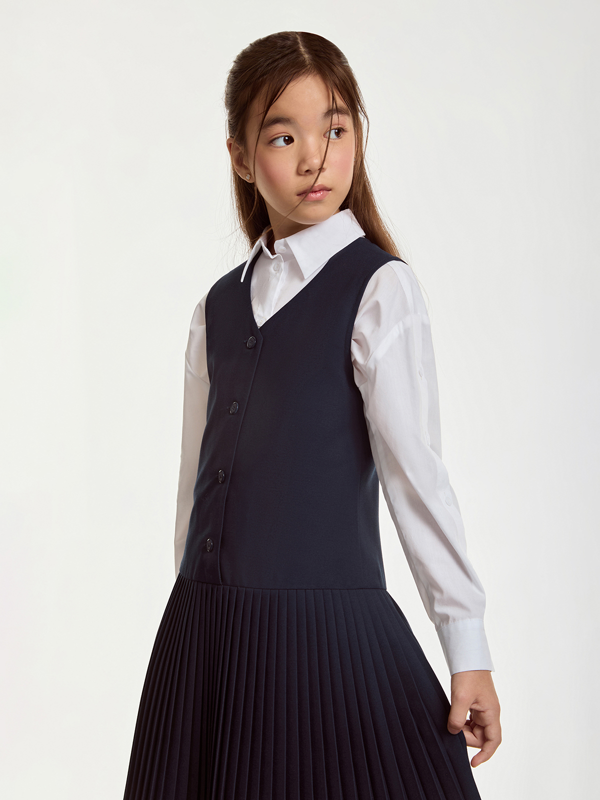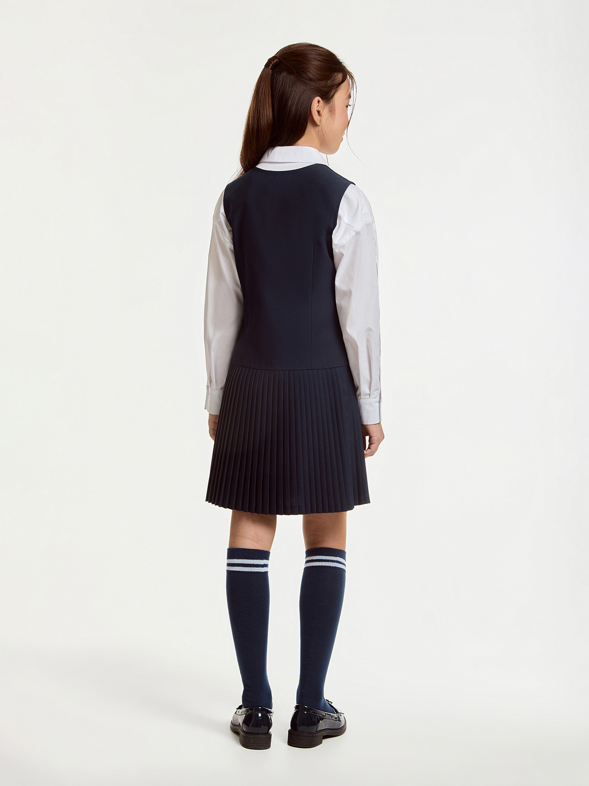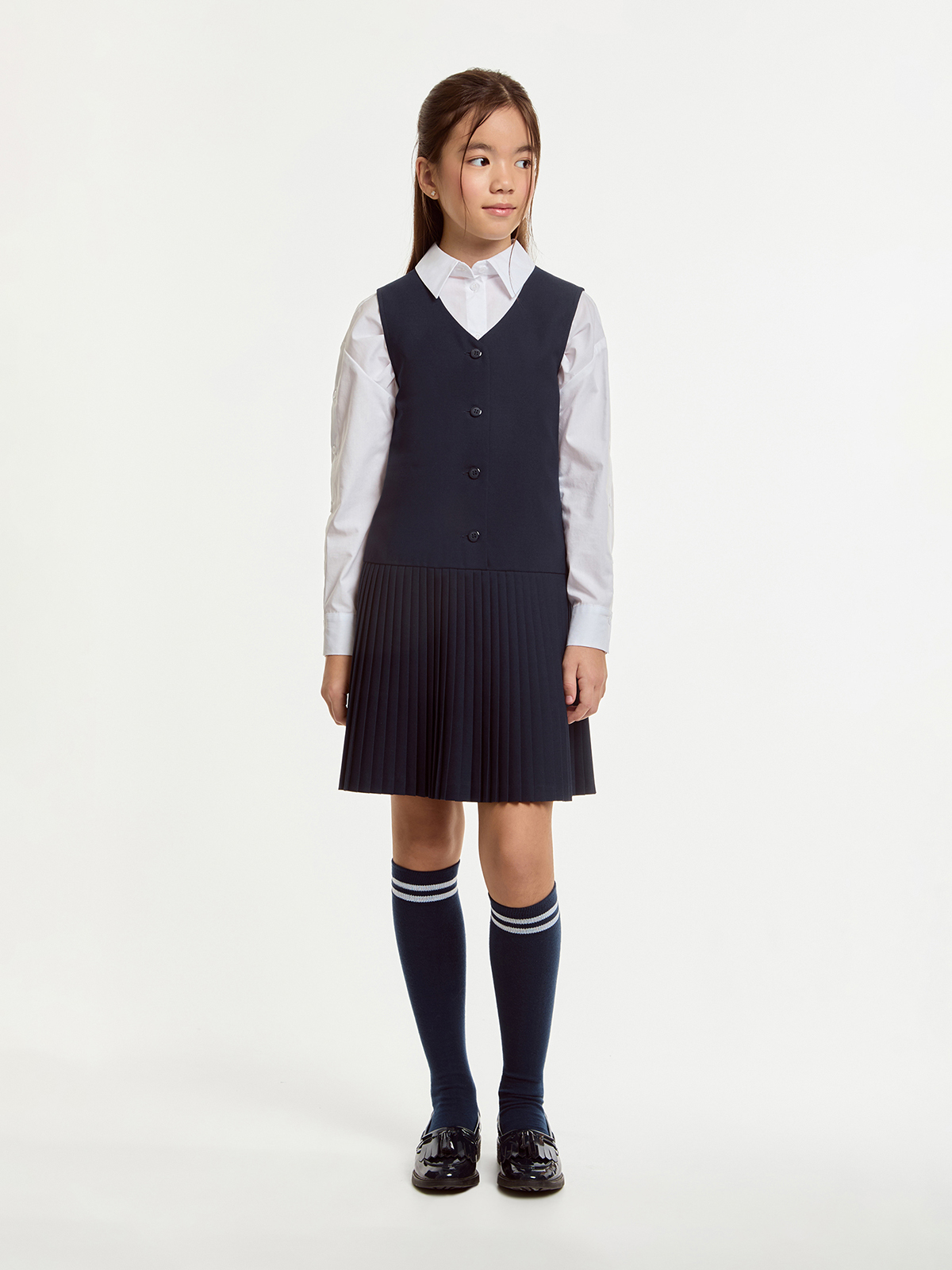Классический сарафан из износостойкой и устойчивой к смятию костюмной поливискозы. Полуприлегающий силуэт с заниженной линией талии не сковывает движения и отлично сидит на любом типе фигуры. Отрезная плиссированная юбка прекрасно держит форму за счет свойств используемого материала. Застегивается на пуговицы по центру полочки. Вырез горловины V-образной формы. Отличный вариант на каждый день