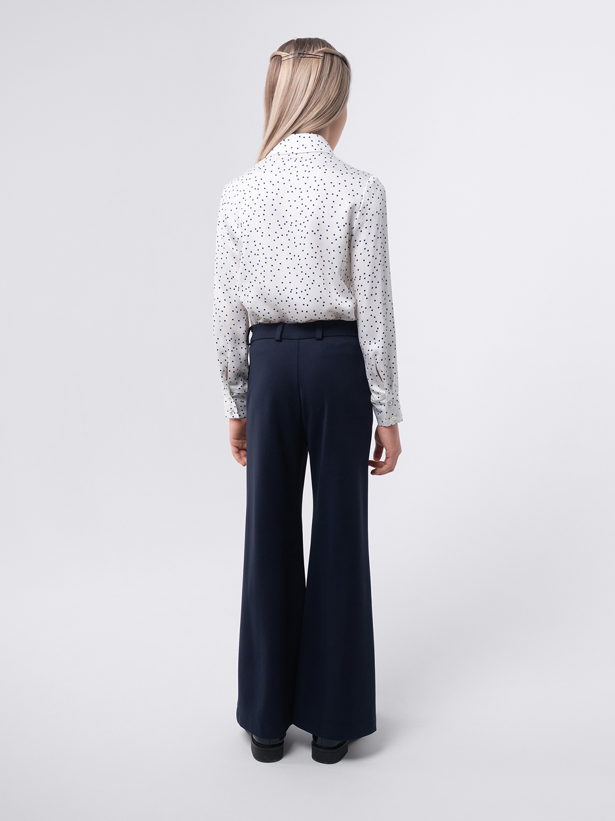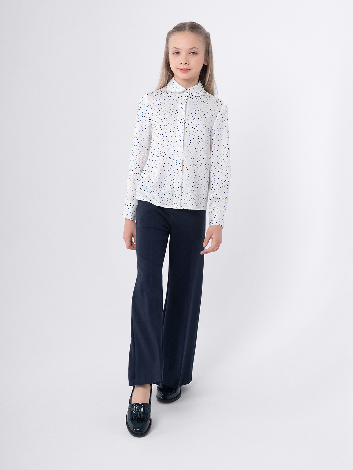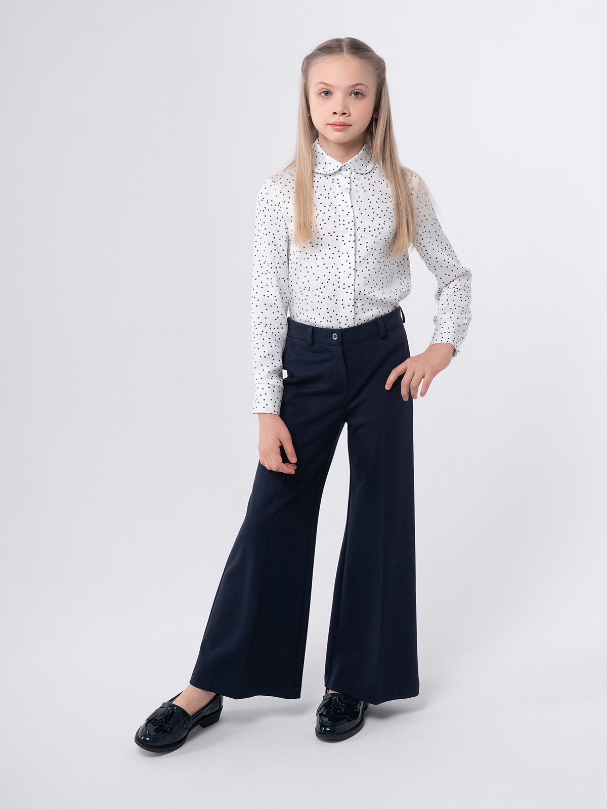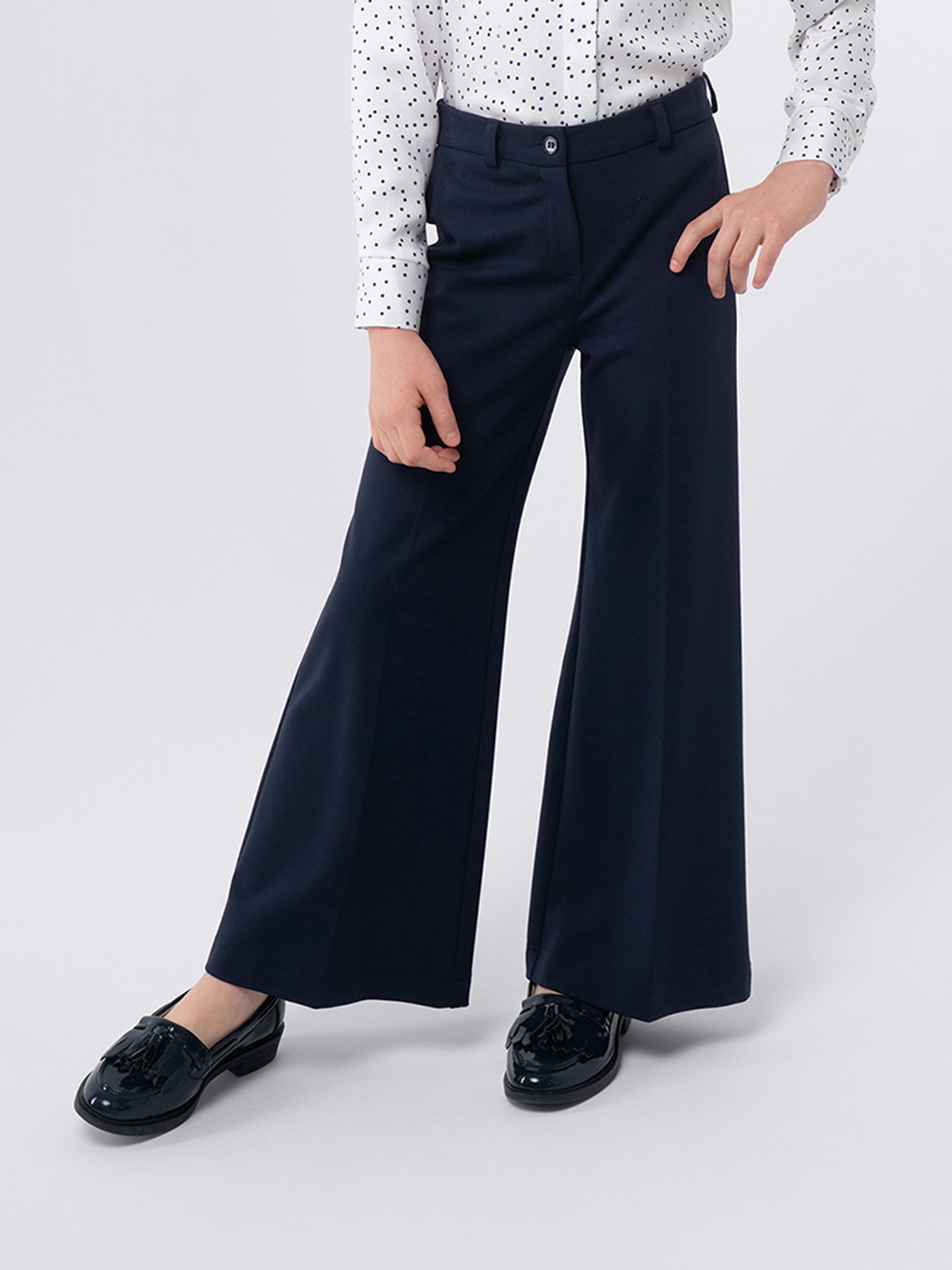 Расклешеные брюки со стрелками для девочек изготовлены из немнущейся костюмной ткани высокого качества, которая идеально подходит для брюк данного фасона. Расширяющийся силуэт, высокая талия и пояс на резинке не стесняют движений. Брюки имеют карманы достаточной глубины.