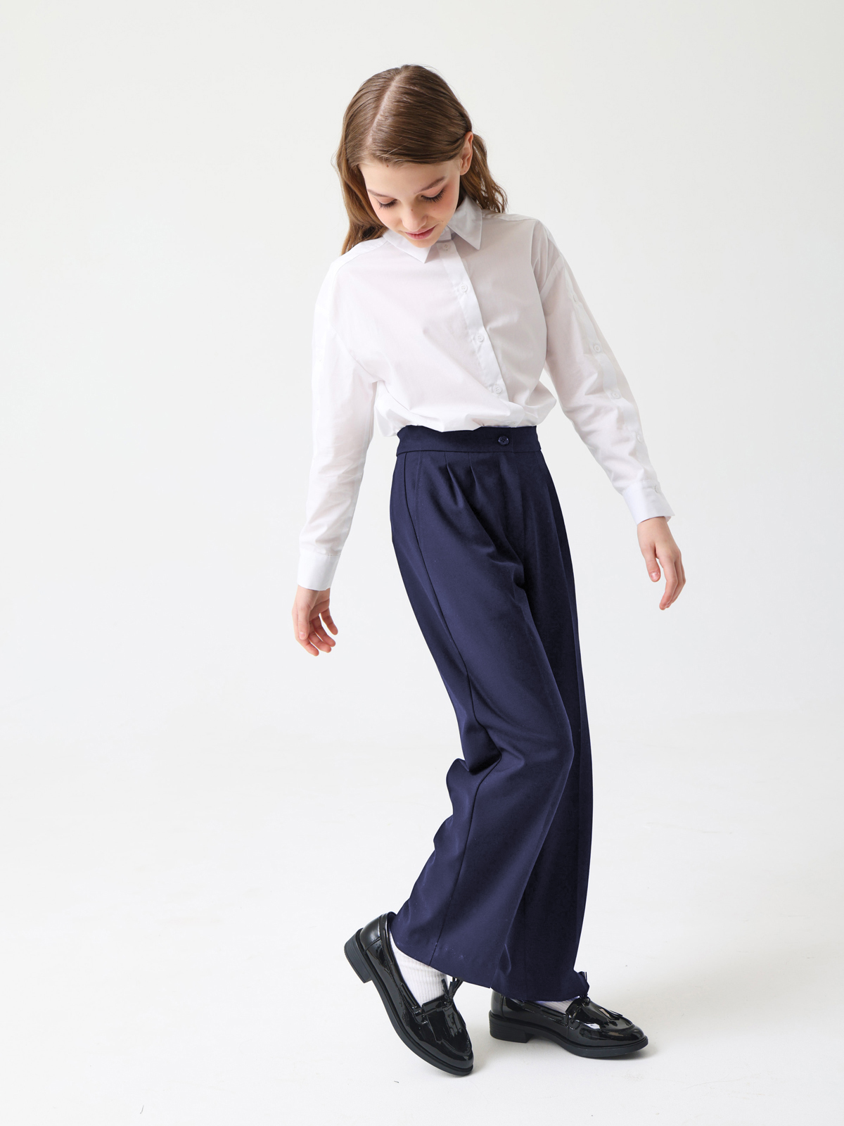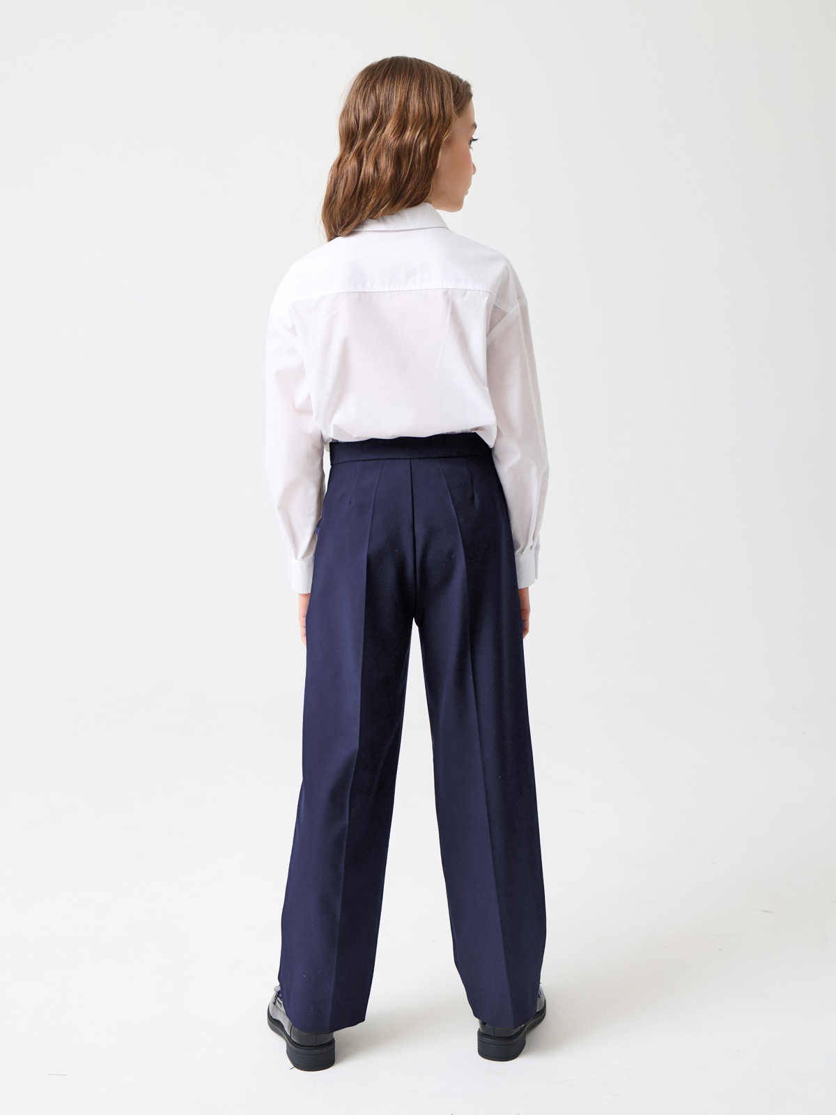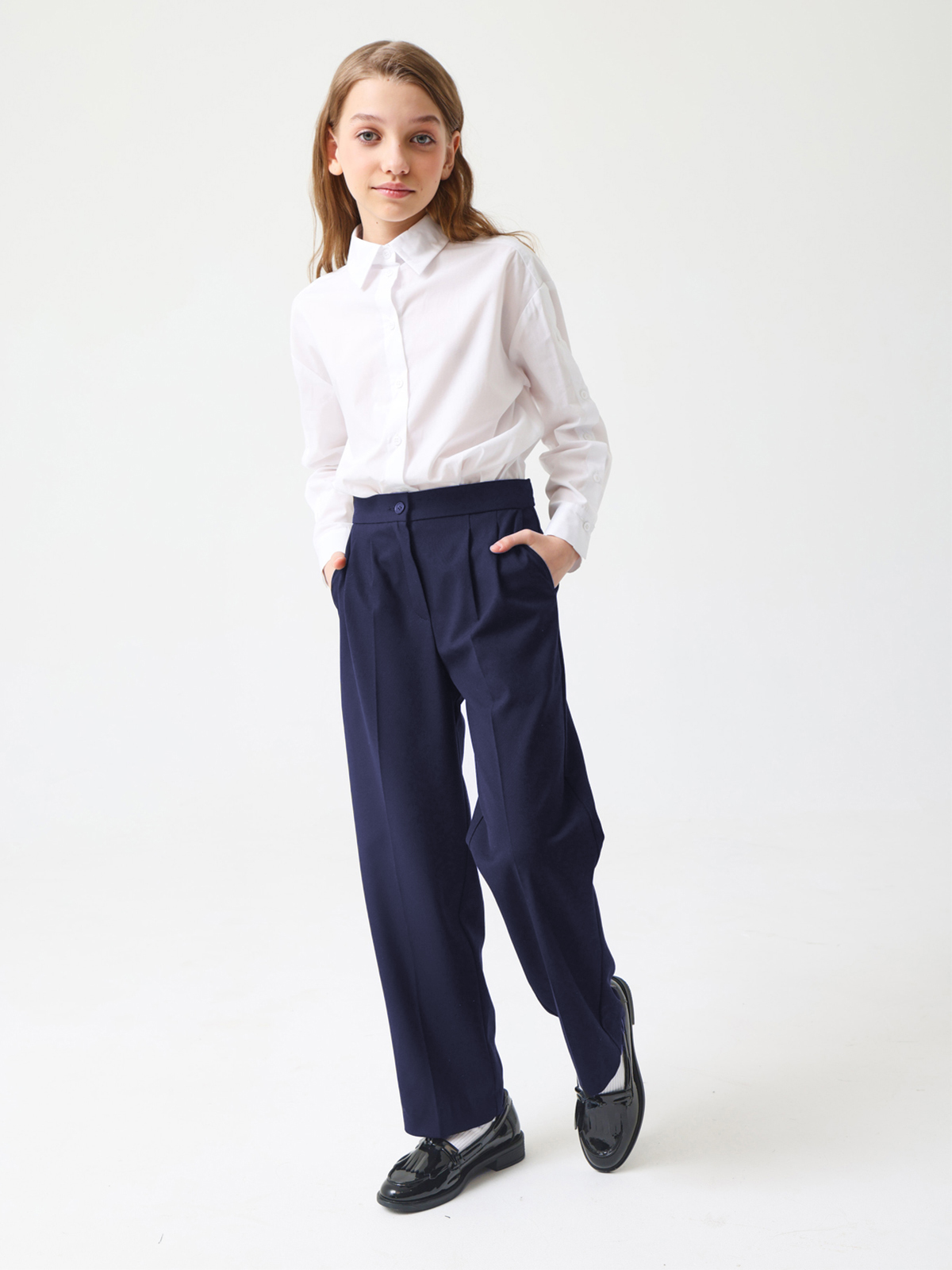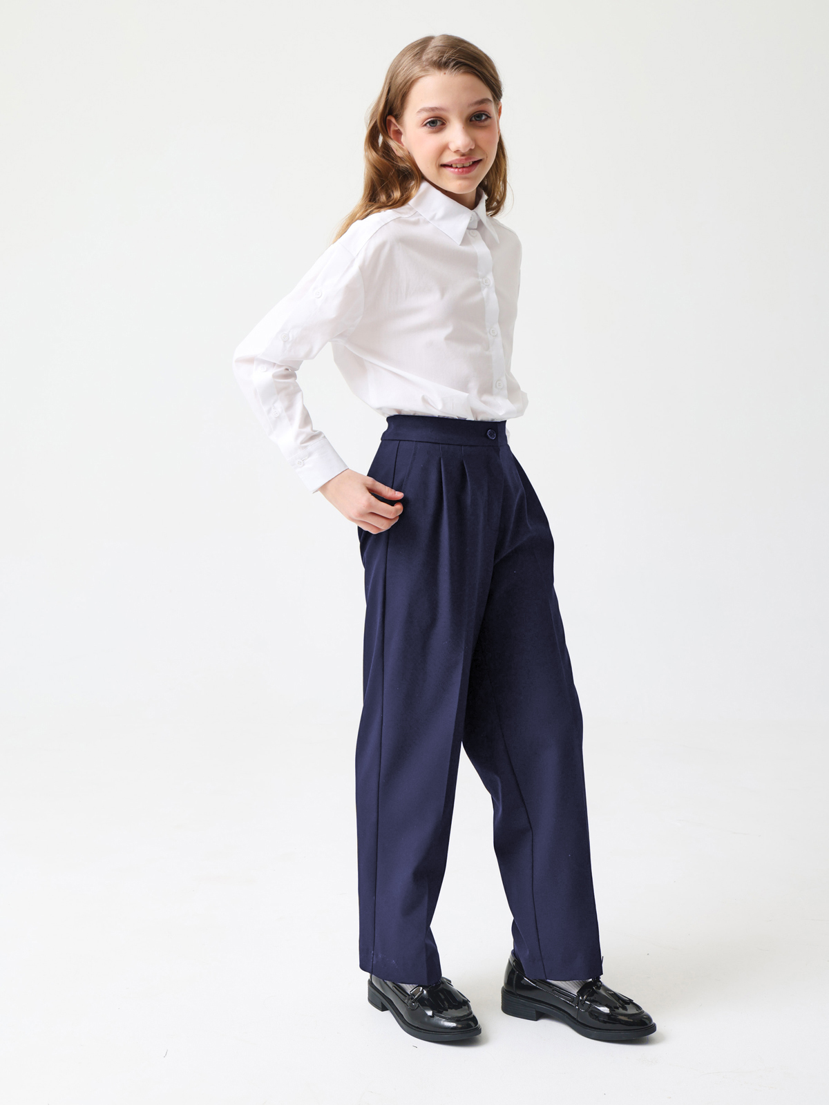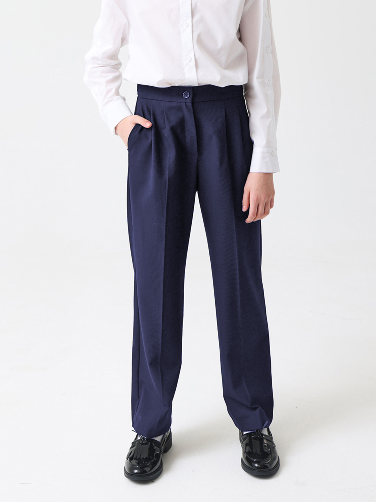 Прямые брюки со стрелками для девочек изготовлены из немнущейся костюмной ткани высокого качества, которая идеально подходит для брюк данного фасона. Высокая талия и пояс на резинке не стесняют движений. Застежка на молнии, петлю и пуговицу на поясе.Брюки имеют карманы достаточной глубины. Брюки элегантно смотрятся на девочках любого роста.