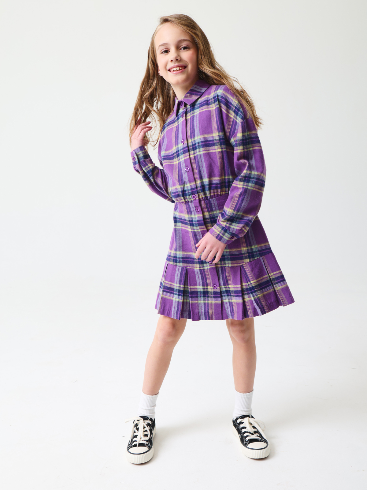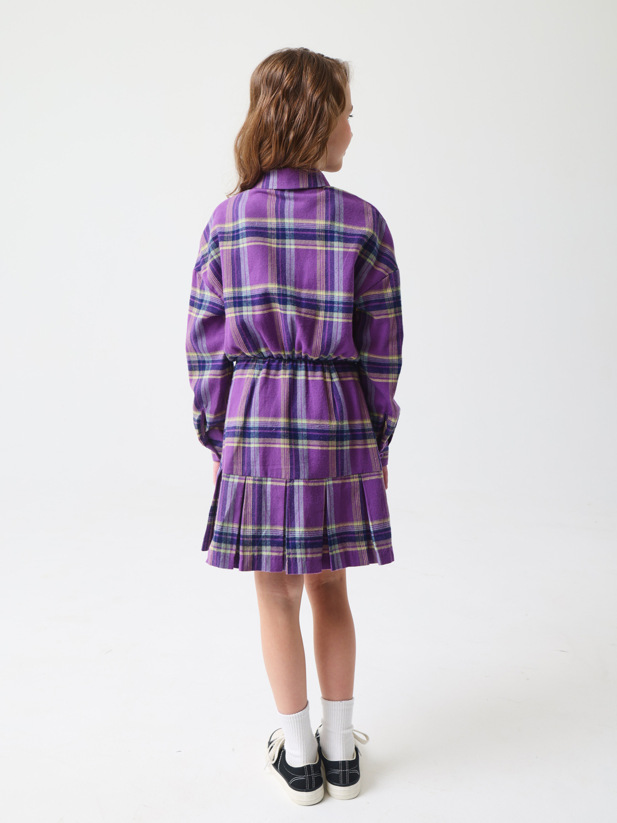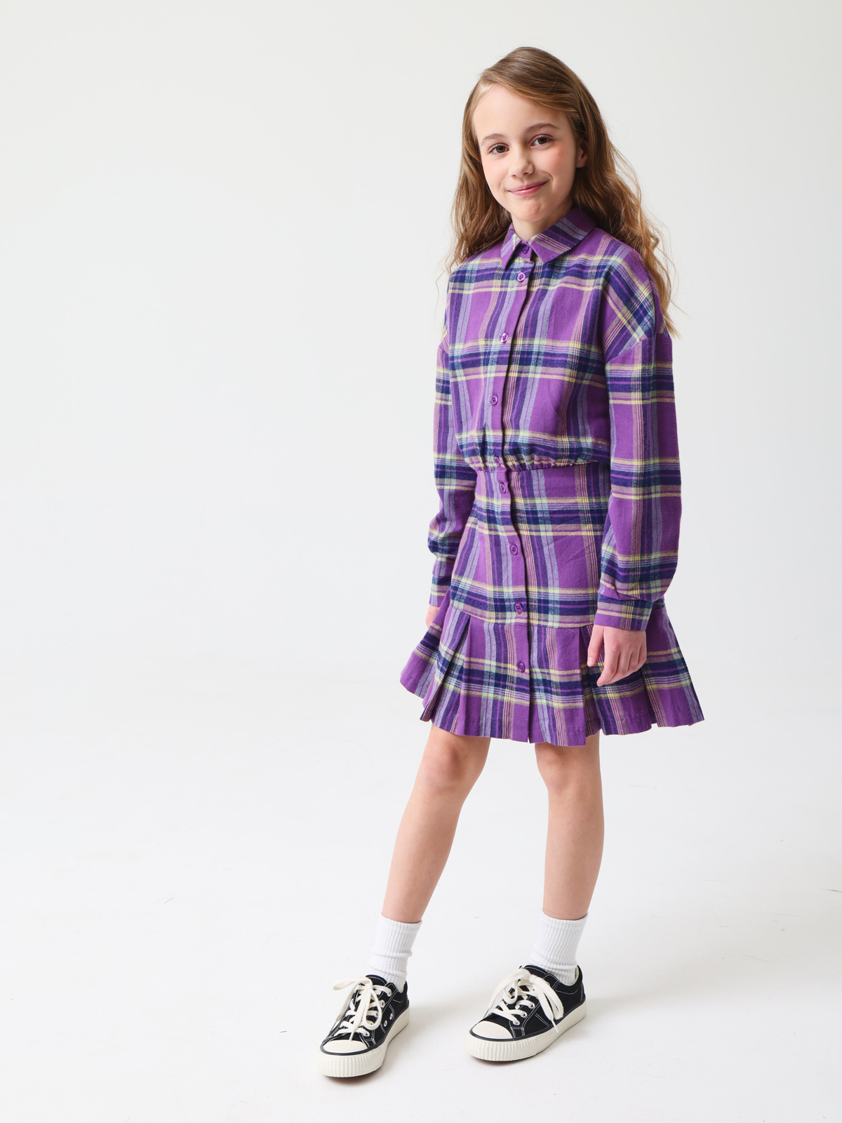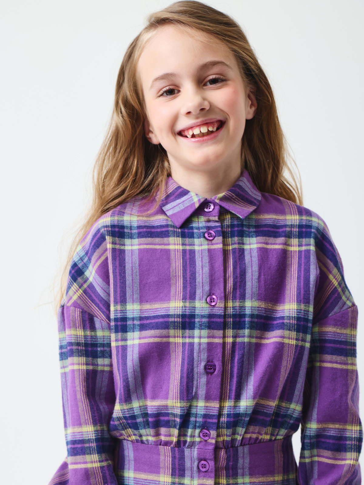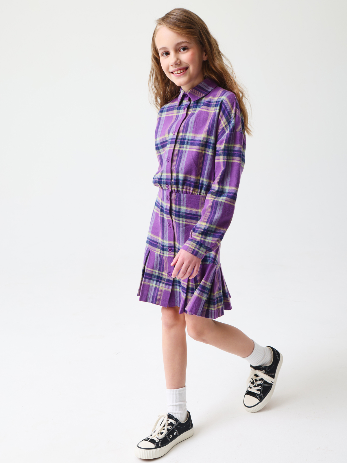 Приталенное платье-рубашка в клетку. Модель дополнена центральную застежкой на пуговицы и длинными прямыми рукава с манжетами. Юбка платья из верхней расклешенной части и нижней части - в складку. Фланель защитит от холода, а трендовая клетка впишется как в кэжуал-образ, так и в женственный лук. Доступно в 2 цветах.