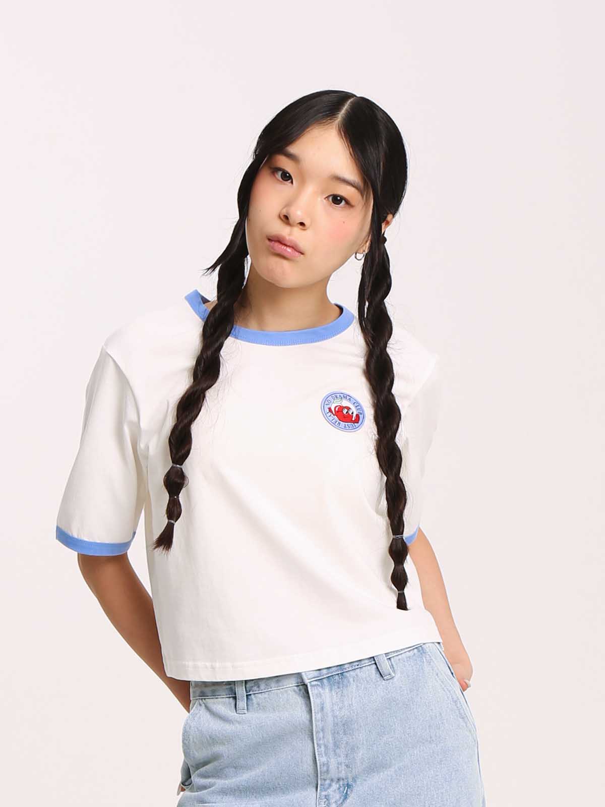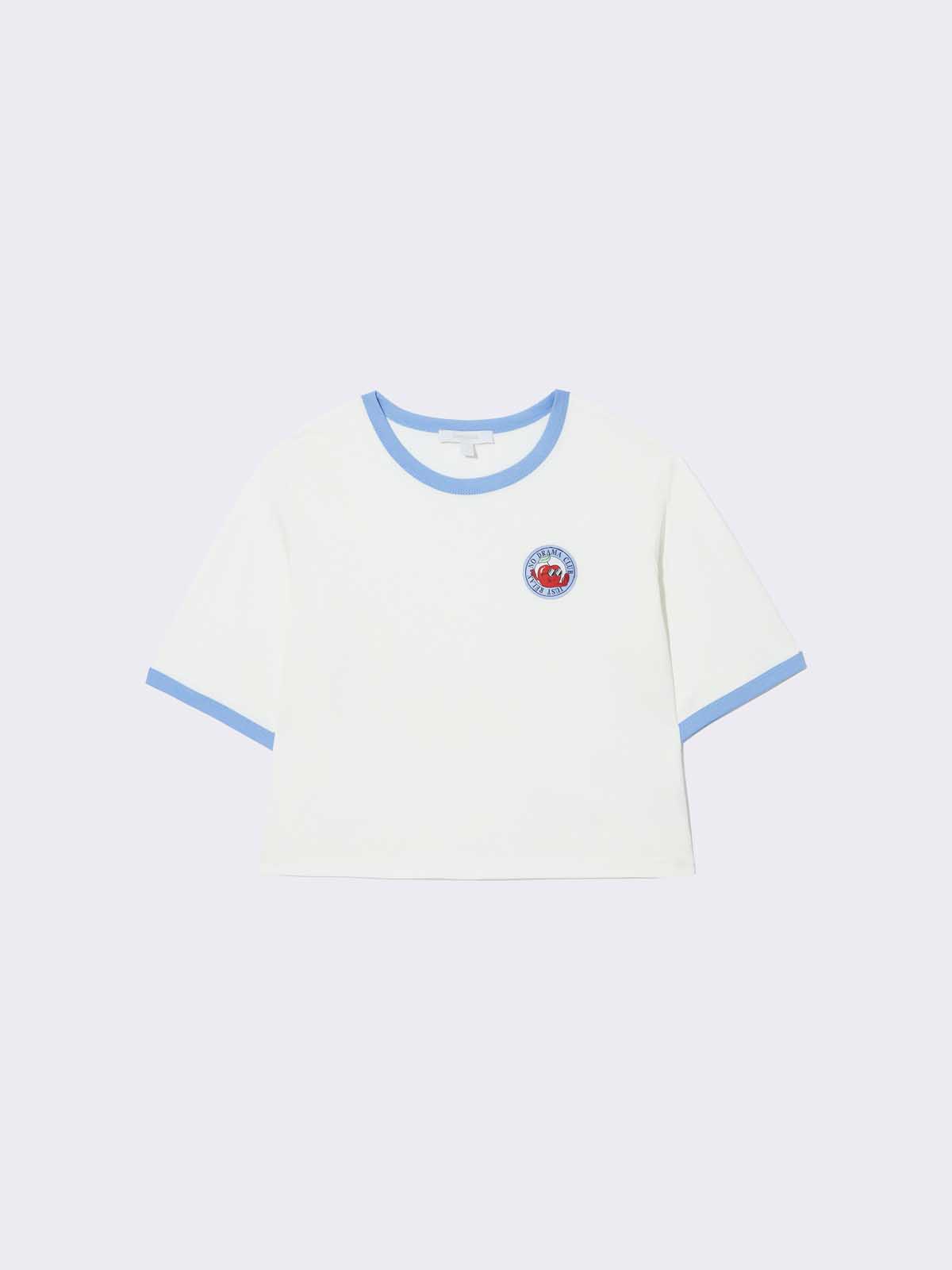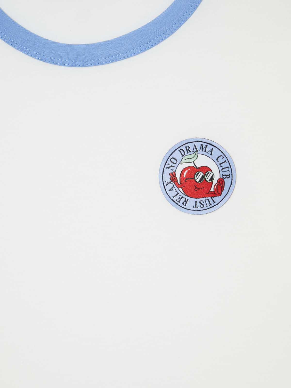 Укороченная футболка для девочки из 100% хлопка. Свободный прямой силуэт и приспущенное плечо. Круглый вырез горловины. Оверсайз силуэт даёт возможность расслабиться и показать всем твою уверенность. Контрастная окантовка и патч с вишней и надписью NO DRAMA CLUB. JUST RELAX (с англ. «никакого драматического клуба. просто расслабься») насыщают футболку деталями. Размерный ряд 128 – 176 см.