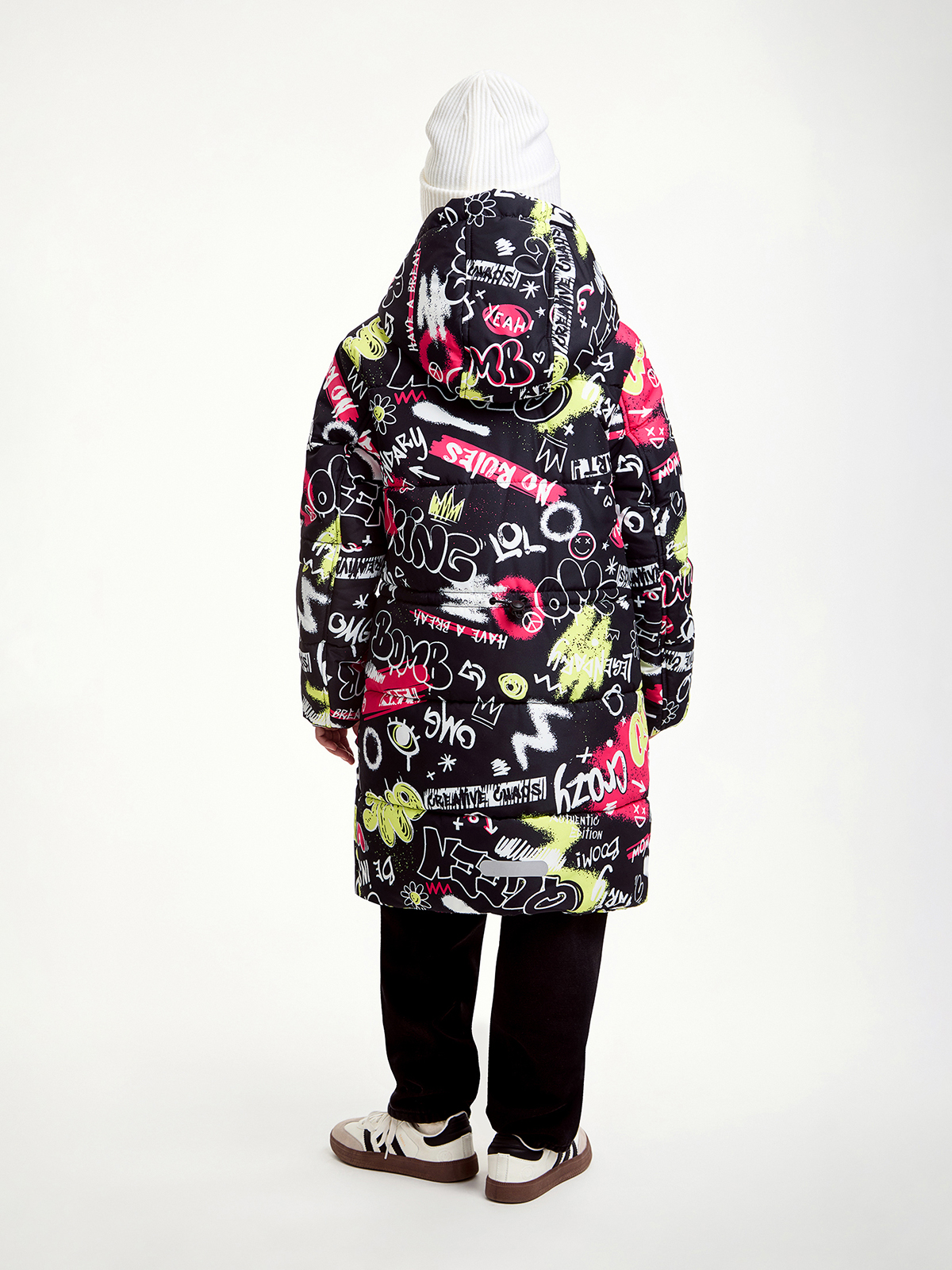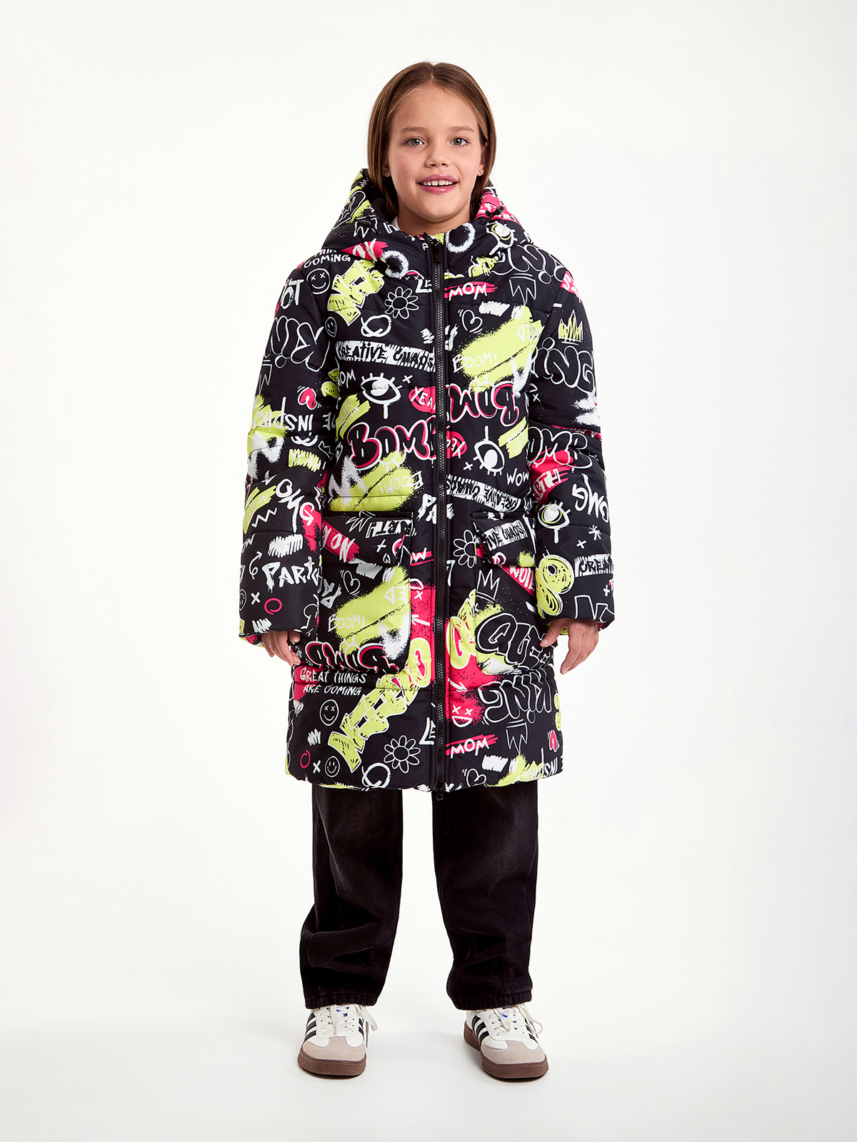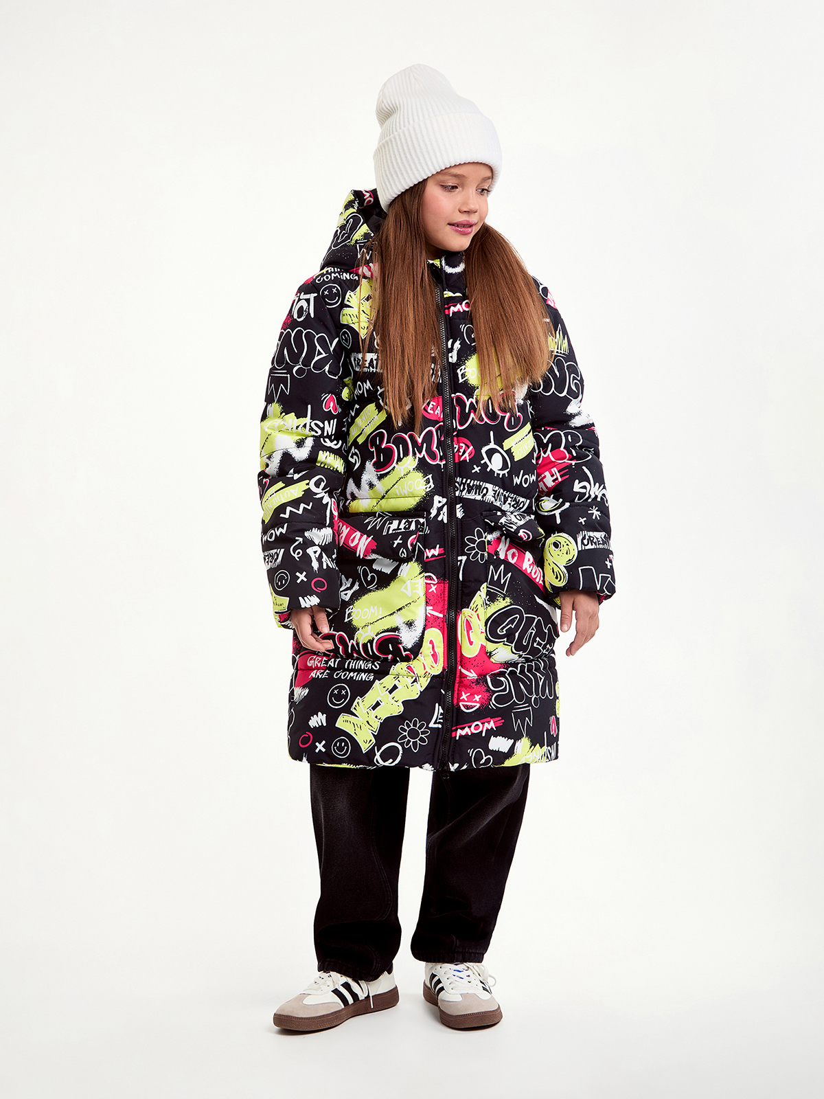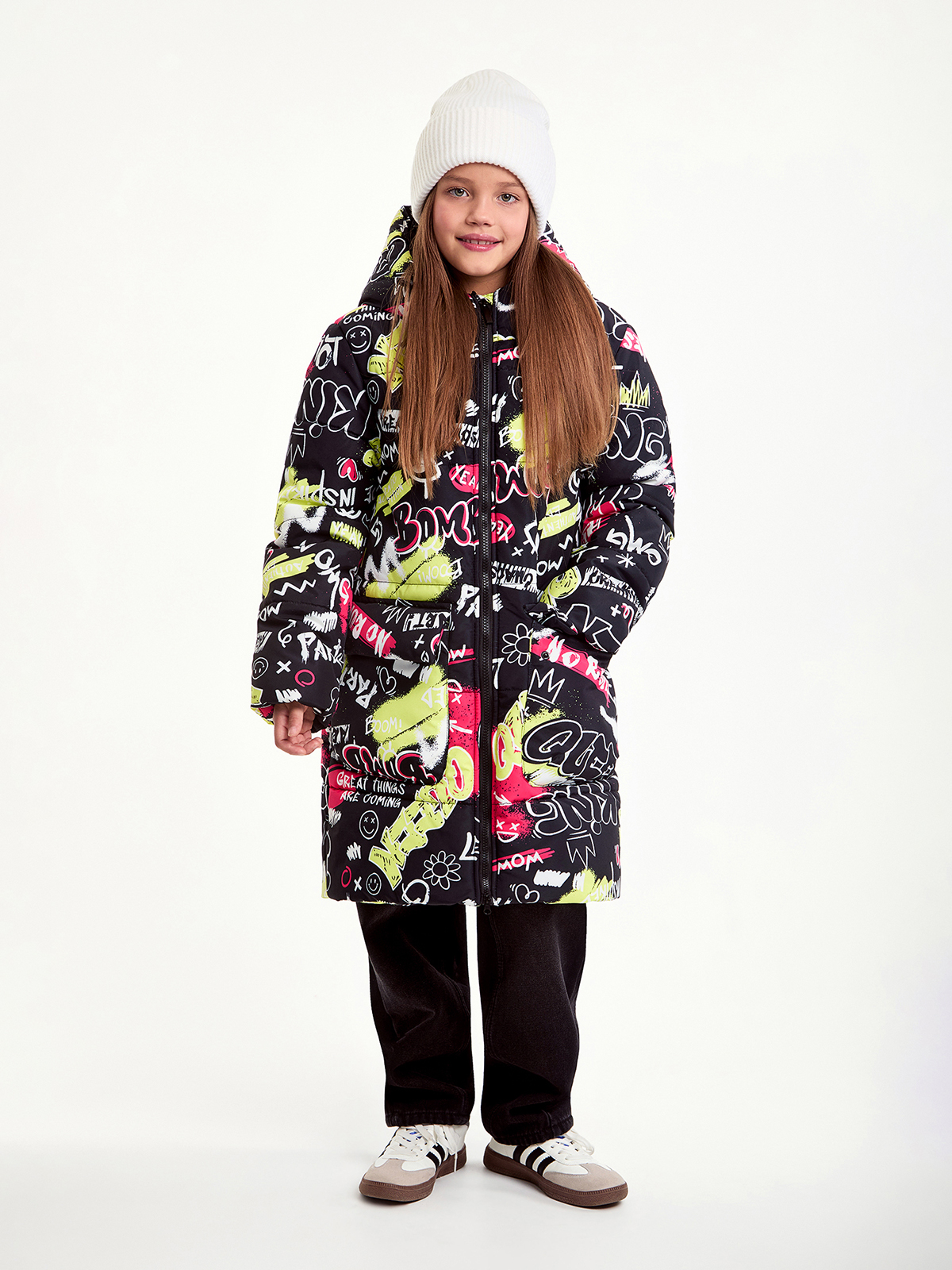 Зимняя удлиненная куртка для девочки прямого силуэта. Куртка изготовлена из плотного материала с водонепроницаемым мембранным покрытием и ветрозащитой. Утеплитель пластовой синтепон 280 гр/м2. Такое утепление подойдет на сильные морозы до -30 градусов. Дополнена несъемным капюшоном, боковыми глубокими карманами на молнии. Выделяется ярким, притягивающим взгляд, принтом.