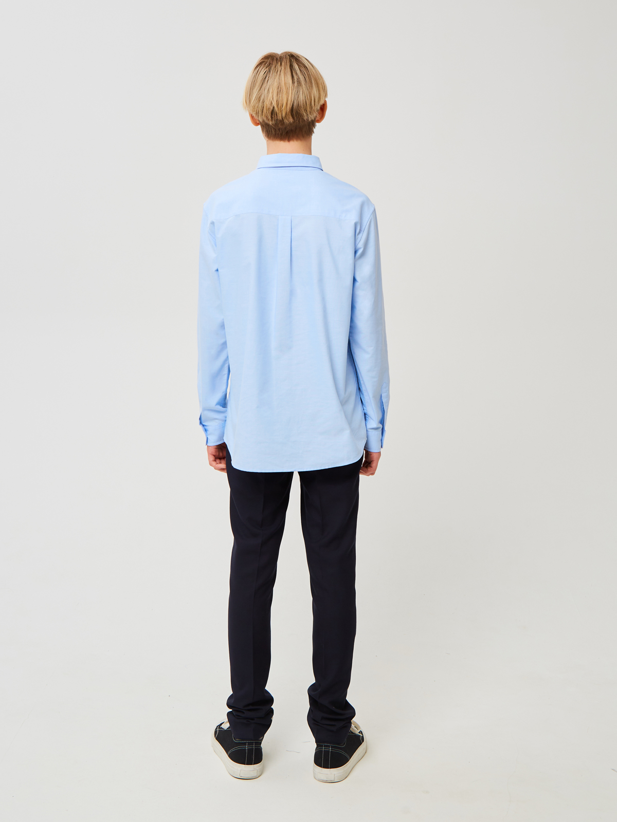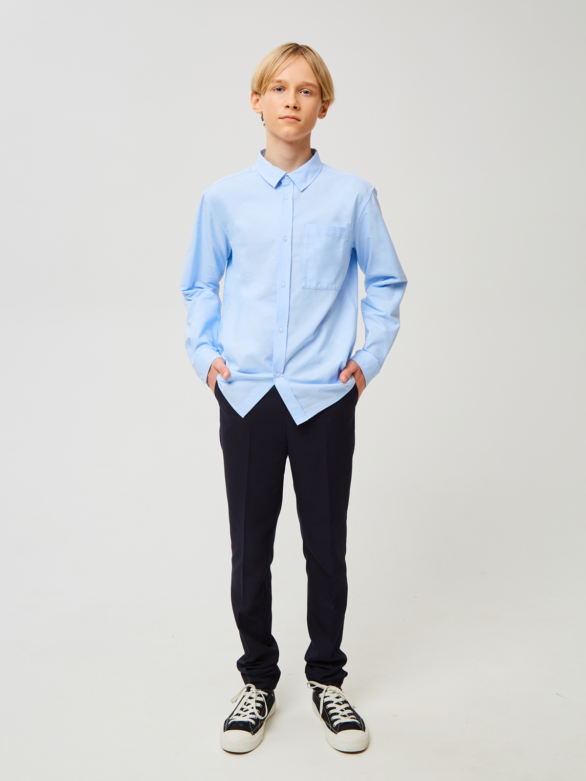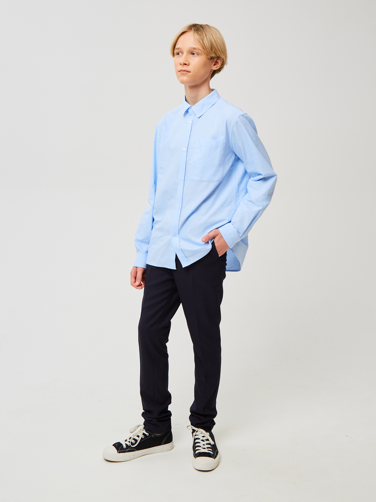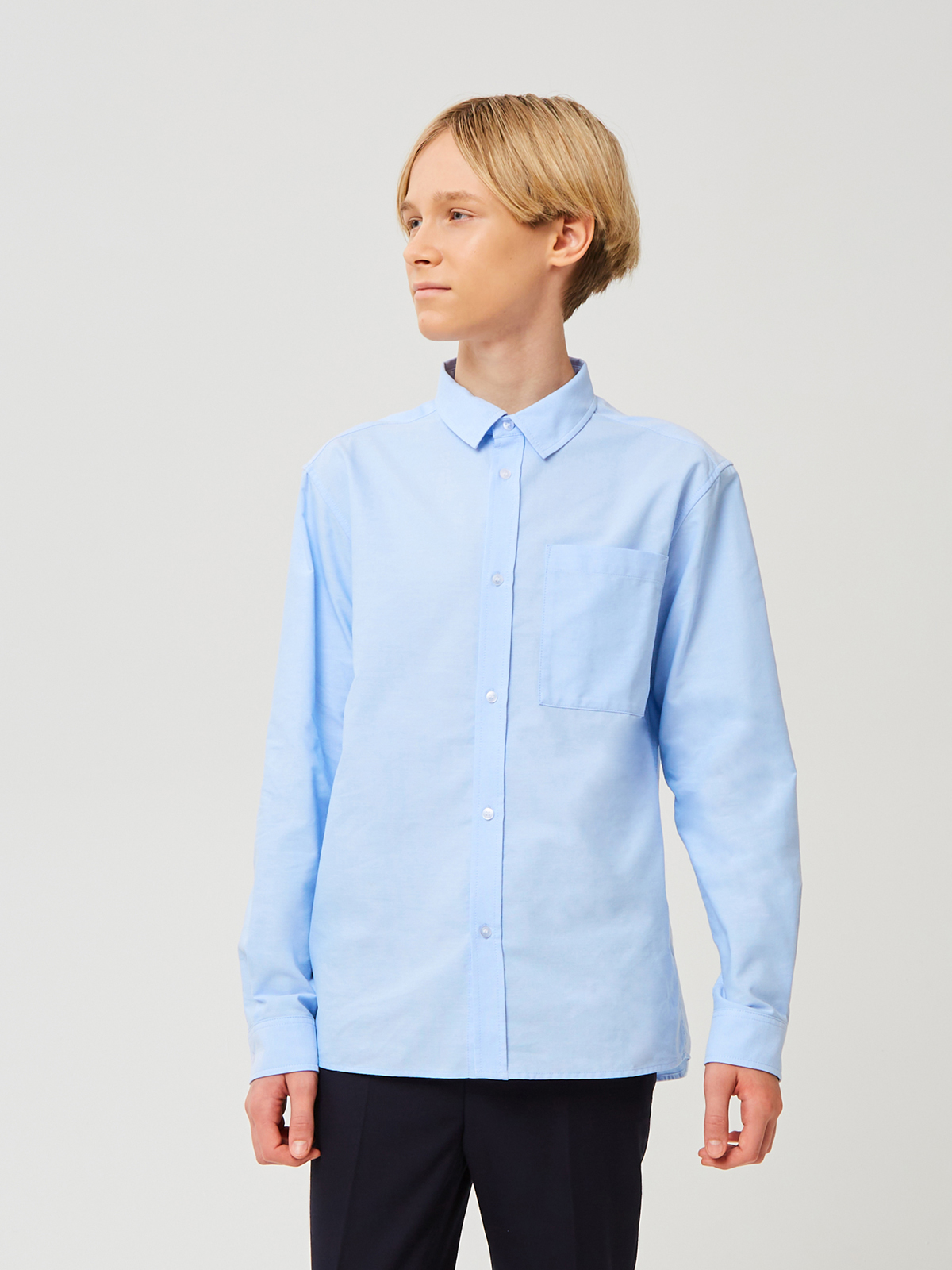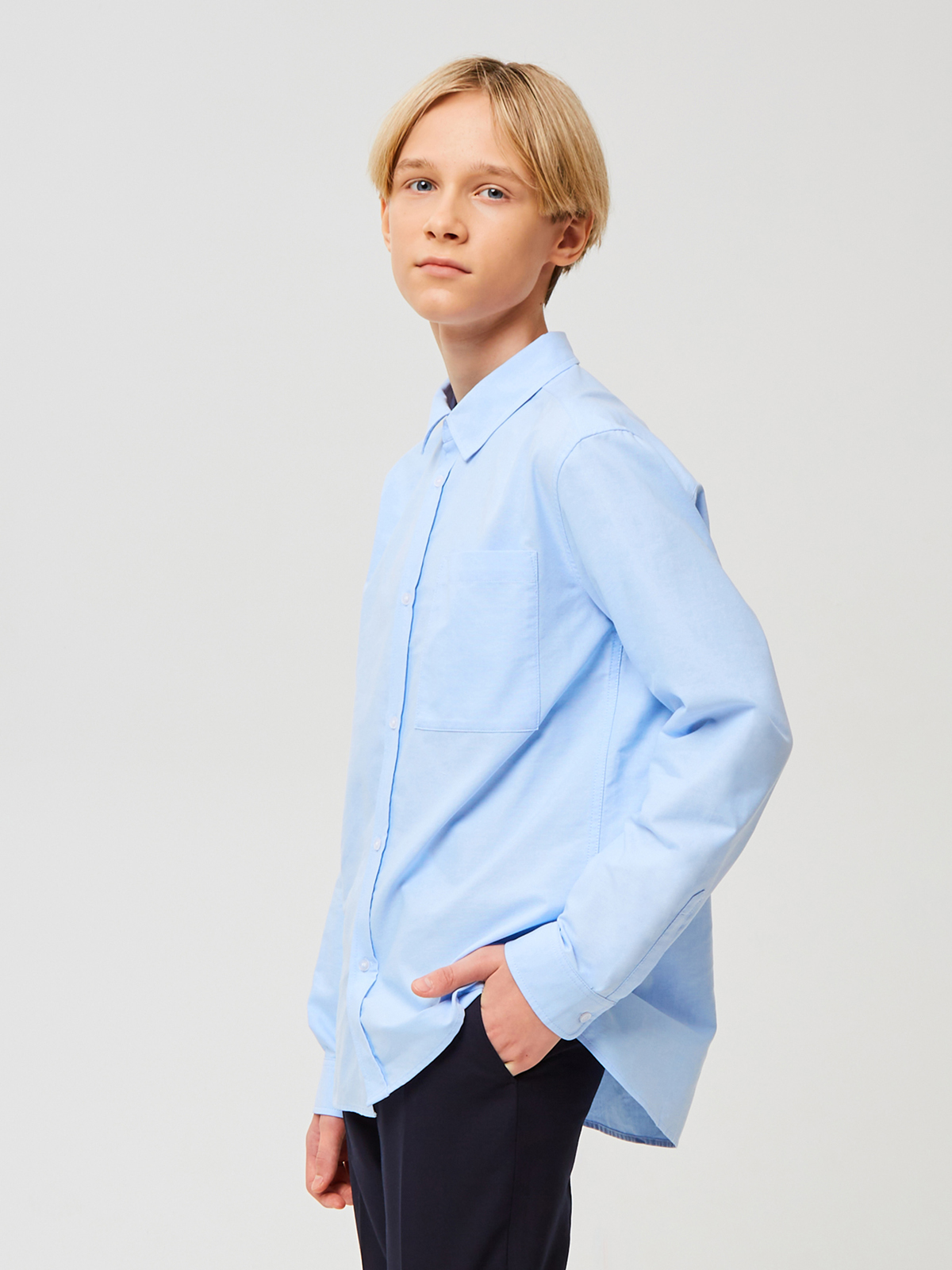 Сорочка для мальчика из смесового хлопка полуприлегающего силуэта. На спинке - кокетка. Воротник отложной со стойкой. Левая сторона полочки дополнена накладным карманом. Застёжка по центру переда на планку с кнопками. Рукава рубашечные со шлицами и манжетами.