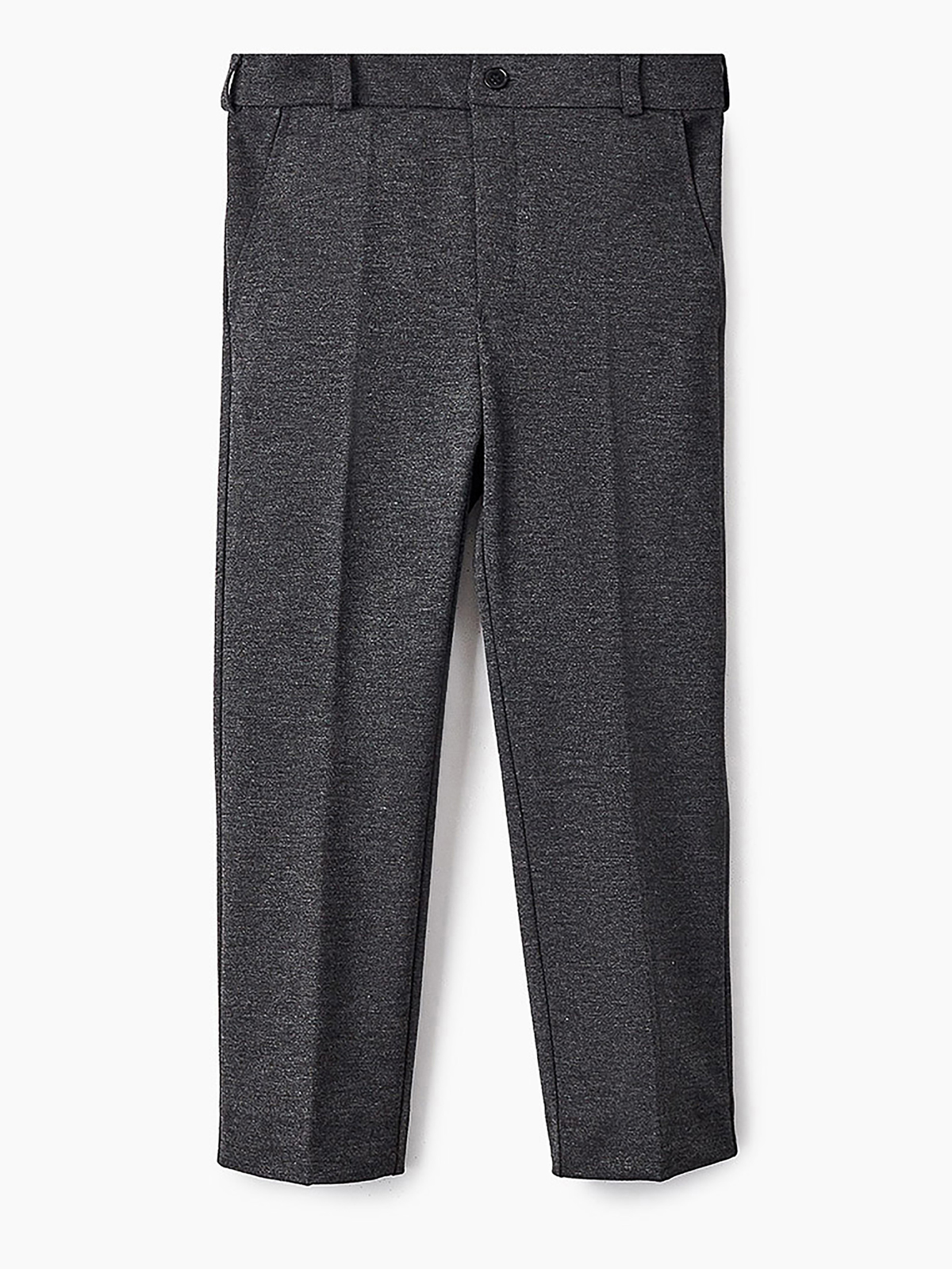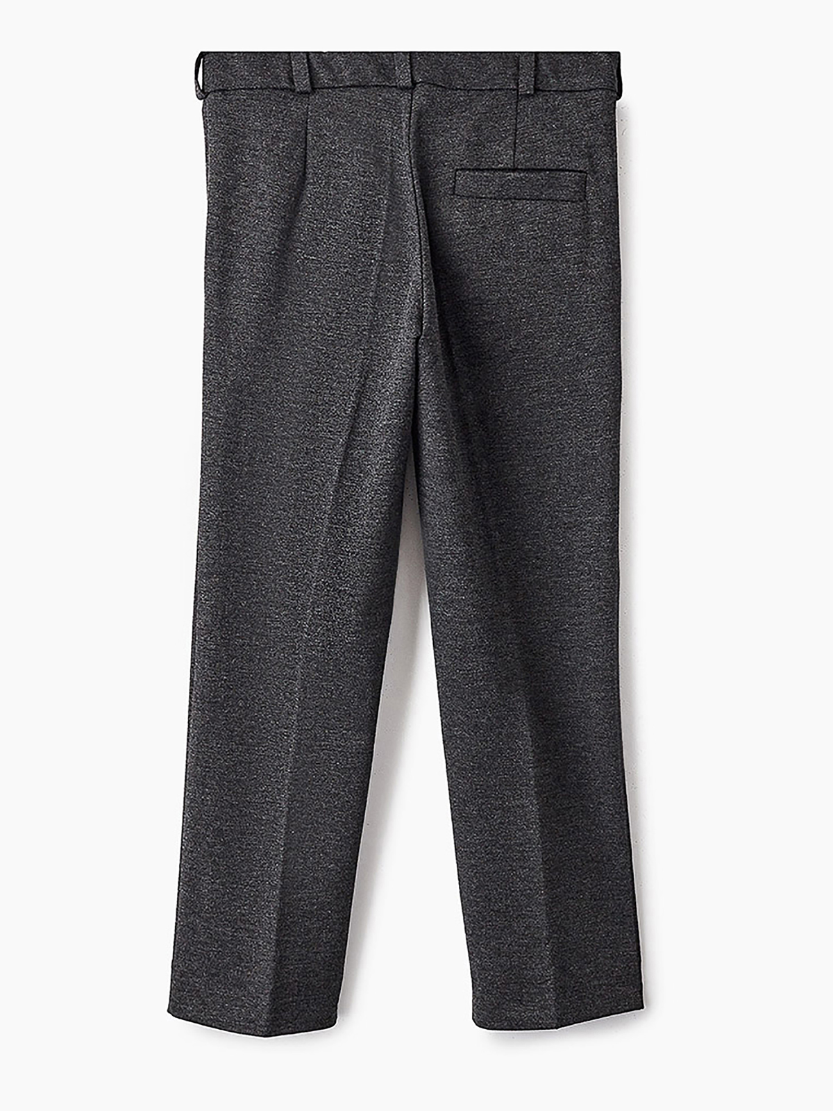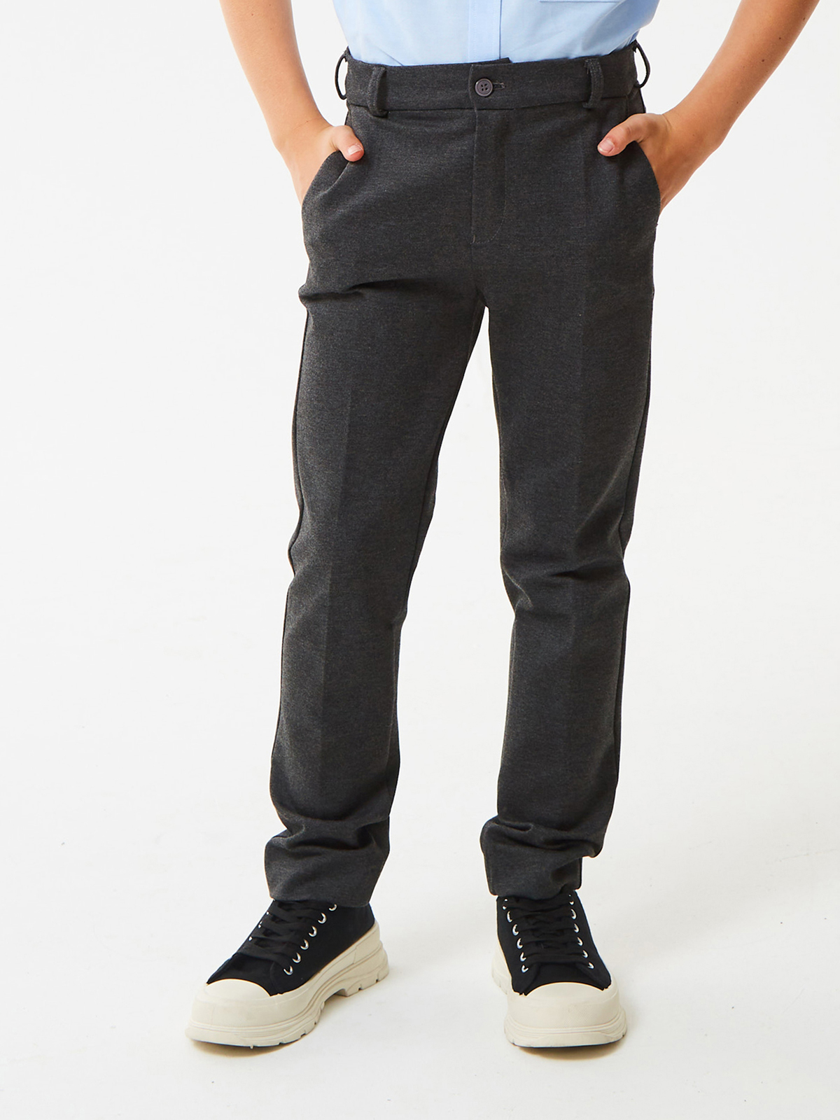 Брюки зауженные из трикотажа джерси для мальчика. Пояс с еврорезинкой сзади. На передней части брюк боковые карманы, горизонтальные защипы и застёжка - гульфик на молнии. На правой задней половинке брюк - карман с узкой листочкой. Отличный вариант на каждый день.