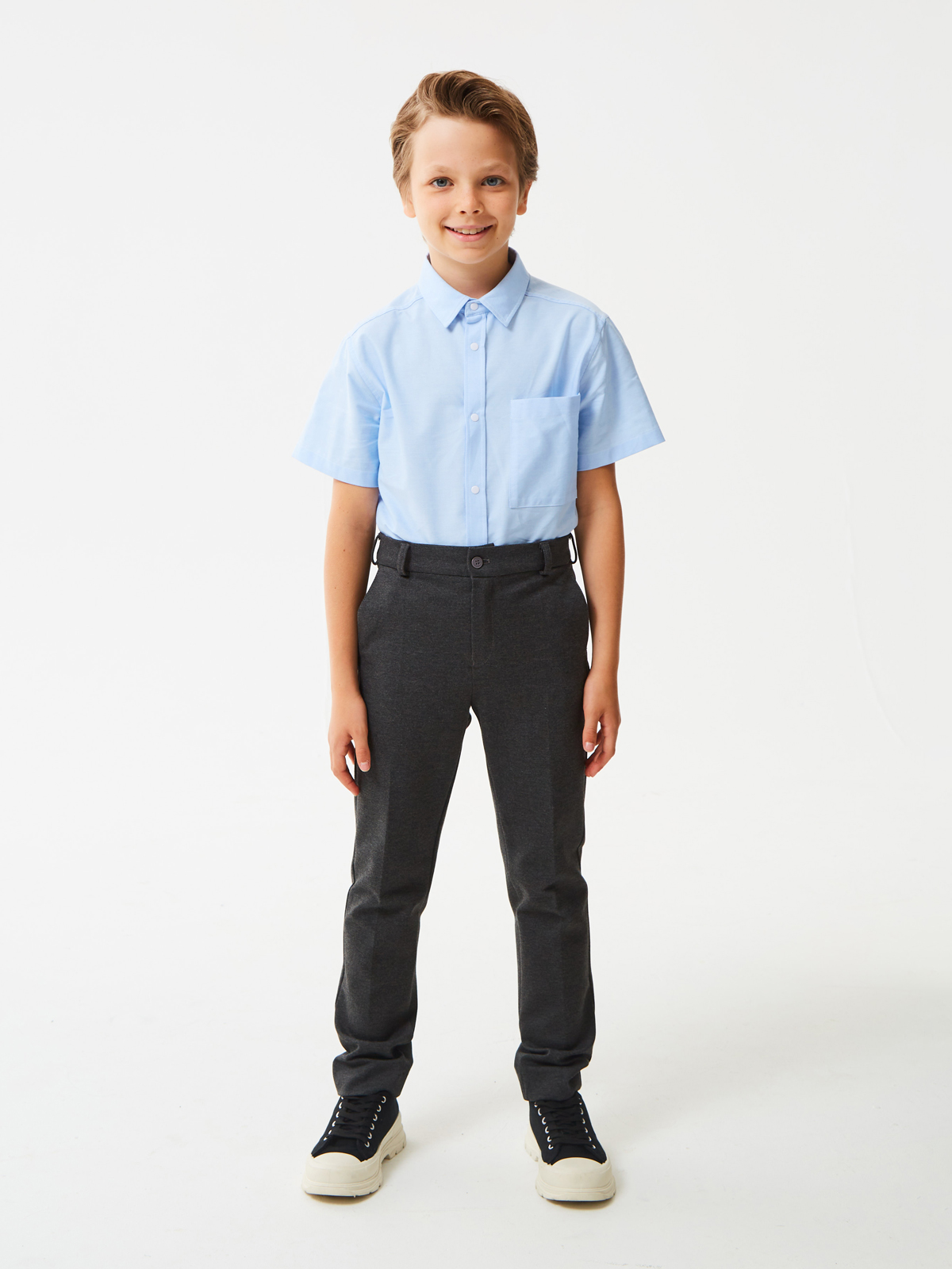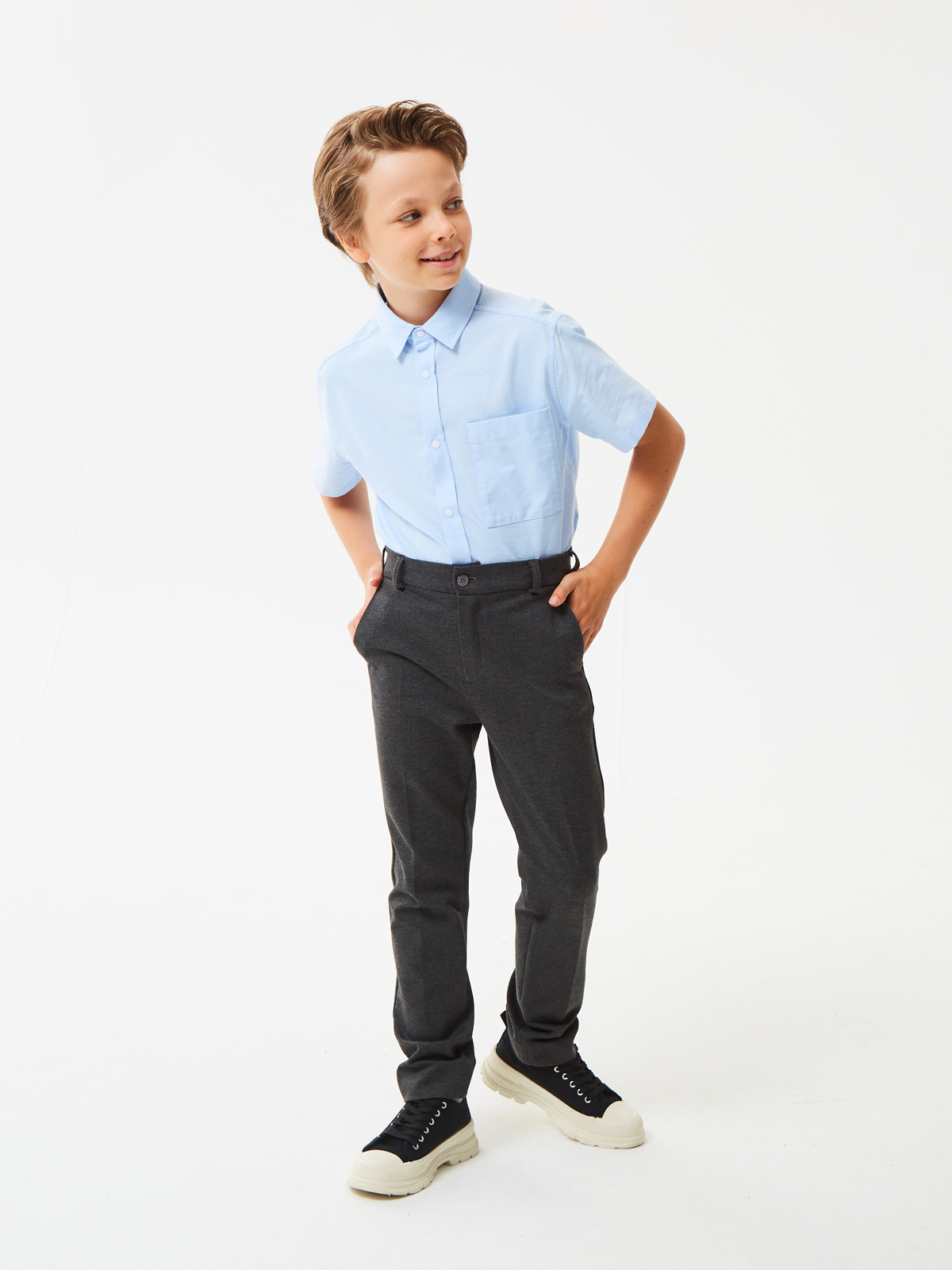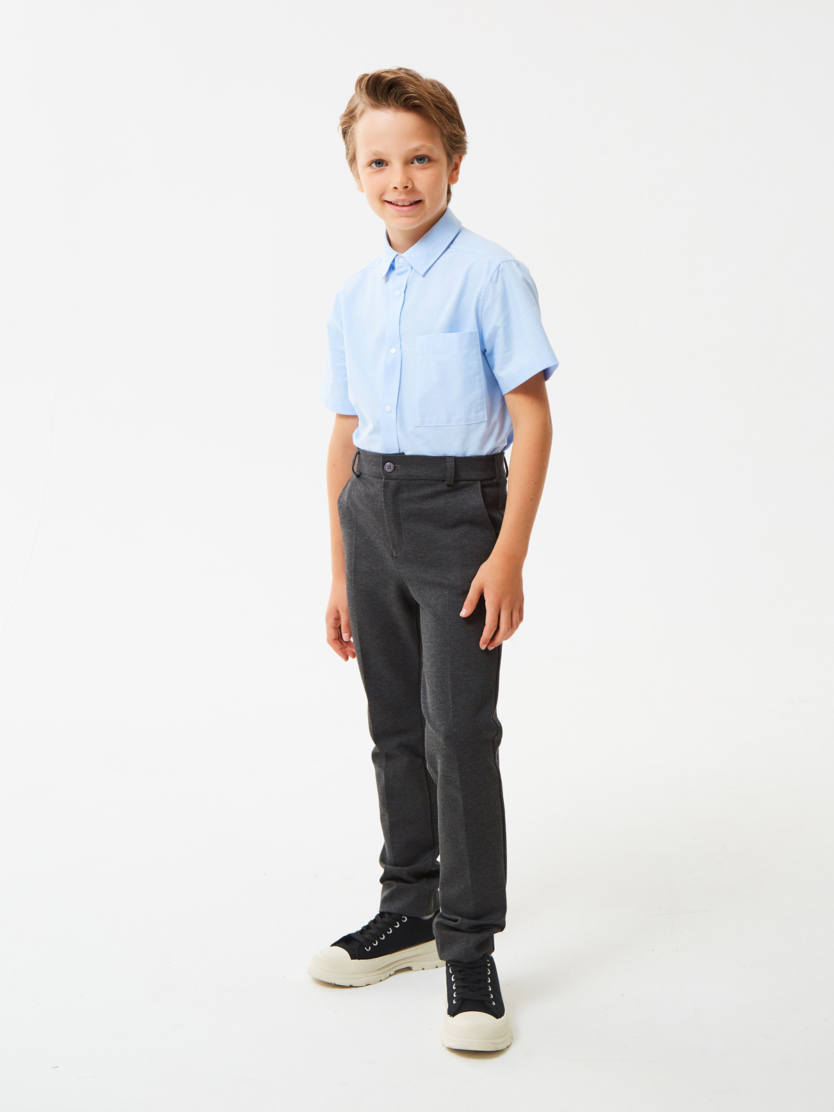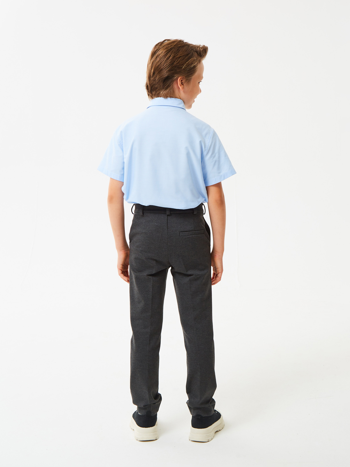 Брюки зауженные из трикотажа джерси для мальчика. Пояс с еврорезинкой сзади. На передней части брюк боковые карманы, горизонтальные защипы и застёжка - гульфик на молнии. На правой задней половинке брюк - карман с узкой листочкой. Отличный вариант на каждый день.