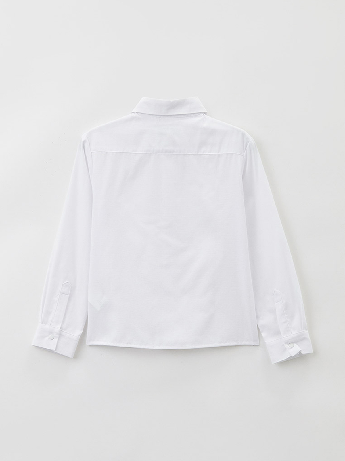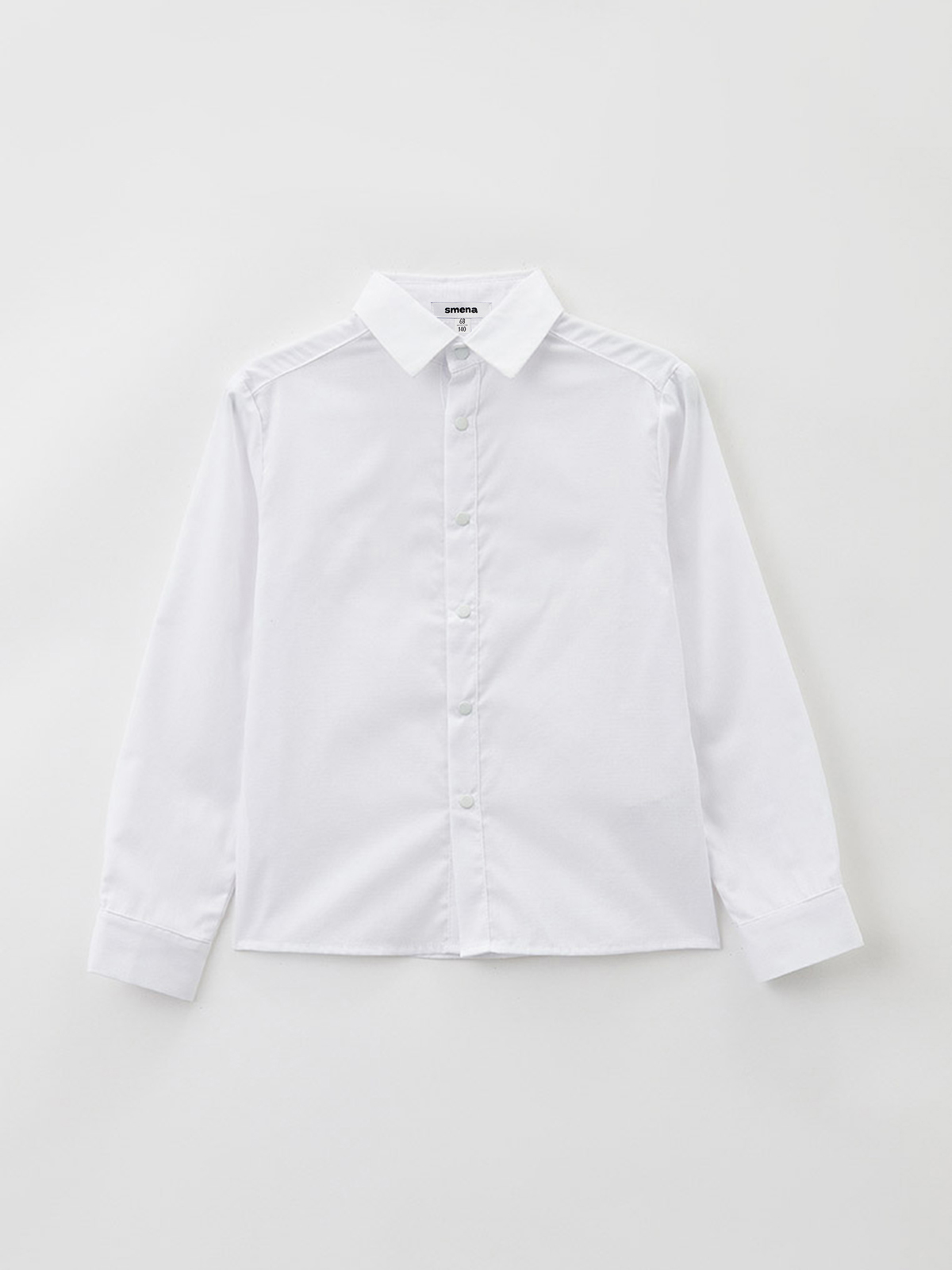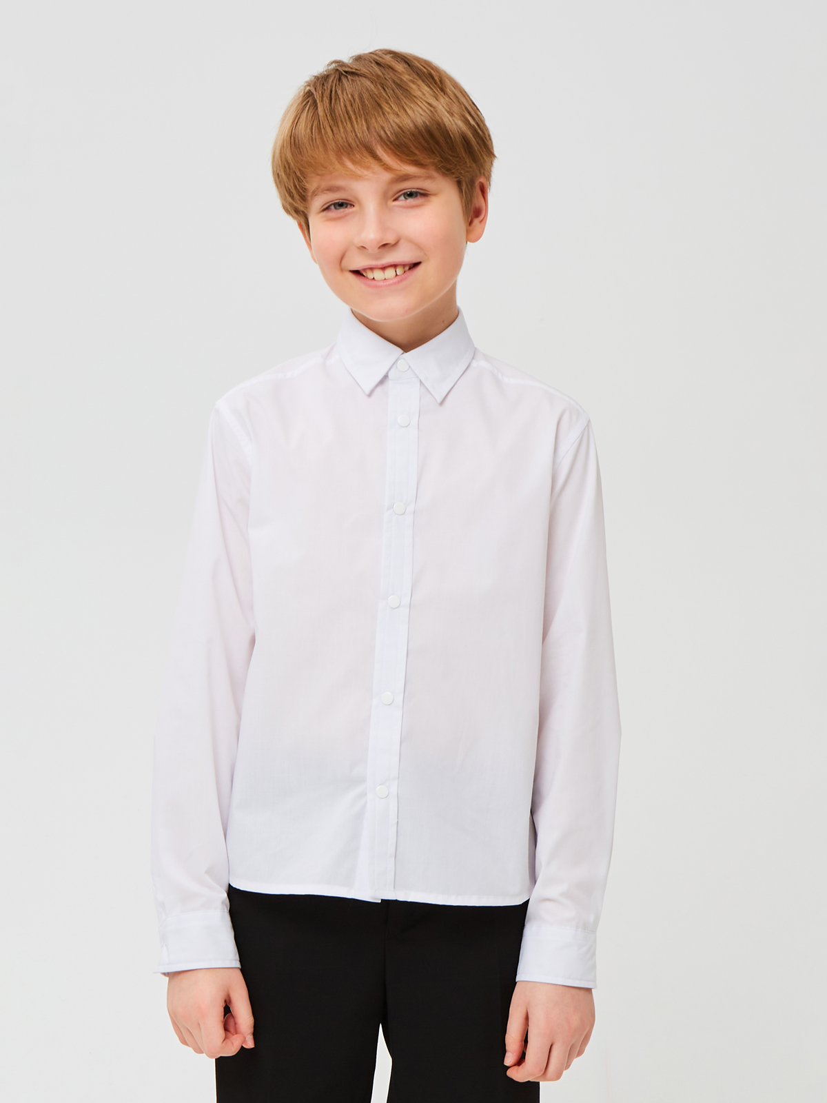 Сорочка для мальчика из смесового хлопка полуприлегающего силуэта. На спинке - кокетка. Воротник отложной со стойкой. Застёжка по центру переда на планку с кнопками. Рукава рубашечные со шлицами и манжетами.