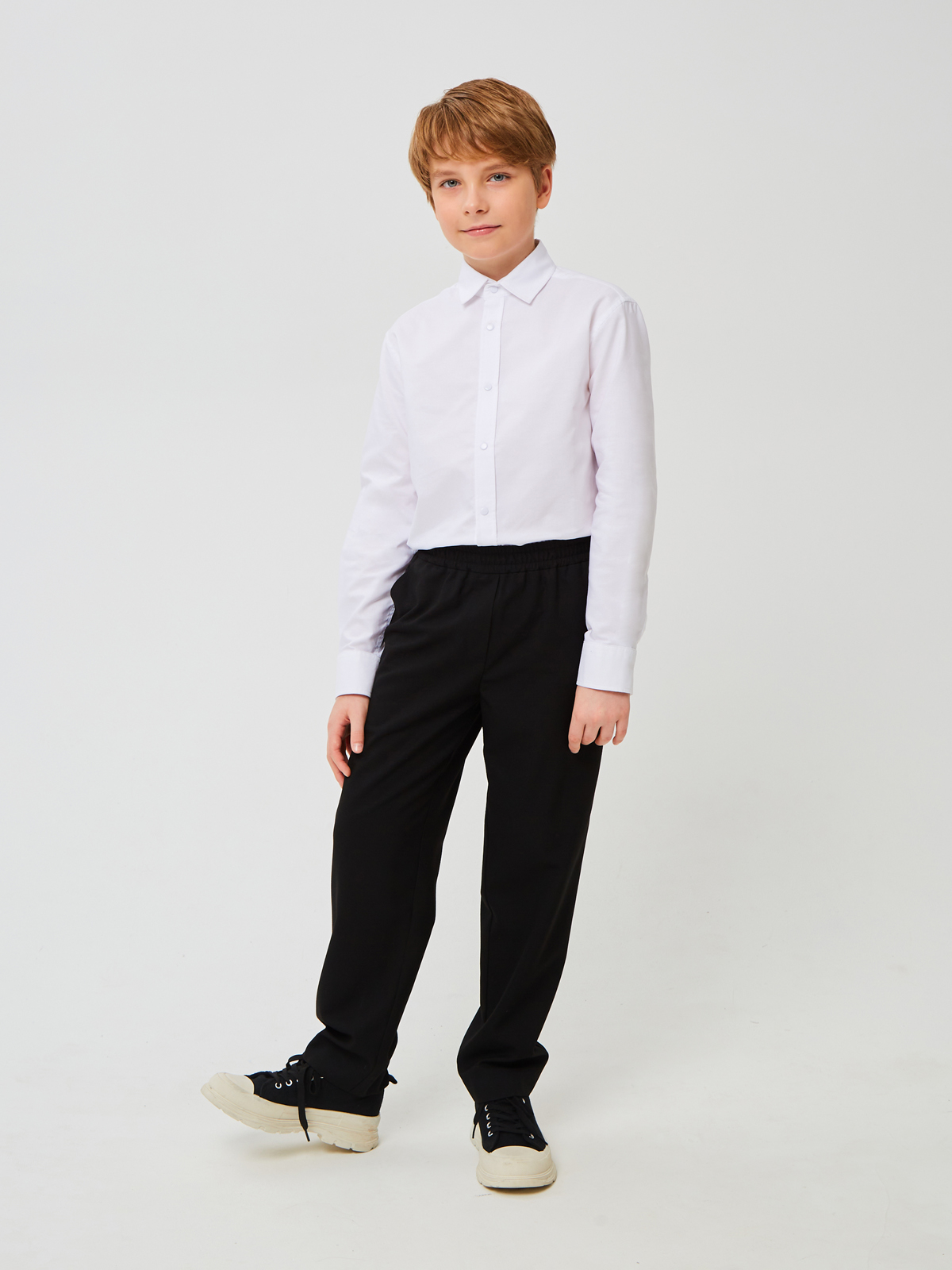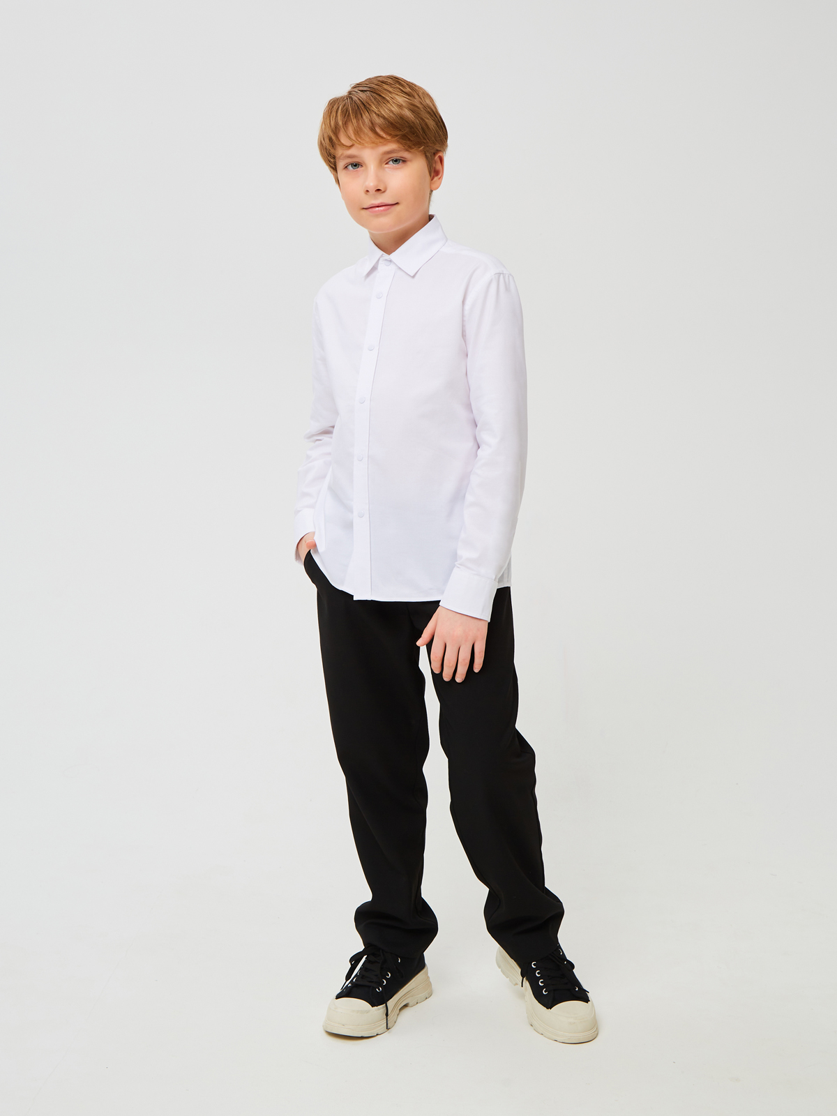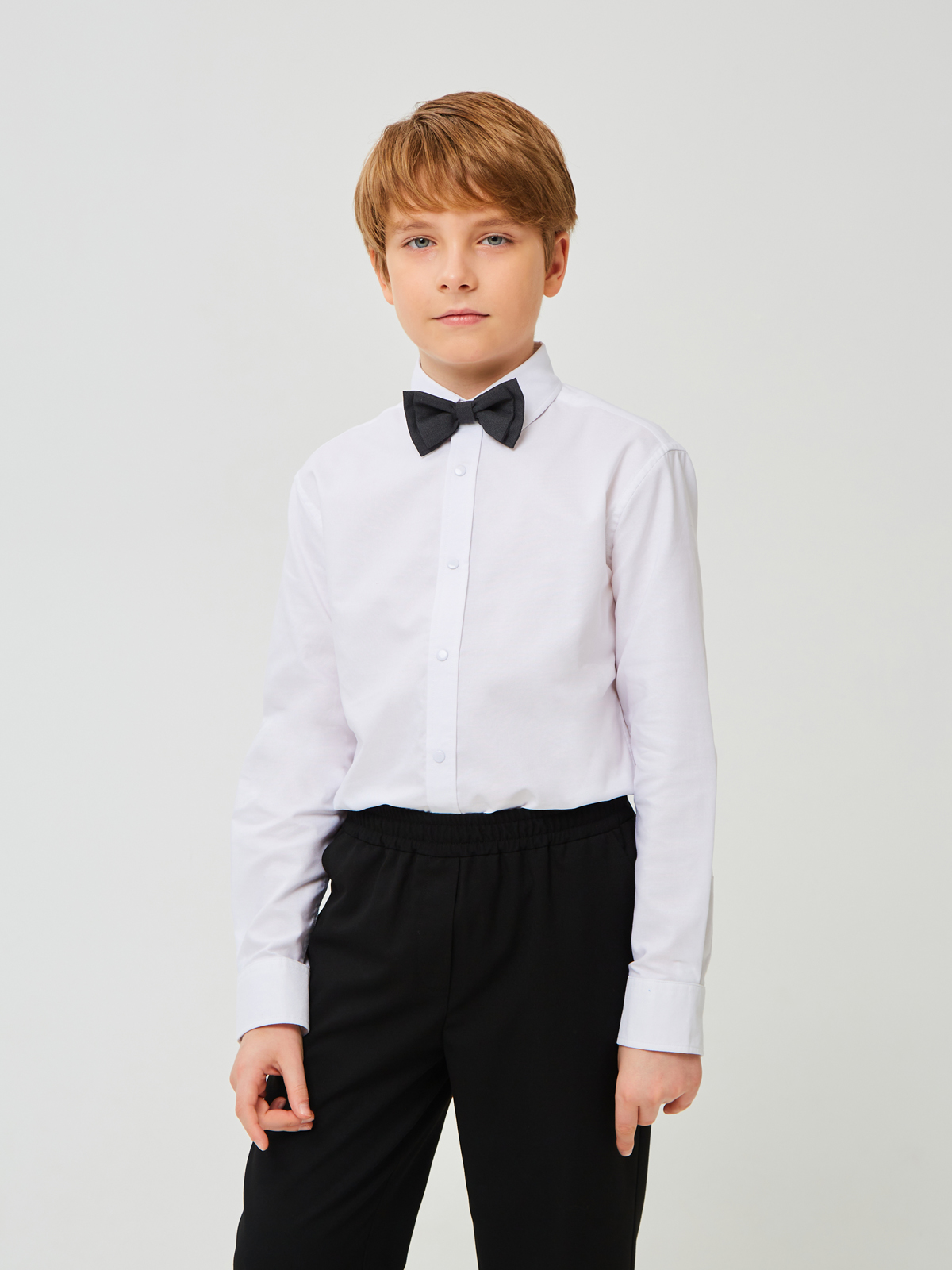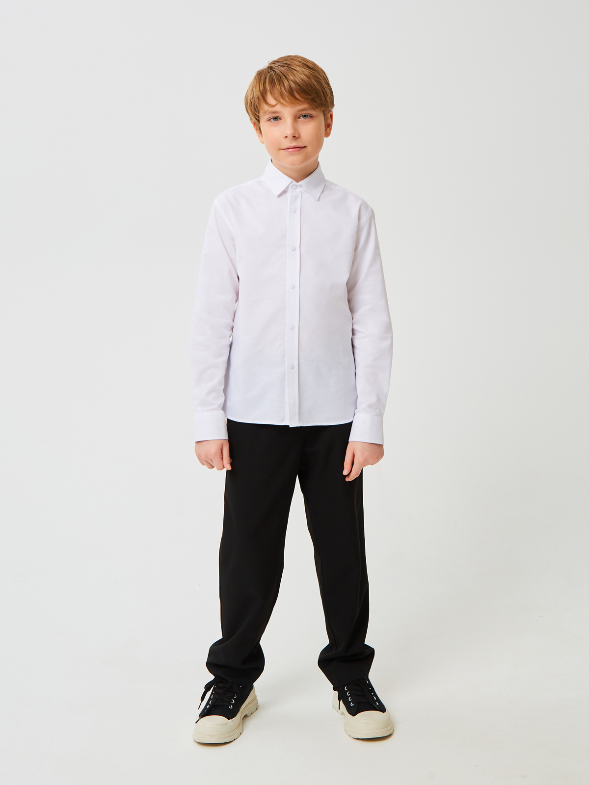 Сорочка для мальчика из смесового хлопка полуприлегающего силуэта. На спинке - кокетка. Воротник отложной со стойкой. Застёжка по центру переда на планку с кнопками. Рукава рубашечные со шлицами и манжетами.