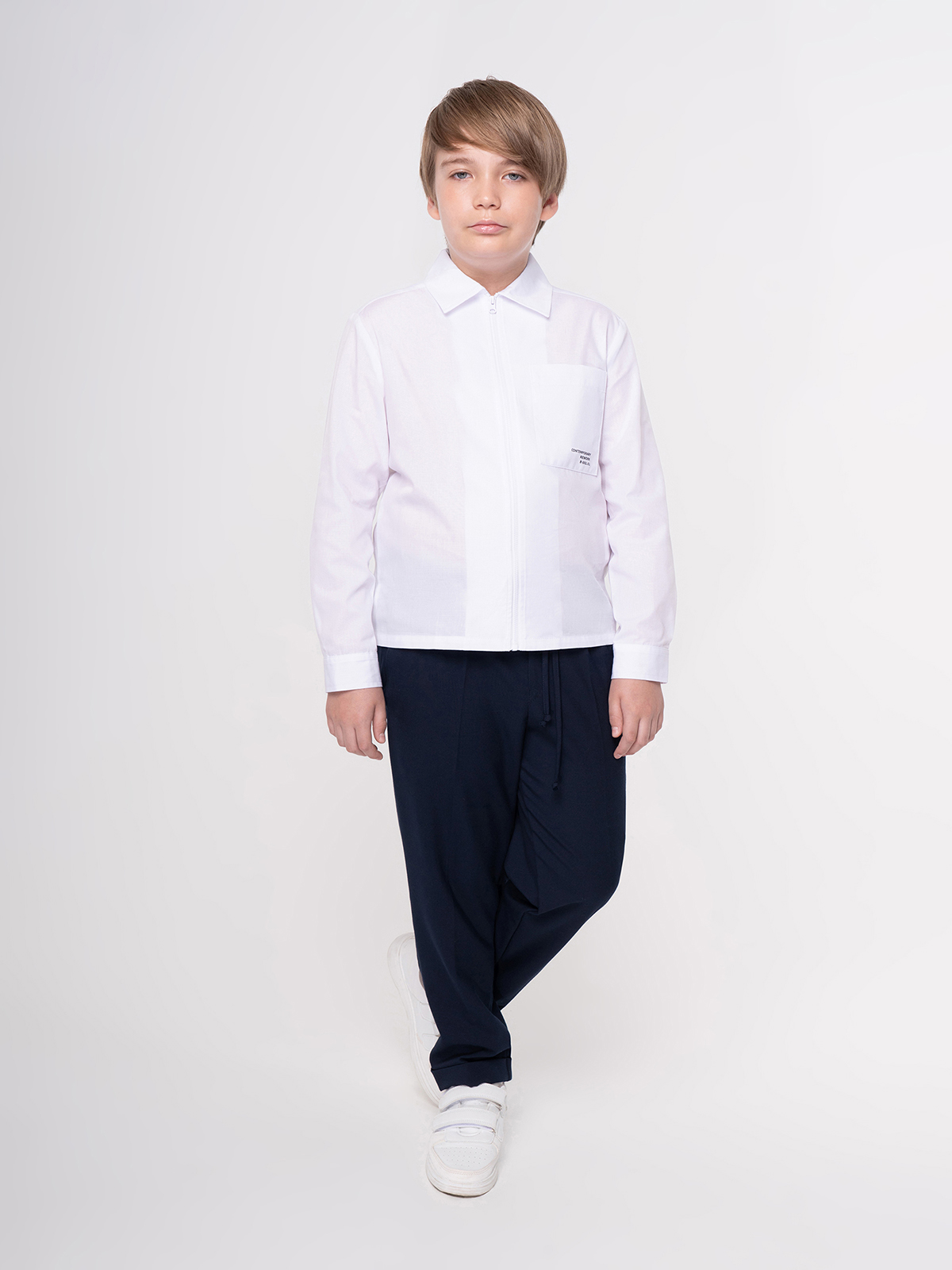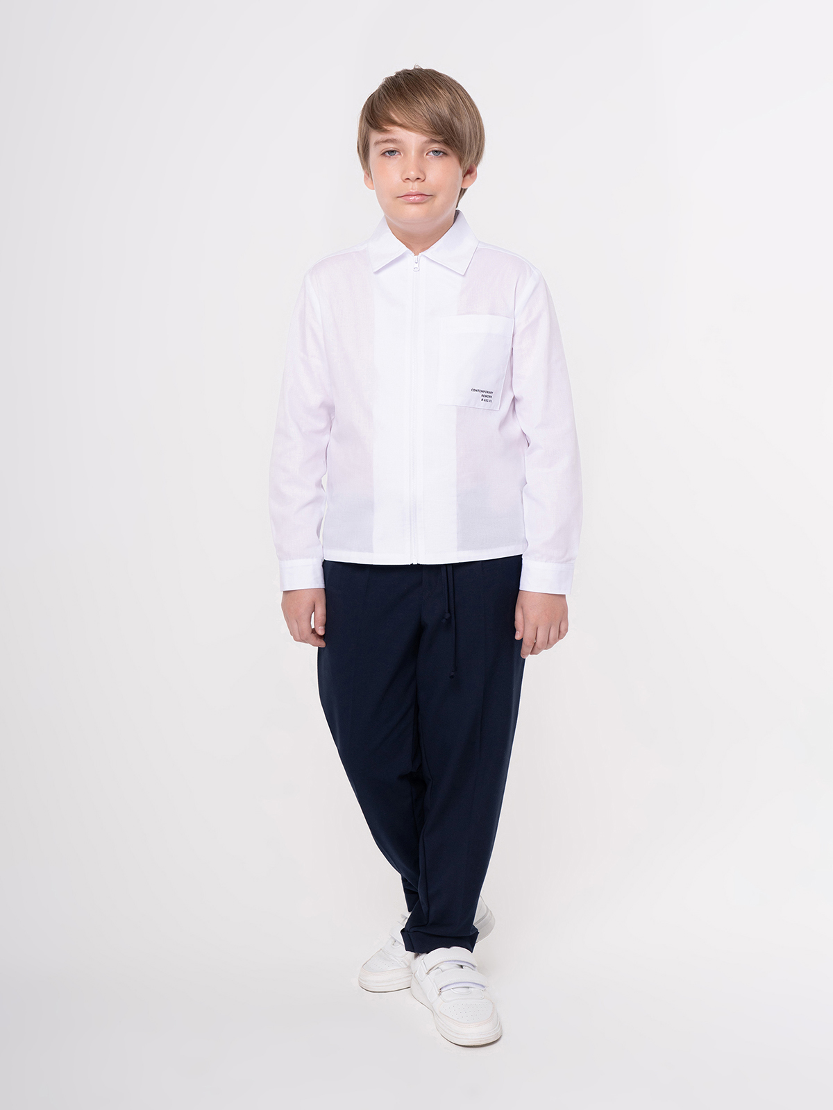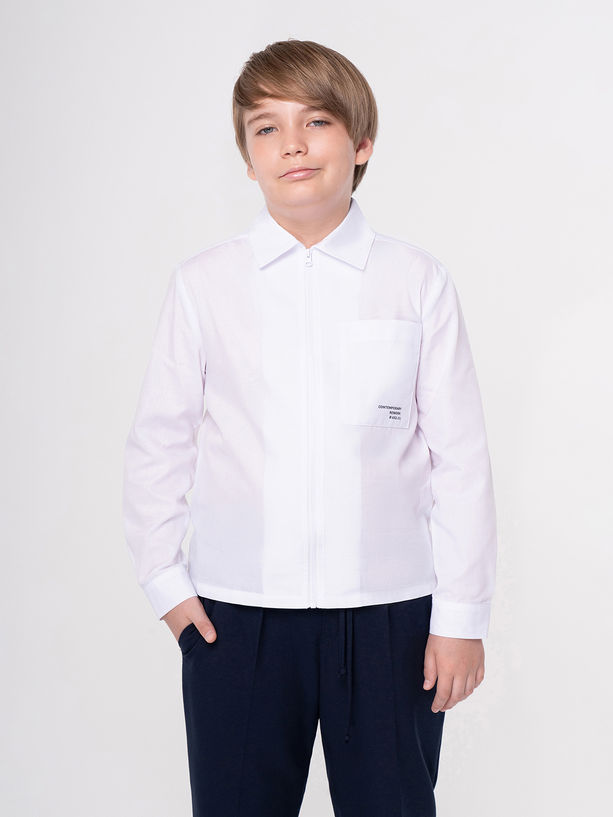 Сорочка для мальчика из смесового хлопка полуприлегающего силуэта. На спинке - кокетка. Воротник отложной со стойкой. Левая сторона полочки дополнена накладным карманом. Карман вверху декорирован принтом. Застёжка по центру переда на молнию. Рукава рубашечные со шлицами и манжетами.