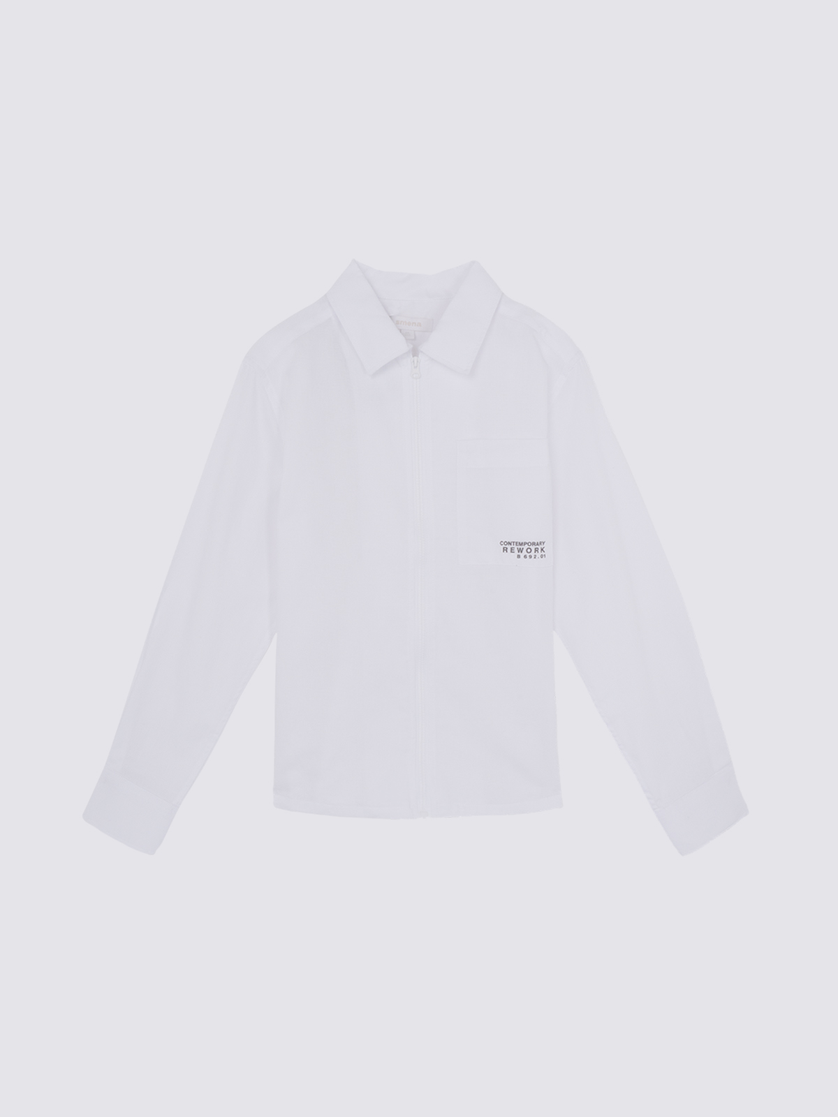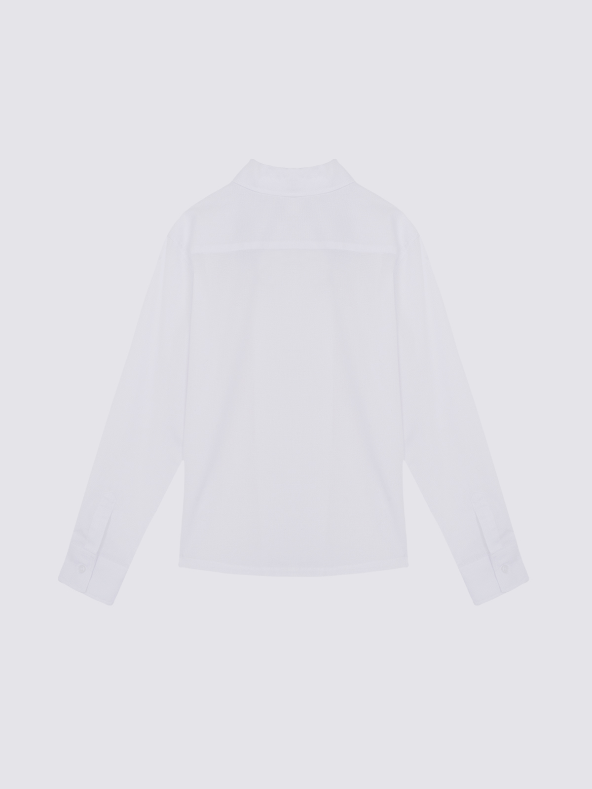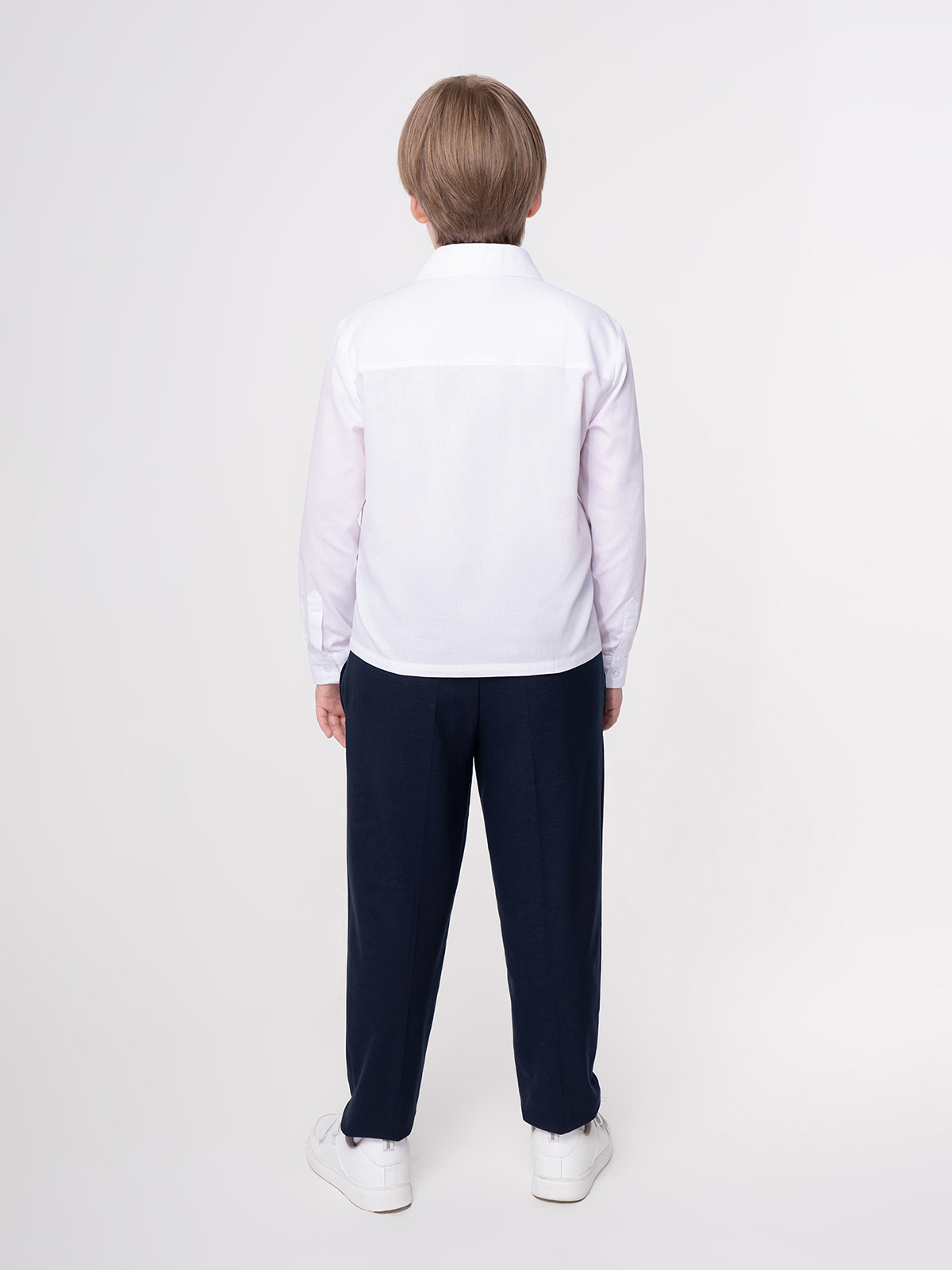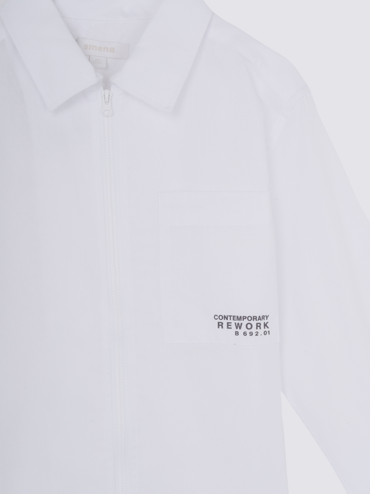 Сорочка для мальчика из смесового хлопка полуприлегающего силуэта. На спинке - кокетка. Воротник отложной со стойкой. Левая сторона полочки дополнена накладным карманом. Карман вверху декорирован принтом. Застёжка по центру переда на молнию. Рукава рубашечные со шлицами и манжетами.